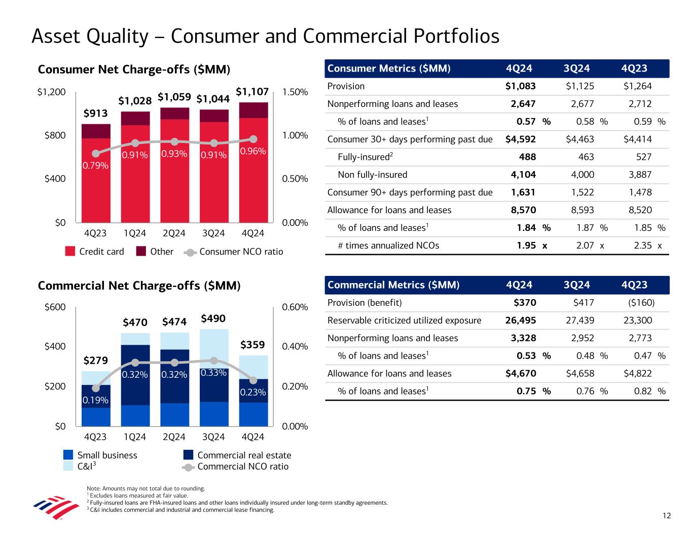 Asset Quality 1 Excludes loans measured at fair value. 2 Allowance for loan and lease losses ratio is calculated as allowance for loan and lease losses divided by loans and leases outstanding at the end of the period. Provision for Credit Losses ($MM) Net Charge-offs ($MM)1 $1,104 $1,319 $1,508 $1,542 $1,452 4Q23 1Q24 2Q24 3Q24 4Q24 $0 $400 $800 $1,200 $1,600 $1,192 $1,498 $1,533 $1,534 $1,466 0.45% 0.58% 0.59% 0.58% 0.54% Net charge-offs Net charge-off ratio 4Q23 1Q24 2Q24 3Q24 4Q24 $0 $400 $800 $1,200 $1,600 0.00% 0.25% 0.50% 0.75% 1.00% 11 • Total net charge-offs of $1.5B decreased $68MM from 3Q241 – Consumer net charge-offs of $1.1B increased $63MM, driven primarily by seasonally higher credit card losses ▪ Credit card loss rate of 3.79% in 4Q24 vs. 3.70% in 3Q24 – Commercial net charge-offs of $359MM decreased $131MM, driven by lower commercial and industrial and commercial real estate losses – Net charge-off ratio of 0.54% decreased 4 bps from 3Q24 • Provision for credit losses of $1.5B decreased $90MM vs. 3Q24 – Net reserve release of $14MM in 4Q24 vs. net reserve build of $8MM in 3Q24 • Allowance for loan and lease losses of $13.2B represented 1.21% of total loans and leases1,2 – Total allowance of $14.3B included $1.1B for unfunded commitments • Nonperforming loans (NPLs) of $6.0B increased $0.3B from 3Q24 • Commercial reservable criticized utilized exposure of $26.5B decreased $0.9B from 3Q24