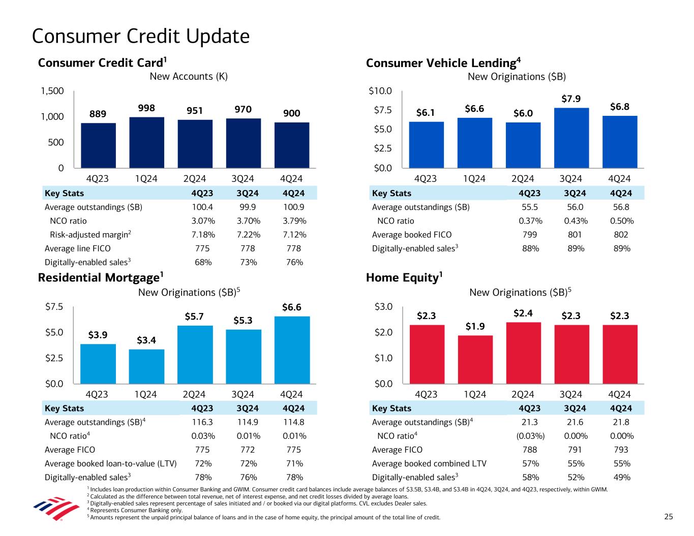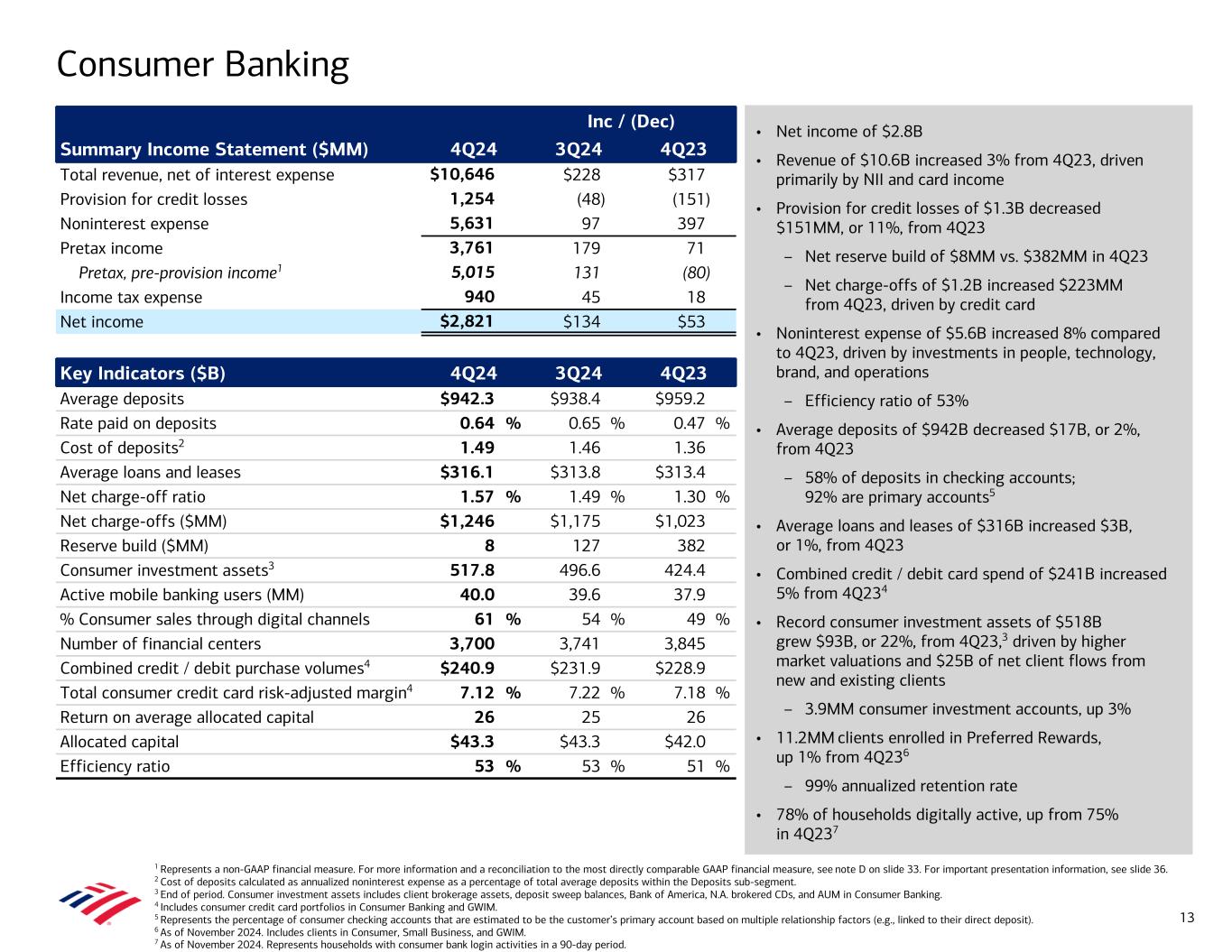 • Net income of $2.8B • Revenue of $10.6B increased 3% from 4Q23, driven primarily by NII and card income • Provision for credit losses of $1.3B decreased $151MM, or 11%, from 4Q23 – Net reserve build of $8MM vs. $382MM in 4Q23 – Net charge-offs of $1.2B increased $223MM from 4Q23, driven by credit card • Noninterest expense of $5.6B increased 8% compared to 4Q23, driven by investments in people, technology, brand, and operations – Efficiency ratio of 53% • Average deposits of $942B decreased $17B, or 2%, from 4Q23 – 58% of deposits in checking accounts; 92% are primary accounts5 • Average loans and leases of $316B increased $3B, or 1%, from 4Q23 • Combined credit / debit card spend of $241B increased 5% from 4Q234 • Record consumer investment assets of $518B grew $93B, or 22%, from 4Q23,3 driven by higher market valuations and $25B of net client flows from new and existing clients – 3.9MM consumer investment accounts, up 3% • 11.2MM clients enrolled in Preferred Rewards, up 1% from 4Q236 – 99% annualized retention rate • 78% of households digitally active, up from 75% in 4Q237 Consumer Banking 1 Represents a non-GAAP financial measure. For more information and a reconciliation to the most directly comparable GAAP financial measure, see note D on slide 33. For important presentation information, see slide 36. 2 Cost of deposits calculated as annualized noninterest expense as a percentage of total average deposits within the Deposits sub-segment. 3 End of period. Consumer investment assets includes client brokerage assets, deposit sweep balances, Bank of America, N.A. brokered CDs, and AUM in Consumer Banking. 4 Includes consumer credit card portfolios in Consumer Banking and GWIM. 5 Represents the percentage of consumer checking accounts that are estimated to be the customer’s primary account based on multiple relationship factors (e.g., linked to their direct deposit). 6 As of November 2024. Includes clients in Consumer, Small Business, and GWIM. 7 As of November 2024. Represents households with consumer bank login activities in a 90-day period. Inc / (Dec) Summary Income Statement ($MM) 4Q24 3Q24 4Q23 Total revenue, net of interest expense $10,646 $228 $317 Provision for credit losses 1,254 (48) (151) Noninterest expense 5,631 97 397 Pretax income 3,761 179 71 Pretax, pre-provision income1 5,015 131 (80) Income tax expense 940 45 18 Net income $2,821 $134 $53 Key Indicators ($B) 4Q24 3Q24 4Q23 Average deposits $942.3 $938.4 $959.2 Rate paid on deposits 0.64 % 0.65 % 0.47 % Cost of deposits2 1.49 1.46 1.36 Average loans and leases $316.1 $313.8 $313.4 Net charge-off ratio 1.57 % 1.49 % 1.30 % Net charge-offs ($MM) $1,246 $1,175 $1,023 Reserve build ($MM) 8 127 382 Consumer investment assets3 517.8 496.6 424.4 Active mobile banking users (MM) 40.0 39.6 37.9 % Consumer sales through digital channels 61 % 54 % 49 % Number of financial centers 3,700 3,741 3,845 Combined credit / debit purchase volumes4 $240.9 $231.9 $228.9 Total consumer credit card risk-adjusted margin4 7.12 % 7.22 % 7.18 % Return on average allocated capital 26 25 26 Allocated capital $43.3 $43.3 $42.0 Efficiency ratio 53 % 53 % 51 % 13
