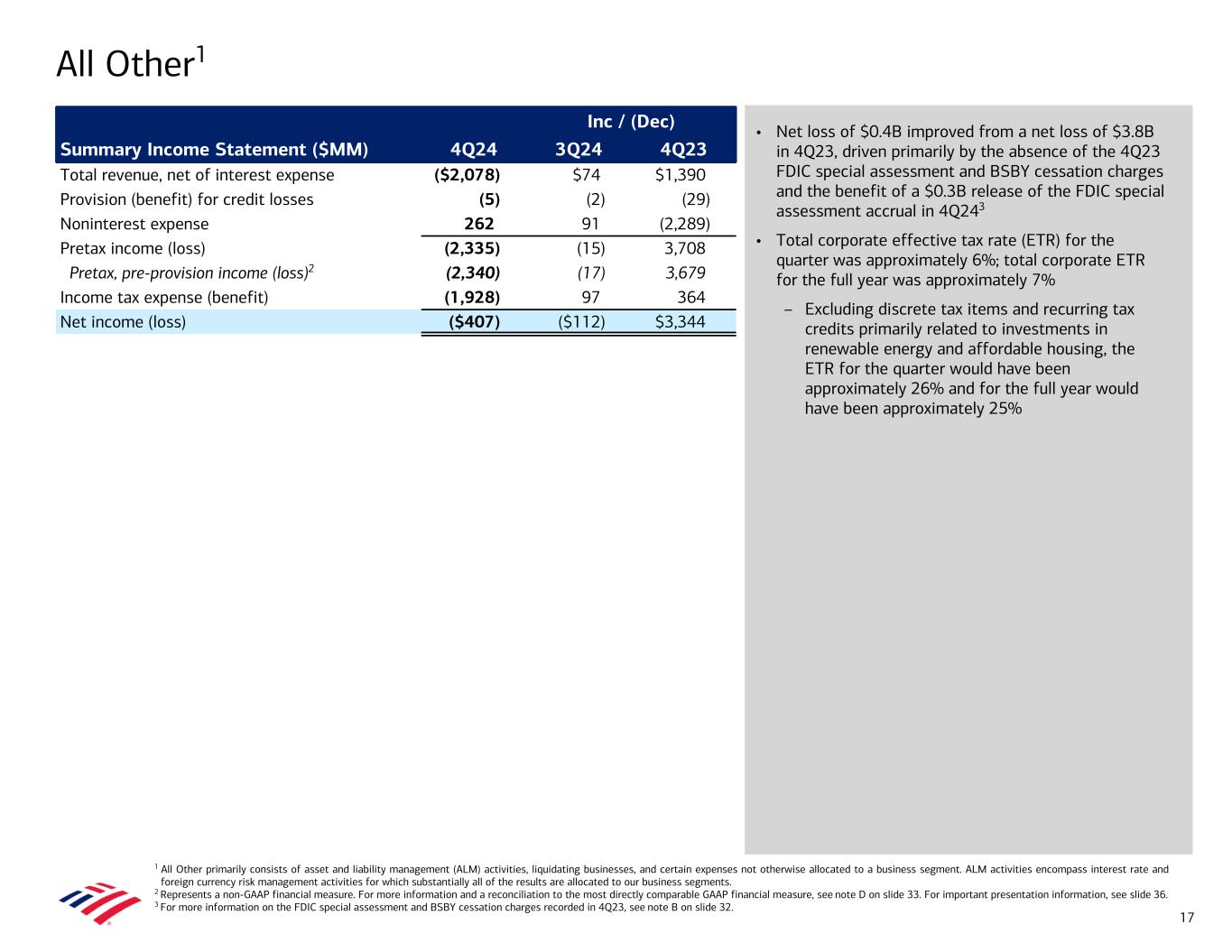 • Net loss of $0.4B improved from a net loss of $3.8B in 4Q23, driven primarily by the absence of the 4Q23 FDIC special assessment and BSBY cessation charges and the benefit of a $0.3B release of the FDIC special assessment accrual in 4Q243 • Total corporate effective tax rate (ETR) for the quarter was approximately 6%; total corporate ETR for the full year was approximately 7% – Excluding discrete tax items and recurring tax credits primarily related to investments in renewable energy and affordable housing, the ETR for the quarter would have been approximately 26% and for the full year would have been approximately 25% All Other1 1 All Other primarily consists of asset and liability management (ALM) activities, liquidating businesses, and certain expenses not otherwise allocated to a business segment. ALM activities encompass interest rate and foreign currency risk management activities for which substantially all of the results are allocated to our business segments. 2 Represents a non-GAAP financial measure. For more information and a reconciliation to the most directly comparable GAAP financial measure, see note D on slide 33. For important presentation information, see slide 36. 3 For more information on the FDIC special assessment and BSBY cessation charges recorded in 4Q23, see note B on slide 32. Inc / (Dec) Summary Income Statement ($MM) 4Q24 3Q24 4Q23 Total revenue, net of interest expense ($2,078) $74 $1,390 Provision (benefit) for credit losses (5) (2) (29) Noninterest expense 262 91 (2,289) Pretax income (loss) (2,335) (15) 3,708 Pretax, pre-provision income (loss)2 (2,340) (17) 3,679 Income tax expense (benefit) (1,928) 97 364 Net income (loss) ($407) ($112) $3,344 17