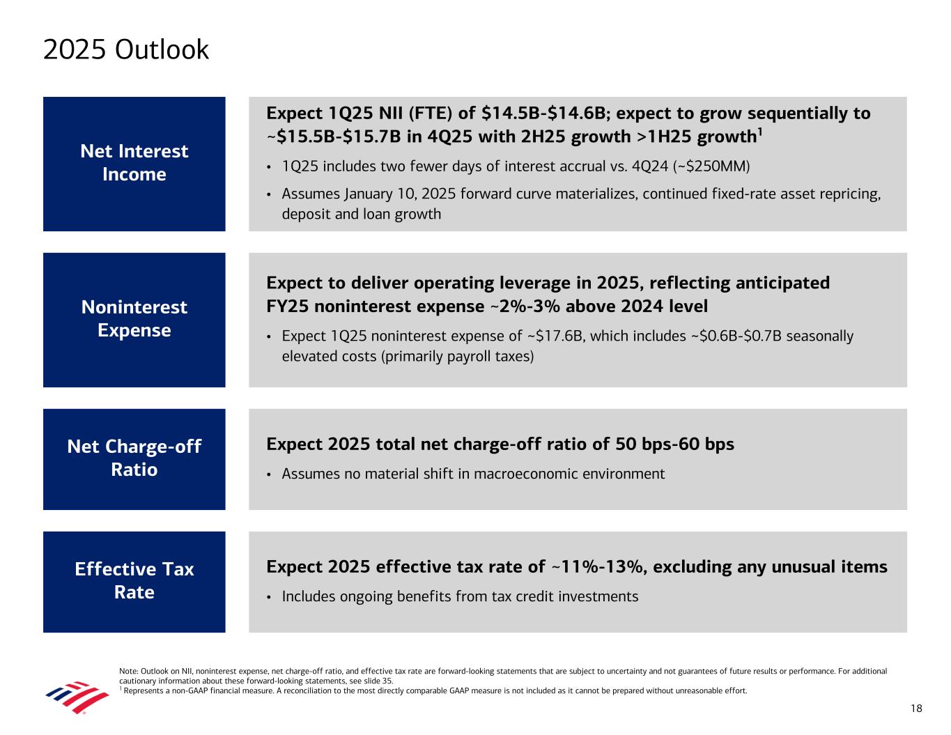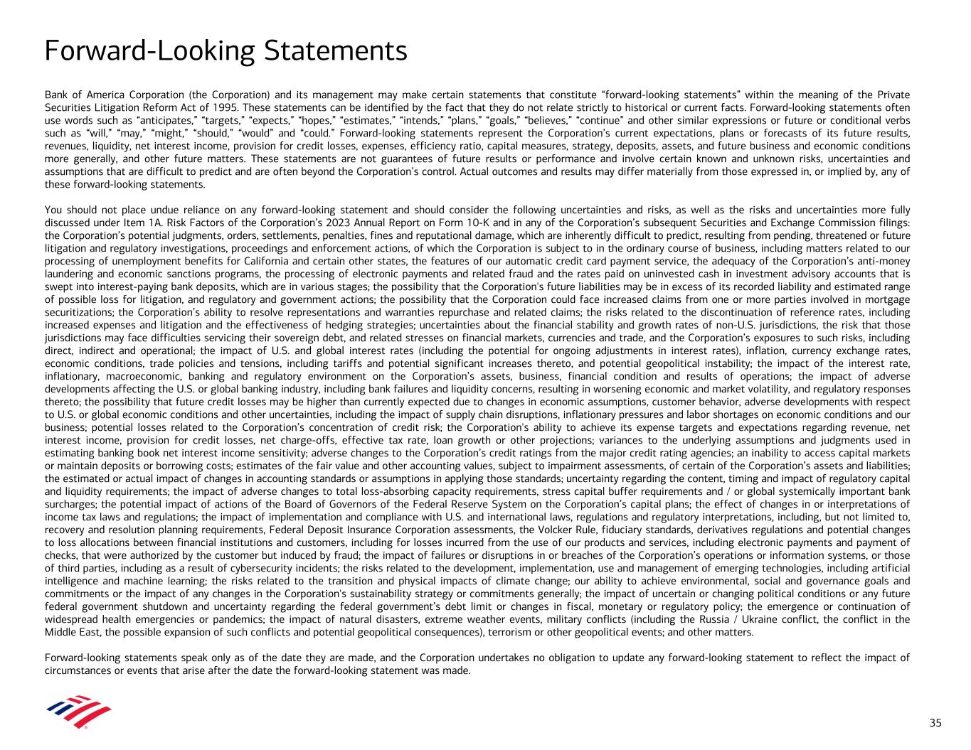 Forward-Looking Statements Bank of America Corporation (the Corporation) and its management may make certain statements that constitute “forward-looking statements” within the meaning of the Private Securities Litigation Reform Act of 1995. These statements can be identified by the fact that they do not relate strictly to historical or current facts. Forward-looking statements often use words such as “anticipates,” “targets,” “expects,” “hopes,” “estimates,” “intends,” “plans,” “goals,” “believes,” “continue” and other similar expressions or future or conditional verbs such as “will,” “may,” “might,” “should,” “would” and “could.” Forward-looking statements represent the Corporation’s current expectations, plans or forecasts of its future results, revenues, liquidity, net interest income, provision for credit losses, expenses, efficiency ratio, capital measures, strategy, deposits, assets, and future business and economic conditions more generally, and other future matters. These statements are not guarantees of future results or performance and involve certain known and unknown risks, uncertainties and assumptions that are difficult to predict and are often beyond the Corporation’s control. Actual outcomes and results may differ materially from those expressed in, or implied by, any of these forward-looking statements. You should not place undue reliance on any forward-looking statement and should consider the following uncertainties and risks, as well as the risks and uncertainties more fully discussed under Item 1A. Risk Factors of the Corporation’s 2023 Annual Report on Form 10-K and in any of the Corporation’s subsequent Securities and Exchange Commission filings: the Corporation’s potential judgments, orders, settlements, penalties, fines and reputational damage, which are inherently difficult to predict, resulting from pending, threatened or future litigation and regulatory investigations, proceedings and enforcement actions, of which the Corporation is subject to in the ordinary course of business, including matters related to our processing of unemployment benefits for California and certain other states, the features of our automatic credit card payment service, the adequacy of the Corporation’s anti-money laundering and economic sanctions programs, the processing of electronic payments and related fraud and the rates paid on uninvested cash in investment advisory accounts that is swept into interest-paying bank deposits, which are in various stages; the possibility that the Corporation's future liabilities may be in excess of its recorded liability and estimated range of possible loss for litigation, and regulatory and government actions; the possibility that the Corporation could face increased claims from one or more parties involved in mortgage securitizations; the Corporation’s ability to resolve representations and warranties repurchase and related claims; the risks related to the discontinuation of reference rates, including increased expenses and litigation and the effectiveness of hedging strategies; uncertainties about the financial stability and growth rates of non-U.S. jurisdictions, the risk that those jurisdictions may face difficulties servicing their sovereign debt, and related stresses on financial markets, currencies and trade, and the Corporation’s exposures to such risks, including direct, indirect and operational; the impact of U.S. and global interest rates (including the potential for ongoing adjustments in interest rates), inflation, currency exchange rates, economic conditions, trade policies and tensions, including tariffs and potential significant increases thereto, and potential geopolitical instability; the impact of the interest rate, inflationary, macroeconomic, banking and regulatory environment on the Corporation’s assets, business, financial condition and results of operations; the impact of adverse developments affecting the U.S. or global banking industry, including bank failures and liquidity concerns, resulting in worsening economic and market volatility, and regulatory responses thereto; the possibility that future credit losses may be higher than currently expected due to changes in economic assumptions, customer behavior, adverse developments with respect to U.S. or global economic conditions and other uncertainties, including the impact of supply chain disruptions, inflationary pressures and labor shortages on economic conditions and our business; potential losses related to the Corporation’s concentration of credit risk; the Corporation's ability to achieve its expense targets and expectations regarding revenue, net interest income, provision for credit losses, net charge-offs, effective tax rate, loan growth or other projections; variances to the underlying assumptions and judgments used in estimating banking book net interest income sensitivity; adverse changes to the Corporation’s credit ratings from the major credit rating agencies; an inability to access capital markets or maintain deposits or borrowing costs; estimates of the fair value and other accounting values, subject to impairment assessments, of certain of the Corporation’s assets and liabilities; the estimated or actual impact of changes in accounting standards or assumptions in applying those standards; uncertainty regarding the content, timing and impact of regulatory capital and liquidity requirements; the impact of adverse changes to total loss-absorbing capacity requirements, stress capital buffer requirements and / or global systemically important bank surcharges; the potential impact of actions of the Board of Governors of the Federal Reserve System on the Corporation’s capital plans; the effect of changes in or interpretations of income tax laws and regulations; the impact of implementation and compliance with U.S. and international laws, regulations and regulatory interp