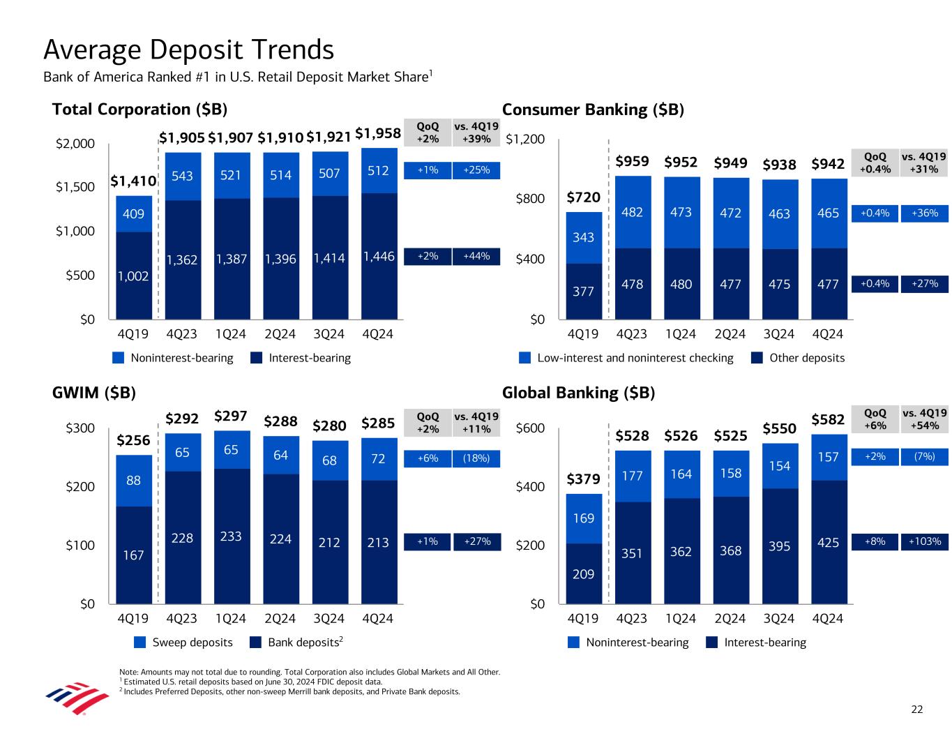 Consumer Banking ($B) GWIM ($B) Global Banking ($B) Total Corporation ($B) Average Deposit Trends Bank of America Ranked #1 in U.S. Retail Deposit Market Share1 Note: Amounts may not total due to rounding. Total Corporation also includes Global Markets and All Other. 1 Estimated U.S. retail deposits based on June 30, 2024 FDIC deposit data. 2 Includes Preferred Deposits, other non-sweep Merrill bank deposits, and Private Bank deposits. $256 $292 $297 $288 $280 $285 167 228 233 224 212 213 88 65 65 64 68 72 Sweep deposits Bank deposits 4Q19 4Q23 1Q24 2Q24 3Q24 4Q24 $0 $100 $200 $300 $1,410 $1,905 $1,907 $1,910 $1,921 $1,958 1,002 1,362 1,387 1,396 1,414 1,446 409 543 521 514 507 512 Noninterest-bearing Interest-bearing 4Q19 4Q23 1Q24 2Q24 3Q24 4Q24 $0 $500 $1,000 $1,500 $2,000 $379 $528 $526 $525 $550 $582 209 351 362 368 395 425 169 177 164 158 154 157 Noninterest-bearing Interest-bearing 4Q19 4Q23 1Q24 2Q24 3Q24 4Q24 $0 $200 $400 $600 +1% +6% +2% +1% QoQ +2% QoQ +2% QoQ +0.4% +8% +2% +0.4% QoQ +6% 22 $720 $959 $952 $949 $938 $942 377 478 480 477 475 477 343 482 473 472 463 465 Low-interest and noninterest checking Other deposits 4Q19 4Q23 1Q24 2Q24 3Q24 4Q24 $0 $400 $800 $1,200 +0.4% +44% +25% vs. 4Q19 +39% +27% (18%) vs. 4Q19 +11% +27% +36% vs. 4Q19 +31% +103% (7%) vs. 4Q19 +54% 2