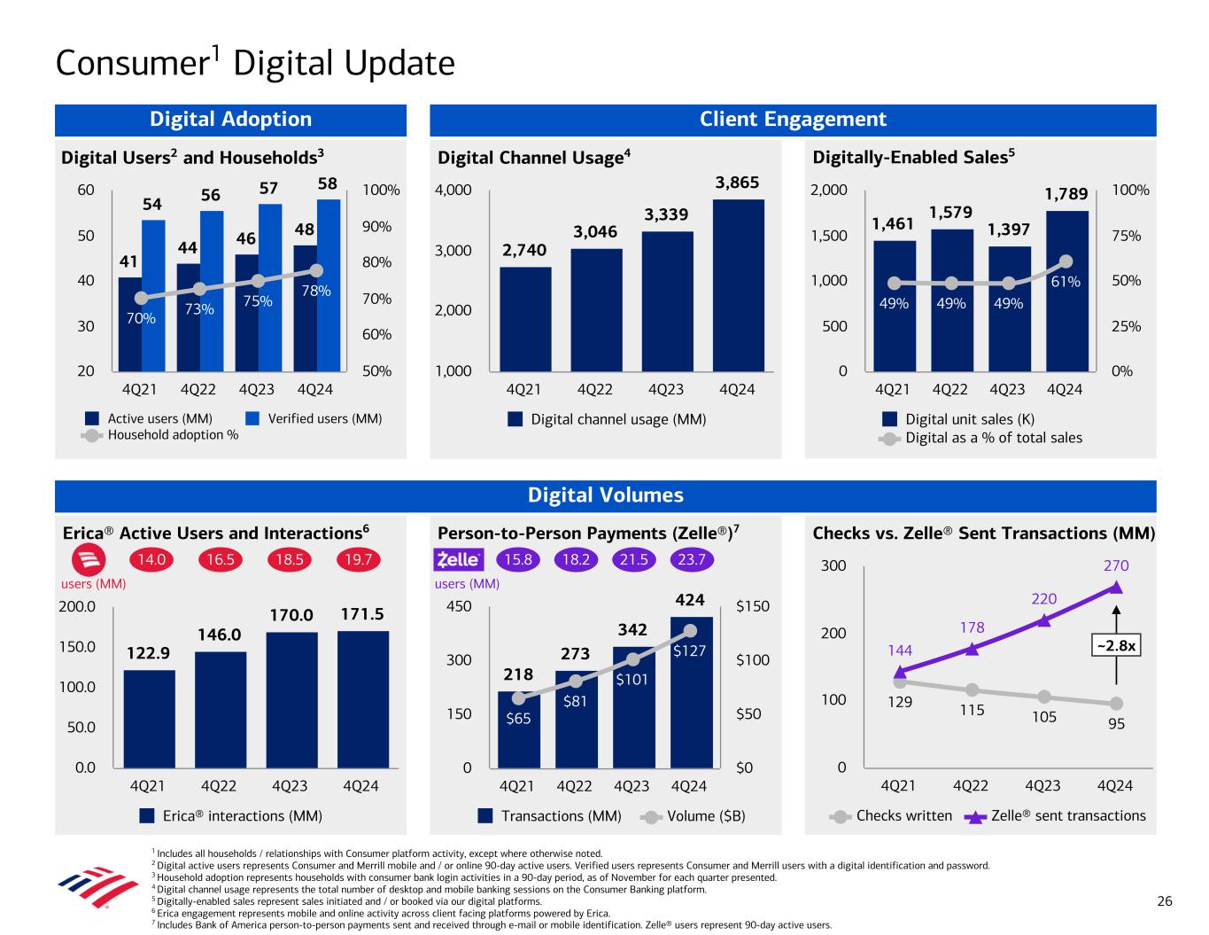 889 998 951 970 900 4Q23 1Q24 2Q24 3Q24 4Q24 0 500 1,000 1,500 Home Equity1 New Originations ($B)5 Consumer Credit Update 1 Includes loan production within Consumer Banking and GWIM. Consumer credit card balances include average balances of $3.5B, $3.4B, and $3.4B in 4Q24, 3Q24, and 4Q23, respectively, within GWIM. 2 Calculated as the difference between total revenue, net of interest expense, and net credit losses divided by average loans. 3 Digitally-enabled sales represent percentage of sales initiated and / or booked via our digital platforms. CVL excludes Dealer sales. 4 Represents Consumer Banking only. 5 Amounts represent the unpaid principal balance of loans and in the case of home equity, the principal amount of the total line of credit. Consumer Vehicle Lending4 New Originations ($B) Consumer Credit Card1 New Accounts (K) 25 Residential Mortgage1 New Originations ($B)5 Key Stats 4Q23 3Q24 4Q24 Average outstandings ($B) 100.4 99.9 100.9 NCO ratio 3.07% 3.70% 3.79% Risk-adjusted margin2 7.18% 7.22% 7.12% Average line FICO 775 778 778 Digitally-enabled sales3 68% 73% 76% $6.1 $6.6 $6.0 $7.9 $6.8 4Q23 1Q24 2Q24 3Q24 4Q24 $0.0 $2.5 $5.0 $7.5 $10.0 Key Stats 4Q23 3Q24 4Q24 Average outstandings ($B) 55.5 56.0 56.8 NCO ratio 0.37% 0.43% 0.50% Average booked FICO 799 801 802 Digitally-enabled sales3 88% 89% 89% $3.9 $3.4 $5.7 $5.3 $6.6 4Q23 1Q24 2Q24 3Q24 4Q24 $0.0 $2.5 $5.0 $7.5 Key Stats 4Q23 3Q24 4Q24 Average outstandings ($B)4 116.3 114.9 114.8 NCO ratio4 0.03% 0.01% 0.01% Average FICO 775 772 775 Average booked loan-to-value (LTV) 72% 72% 71% Digitally-enabled sales3 78% 76% 78% $2.3 $1.9 $2.4 $2.3 $2.3 4Q23 1Q24 2Q24 3Q24 4Q24 $0.0 $1.0 $2.0 $3.0 Key Stats 4Q23 3Q24 4Q24 Average outstandings ($B)4 21.3 21.6 21.8 NCO ratio4 (0.03%) 0.00% 0.00% Average FICO 788 791 793 Average booked combined LTV 57% 55% 55% Digitally-enabled sales3 58% 52% 49%