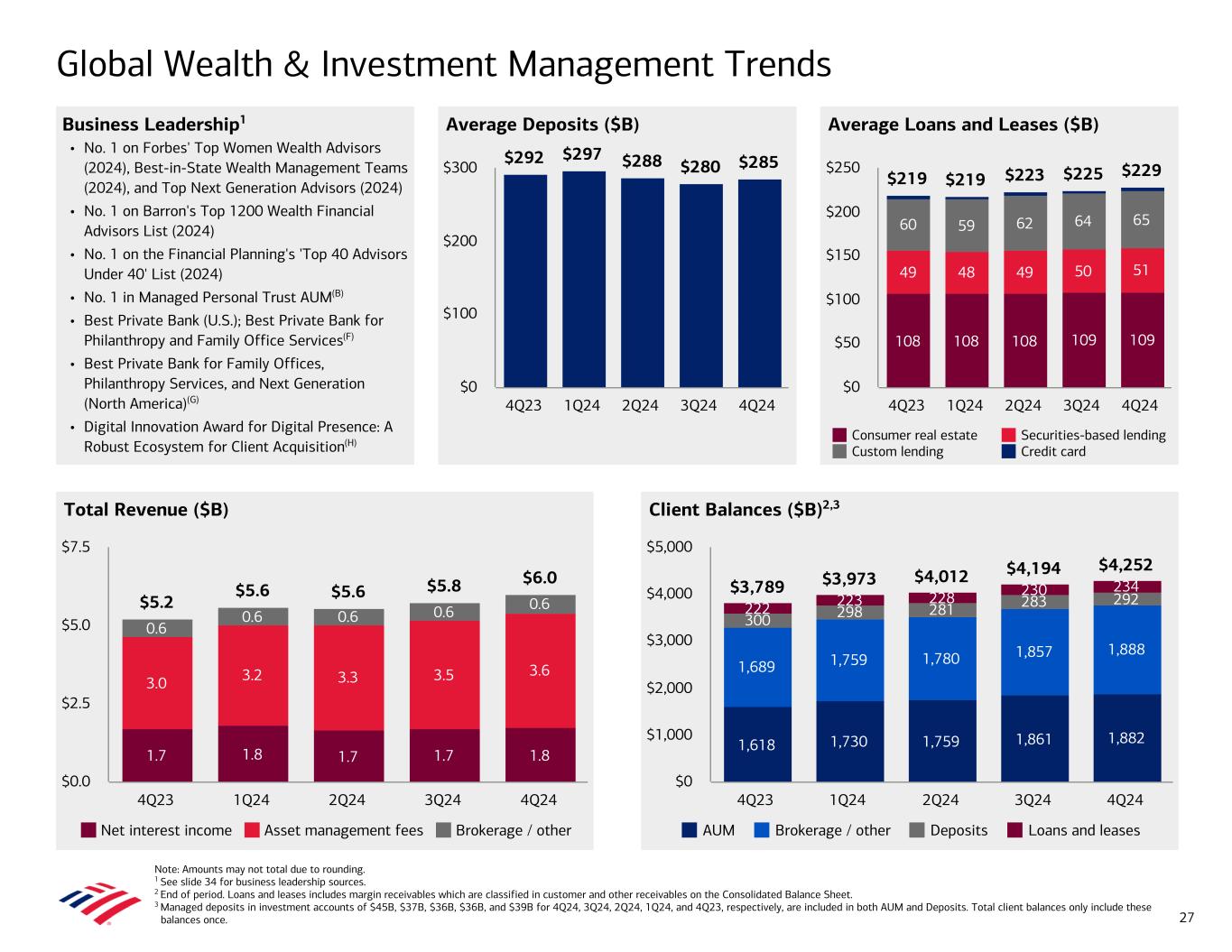 Note: Amounts may not total due to rounding. 1 See slide 34 for business leadership sources. 2 End of period. Loans and leases includes margin receivables which are classified in customer and other receivables on the Consolidated Balance Sheet. 3 Managed deposits in investment accounts of $45B, $37B, $36B, $36B, and $39B for 4Q24, 3Q24, 2Q24, 1Q24, and 4Q23, respectively, are included in both AUM and Deposits. Total client balances only include these balances once. Average Deposits ($B) Global Wealth & Investment Management Trends Business Leadership1 • No. 1 on Forbes' Top Women Wealth Advisors (2024), Best-in-State Wealth Management Teams (2024), and Top Next Generation Advisors (2024) • No. 1 on Barron's Top 1200 Wealth Financial Advisors List (2024) • No. 1 on the Financial Planning's 'Top 40 Advisors Under 40' List (2024) • No. 1 in Managed Personal Trust AUM(B) • Best Private Bank (U.S.); Best Private Bank for Philanthropy and Family Office Services(F) • Best Private Bank for Family Offices, Philanthropy Services, and Next Generation (North America)(G) • Digital Innovation Award for Digital Presence: A Robust Ecosystem for Client Acquisition(H) Average Loans and Leases ($B) Total Revenue ($B) Client Balances ($B)2,3 $5.2 $5.6 $5.6 $5.8 $6.0 1.7 1.8 1.7 1.7 1.8 3.0 3.2 3.3 3.5 3.6 0.6 0.6 0.6 0.6 0.6 Net interest income Asset management fees Brokerage / other 4Q23 1Q24 2Q24 3Q24 4Q24 $0.0 $2.5 $5.0 $7.5 1,618 1,730 1,759 1,861 1,882 1,689 1,759 1,780 1,857 1,888 300 298 281 283 292 222 223 228 230 234$3,789 $3,973 $4,012 $4,194 $4,252 AUM Brokerage / other Deposits Loans and leases 4Q23 1Q24 2Q24 3Q24 4Q24 $0 $1,000 $2,000 $3,000 $4,000 $5,000 $219 $219 $223 $225 $229 108 108 108 109 109 49 48 49 50 51 60 59 62 64 65 Consumer real estate Securities-based lending Custom lending Credit card 4Q23 1Q24 2Q24 3Q24 4Q24 $0 $50 $100 $150 $200 $250 $292 $297 $288 $280 $285 4Q23 1Q24 2Q24 3Q24 4Q24 $0 $100 $200 $300 27