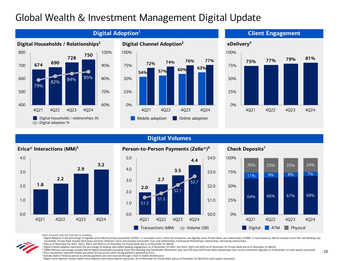Erica® Interactions (MM)5 1.8 2.2 2.9 3.2 4Q21 4Q22 4Q23 4Q24 0.0 1.0 2.0 3.0 4.0 Person-to-Person Payments (Zelle®)6 Check Deposits7 eDelivery4Digital Households / Relationships2 Digital Channel Adoption3 75% 77% 79% 81% 4Q21 4Q22 4Q23 4Q24 0% 25% 50% 75% 100% 54% 57% 60% 63% 72% 74% 76% 77% Mobile adoption Online adoption 4Q21 4Q22 4Q23 4Q24 0% 25% 50% 75% 100% 674 690 728 750 79% 82% 84% 85% Digital households / relationships (K) Digital adoption % 4Q21 4Q22 4Q23 4Q24 400 500 600 700 800 60% 70% 80% 90% 100% Client Engagement Digital Volumes Global Wealth & Investment Management Digital Update 28 Digital Adoption1 2.0 2.7 3.5 4.4 $1.2 $1.5 $2.1 $2.7 Transactions (MM) Volume ($B) 4Q21 4Q22 4Q23 4Q24 0.0 1.0 2.0 3.0 4.0 5.0 $0.0 $1.0 $2.0 $3.0 $4.0 64% 66% 67% 69% 11% 9% 8% 7% 26% 25% 25% 24% Digital ATM Physical 4Q21 4Q22 4Q23 4Q24 0% 25% 50% 75% 100% Note: Amounts may not total due to rounding. 1 Digital Adoption is the percentage of digitally active Merrill primary households ($250K+ in investable assets within the enterprise) and digitally active Private Bank core relationships ($3MM+ in total balances). Merrill excludes Stock Plan and Banking-only households. Private Bank includes third-party activities (effective 1Q23) and excludes Irrevocable Trust-only relationships, Institutional Philanthropic relationships, and exiting relationships. 2 Data as of November for 4Q21. 4Q22, 4Q23, and 4Q24 as of November for Private Bank and as of December for Merrill. 3 Digital channel adoption represents the percentage of desktop and mobile banking engagement, as of November for 4Q21 and 4Q22. 4Q23 and 4Q24 as of November for Private Bank and as of December for Merrill. 4 GWIM eDelivery percentage includes Merrill Digital Households (excluding Stock Plan, Banking-only households, Retirement-only, and 529-only) and Private Bank relationships that receive statements digitally, as of November for each quarter presented. 5 Erica interactions represent mobile and online activity across client-facing platforms powered by Erica. 6 Includes Bank of America person-to-person payments sent and received through e-mail or mobile identification. 7 Digital check deposits include mobile check deposits and remote deposit operations. As of November for Private Bank and as of December for Merrill for each quarter presented.
