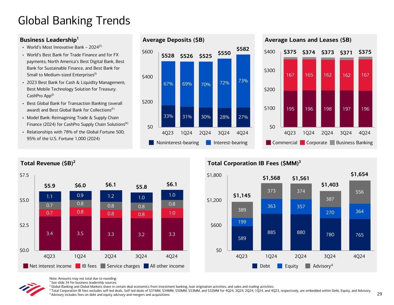 Global Banking Trends Note: Amounts may not total due to rounding. 1 See slide 34 for business leadership sources. 2 Global Banking and Global Markets share in certain deal economics from investment banking, loan origination activities, and sales and trading activities. 3 Total Corporation IB fees excludes self-led deals. Self-led deals of $31MM, $34MM, $50MM, $53MM, and $32MM for 4Q24, 3Q24, 2Q24, 1Q24, and 4Q23, respectively, are embedded within Debt, Equity, and Advisory. 4 Advisory includes fees on debt and equity advisory and mergers and acquisitions. Average Deposits ($B)Business Leadership1 • World’s Most Innovative Bank – 2024(F) • World’s Best Bank for Trade Finance and for FX payments; North America’s Best Digital Bank, Best Bank for Sustainable Finance, and Best Bank for Small to Medium-sized Enterprises(I) • 2023 Best Bank for Cash & Liquidity Management; Best Mobile Technology Solution for Treasury: CashPro App(J) • Best Global Bank for Transaction Banking (overall award) and Best Global Bank for Collections(F) • Model Bank: Reimagining Trade & Supply Chain Finance (2024) for CashPro Supply Chain Solutions(K) • Relationships with 78% of the Global Fortune 500; 95% of the U.S. Fortune 1,000 (2024) Average Loans and Leases ($B) Total Revenue ($B)2 Total Corporation IB Fees ($MM)3 $5.9 $6.0 $6.1 $5.8 $6.1 3.4 3.5 3.3 3.2 3.3 0.7 0.8 0.8 0.8 1.0 0.7 0.8 0.8 0.8 0.8 1.1 0.9 1.2 1.0 1.0 Net interest income IB fees Service charges All other income 4Q23 1Q24 2Q24 3Q24 4Q24 $0.0 $2.5 $5.0 $7.5 589 885 880 780 765 199 363 357 270 364389 373 374 387 556 $1,145 $1,568 $1,561 $1,403 $1,654 Debt Equity Advisory 4Q23 1Q24 2Q24 3Q24 4Q24 $0 $600 $1,200 $1,800 195 196 198 197 196 167 165 162 162 167 $375 $374 $373 $371 $375 Commercial Corporate Business Banking 4Q23 1Q24 2Q24 3Q24 4Q24 $0 $100 $200 $300 $400 4 $528 $526 $525 $550 $582 Noninterest-bearing Interest-bearing 4Q23 1Q24 2Q24 3Q24 4Q24 $0 $200 $400 $600 29 33% 31% 30% 28% 27% 67% 69% 70% 72% 73%