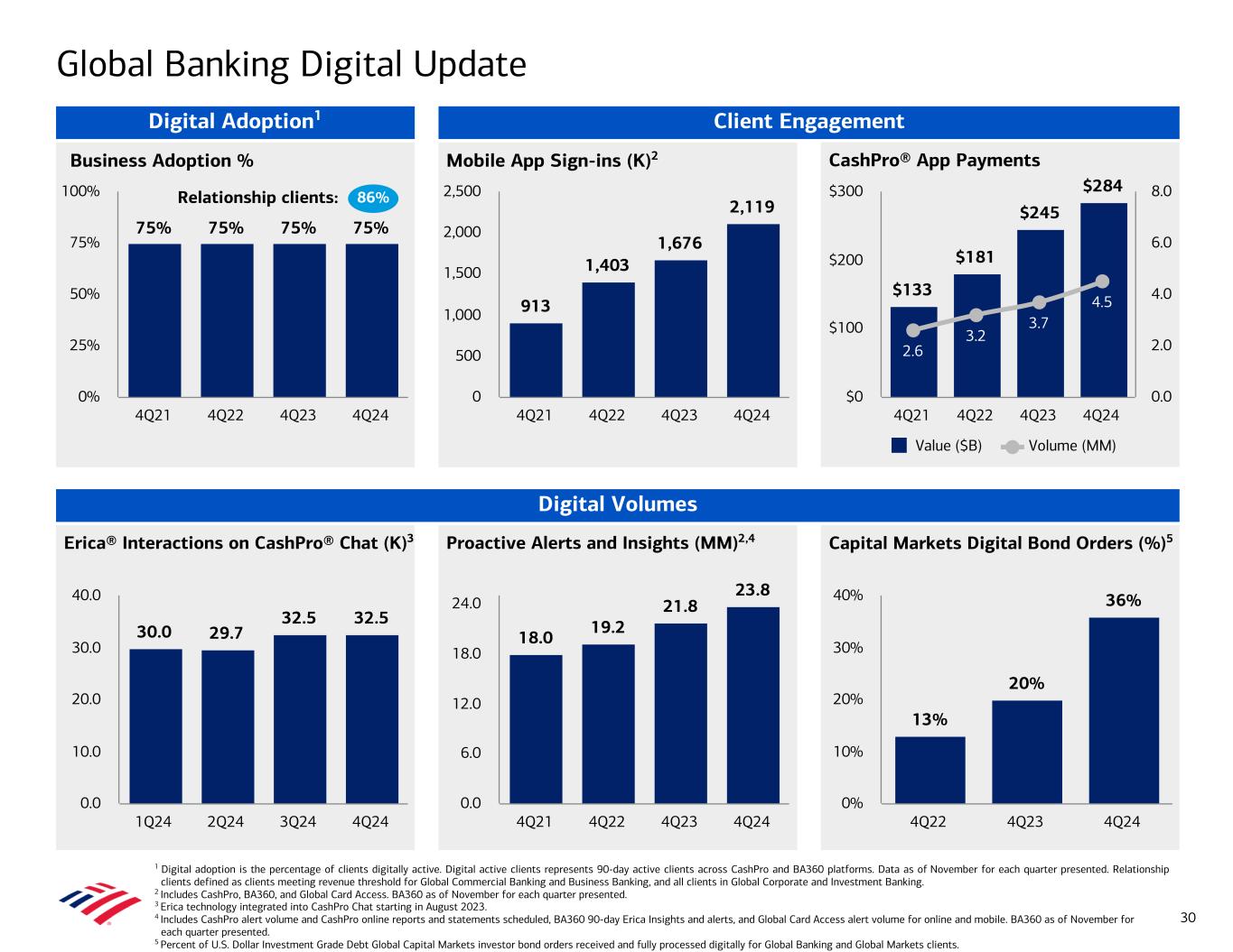 1 Digital adoption is the percentage of clients digitally active. Digital active clients represents 90-day active clients across CashPro and BA360 platforms. Data as of November for each quarter presented. Relationship clients defined as clients meeting revenue threshold for Global Commercial Banking and Business Banking, and all clients in Global Corporate and Investment Banking. 2 Includes CashPro, BA360, and Global Card Access. BA360 as of November for each quarter presented. 3 Erica technology integrated into CashPro Chat starting in August 2023. 4 Includes CashPro alert volume and CashPro online reports and statements scheduled, BA360 90-day Erica Insights and alerts, and Global Card Access alert volume for online and mobile. BA360 as of November for each quarter presented. 5 Percent of U.S. Dollar Investment Grade Debt Global Capital Markets investor bond orders received and fully processed digitally for Global Banking and Global Markets clients. Capital Markets Digital Bond Orders (%)5 Erica® Interactions on CashPro® Chat (K)3 Proactive Alerts and Insights (MM)2,4 13% 20% 36% 4Q22 4Q23 4Q24 0% 10% 20% 30% 40% 18.0 19.2 21.8 23.8 4Q21 4Q22 4Q23 4Q24 0.0 6.0 12.0 18.0 24.0 30.0 29.7 32.5 32.5 1Q24 2Q24 3Q24 4Q24 0.0 10.0 20.0 30.0 40.0 CashPro® App PaymentsBusiness Adoption % Mobile App Sign-ins (K)2 $133 $181 $245 $284 2.6 3.2 3.7 4.5 Value ($B) Volume (MM) 4Q21 4Q22 4Q23 4Q24 $0 $100 $200 $300 0.0 2.0 4.0 6.0 8.0 913 1,403 1,676 2,119 4Q21 4Q22 4Q23 4Q24 0 500 1,000 1,500 2,000 2,500 75% 75% 75% 75% 4Q21 4Q22 4Q23 4Q24 0% 25% 50% 75% 100% Client Engagement Digital Volumes Global Banking Digital Update 30 Digital Adoption1 86%Relationship clients: