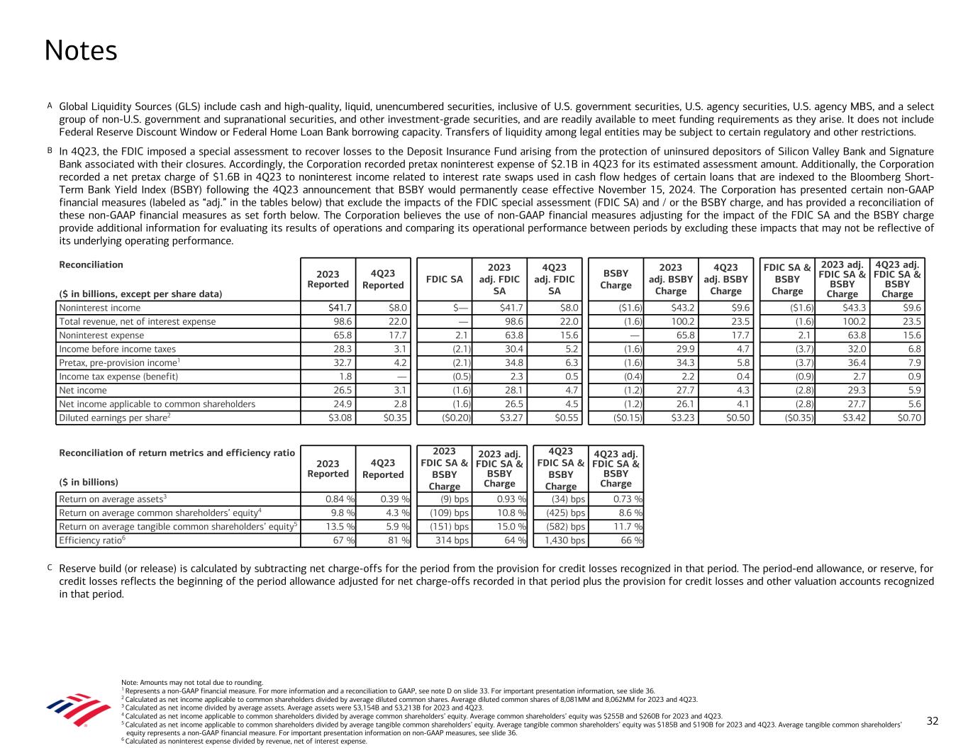 A Global Liquidity Sources (GLS) include cash and high-quality, liquid, unencumbered securities, inclusive of U.S. government securities, U.S. agency securities, U.S. agency MBS, and a select group of non-U.S. government and supranational securities, and other investment-grade securities, and are readily available to meet funding requirements as they arise. It does not include Federal Reserve Discount Window or Federal Home Loan Bank borrowing capacity. Transfers of liquidity among legal entities may be subject to certain regulatory and other restrictions. B In 4Q23, the FDIC imposed a special assessment to recover losses to the Deposit Insurance Fund arising from the protection of uninsured depositors of Silicon Valley Bank and Signature Bank associated with their closures. Accordingly, the Corporation recorded pretax noninterest expense of $2.1B in 4Q23 for its estimated assessment amount. Additionally, the Corporation recorded a net pretax charge of $1.6B in 4Q23 to noninterest income related to interest rate swaps used in cash flow hedges of certain loans that are indexed to the Bloomberg Short- Term Bank Yield Index (BSBY) following the 4Q23 announcement that BSBY would permanently cease effective November 15, 2024. The Corporation has presented certain non-GAAP financial measures (labeled as “adj.” in the tables below) that exclude the impacts of the FDIC special assessment (FDIC SA) and / or the BSBY charge, and has provided a reconciliation of these non-GAAP financial measures as set forth below. The Corporation believes the use of non-GAAP financial measures adjusting for the impact of the FDIC SA and the BSBY charge provide additional information for evaluating its results of operations and comparing its operational performance between periods by excluding these impacts that may not be reflective of its underlying operating performance. C Reserve build (or release) is calculated by subtracting net charge-offs for the period from the provision for credit losses recognized in that period. The period-end allowance, or reserve, for credit losses reflects the beginning of the period allowance adjusted for net charge-offs recorded in that period plus the provision for credit losses and other valuation accounts recognized in that period. Notes 32 Reconciliation ($ in billions, except per share data) 2023 Reported 4Q23 Reported FDIC SA 2023 adj. FDIC SA 4Q23 adj. FDIC SA BSBY Charge 2023 adj. BSBY Charge 4Q23 adj. BSBY Charge FDIC SA & BSBY Charge 2023 adj. FDIC SA & BSBY Charge 4Q23 adj. FDIC SA & BSBY Charge Noninterest income $41.7 $8.0 $— $41.7 $8.0 ($1.6) $43.2 $9.6 ($1.6) $43.3 $9.6 Total revenue, net of interest expense 98.6 22.0 — 98.6 22.0 (1.6) 100.2 23.5 (1.6) 100.2 23.5 Noninterest expense 65.8 17.7 2.1 63.8 15.6 — 65.8 17.7 2.1 63.8 15.6 Income before income taxes 28.3 3.1 (2.1) 30.4 5.2 (1.6) 29.9 4.7 (3.7) 32.0 6.8 Pretax, pre-provision income1 32.7 4.2 (2.1) 34.8 6.3 (1.6) 34.3 5.8 (3.7) 36.4 7.9 Income tax expense (benefit) 1.8 — (0.5) 2.3 0.5 (0.4) 2.2 0.4 (0.9) 2.7 0.9 Net income 26.5 3.1 (1.6) 28.1 4.7 (1.2) 27.7 4.3 (2.8) 29.3 5.9 Net income applicable to common shareholders 24.9 2.8 (1.6) 26.5 4.5 (1.2) 26.1 4.1 (2.8) 27.7 5.6 Diluted earnings per share2 $3.08 $0.35 ($0.20) $3.27 $0.55 ($0.15) $3.23 $0.50 ($0.35) $3.42 $0.70 Reconciliation of return metrics and efficiency ratio ($ in billions) 2023 Reported 4Q23 Reported 2023 FDIC SA & BSBY Charge 2023 adj. FDIC SA & BSBY Charge 4Q23 FDIC SA & BSBY Charge 4Q23 adj. FDIC SA & BSBY Charge Return on average assets3 0.84 % 0.39 % (9) bps 0.93 % (34) bps 0.73 % Return on average common shareholders’ equity4 9.8 % 4.3 % (109) bps 10.8 % (425) bps 8.6 % Return on average tangible common shareholders’ equity5 13.5 % 5.9 % (151) bps 15.0 % (582) bps 11.7 % Efficiency ratio6 67 % 81 % 314 bps 64 % 1,430 bps 66 % Note: Amounts may not total due to rounding. 1 Represents a non-GAAP financial measure. For more information and a reconciliation to GAAP, see note D on slide 33. For important presentation information, see slide 36. 2 Calculated as net income applicable to common shareholders divided by average diluted common shares. Average diluted common shares of 8,081MM and 8,062MM for 2023 and 4Q23. 3 Calculated as net income divided by average assets. Average assets were $3,154B and $3,213B for 2023 and 4Q23. 4 Calculated as net income applicable to common shareholders divided by average common shareholders’ equity. Average common shareholders’ equity was $255B and $260B for 2023 and 4Q23. 5 Calculated as net income applicable to common shareholders divided by average tangible common shareholders’ equity. Average tangible common shareholders’ equity was $185B and $190B for 2023 and 4Q23. Average tangible common shareholders’ equity represents a non-GAAP financial measure. For important presentation information on non-GAAP measures, see slide 36. 6 Calculated as noninterest expense divided by revenue, net of interest expense.