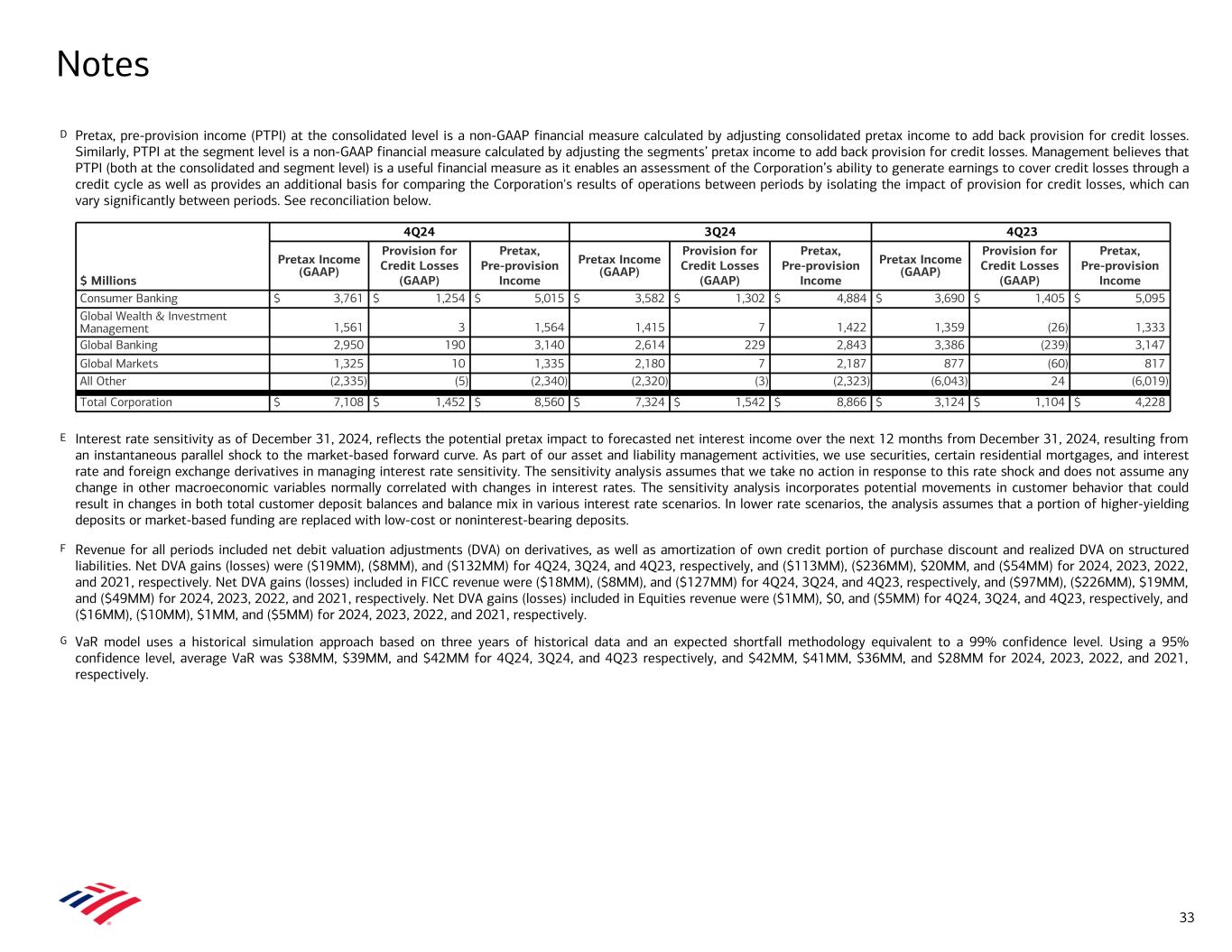 D Pretax, pre-provision income (PTPI) at the consolidated level is a non-GAAP financial measure calculated by adjusting consolidated pretax income to add back provision for credit losses. Similarly, PTPI at the segment level is a non-GAAP financial measure calculated by adjusting the segments’ pretax income to add back provision for credit losses. Management believes that PTPI (both at the consolidated and segment level) is a useful financial measure as it enables an assessment of the Corporation’s ability to generate earnings to cover credit losses through a credit cycle as well as provides an additional basis for comparing the Corporation's results of operations between periods by isolating the impact of provision for credit losses, which can vary significantly between periods. See reconciliation below. E Interest rate sensitivity as of December 31, 2024, reflects the potential pretax impact to forecasted net interest income over the next 12 months from December 31, 2024, resulting from an instantaneous parallel shock to the market-based forward curve. As part of our asset and liability management activities, we use securities, certain residential mortgages, and interest rate and foreign exchange derivatives in managing interest rate sensitivity. The sensitivity analysis assumes that we take no action in response to this rate shock and does not assume any change in other macroeconomic variables normally correlated with changes in interest rates. The sensitivity analysis incorporates potential movements in customer behavior that could result in changes in both total customer deposit balances and balance mix in various interest rate scenarios. In lower rate scenarios, the analysis assumes that a portion of higher-yielding deposits or market-based funding are replaced with low-cost or noninterest-bearing deposits. F Revenue for all periods included net debit valuation adjustments (DVA) on derivatives, as well as amortization of own credit portion of purchase discount and realized DVA on structured liabilities. Net DVA gains (losses) were ($19MM), ($8MM), and ($132MM) for 4Q24, 3Q24, and 4Q23, respectively, and ($113MM), ($236MM), $20MM, and ($54MM) for 2024, 2023, 2022, and 2021, respectively. Net DVA gains (losses) included in FICC revenue were ($18MM), ($8MM), and ($127MM) for 4Q24, 3Q24, and 4Q23, respectively, and ($97MM), ($226MM), $19MM, and ($49MM) for 2024, 2023, 2022, and 2021, respectively. Net DVA gains (losses) included in Equities revenue were ($1MM), $0, and ($5MM) for 4Q24, 3Q24, and 4Q23, respectively, and ($16MM), ($10MM), $1MM, and ($5MM) for 2024, 2023, 2022, and 2021, respectively. G VaR model uses a historical simulation approach based on three years of historical data and an expected shortfall methodology equivalent to a 99% confidence level. Using a 95% confidence level, average VaR was $38MM, $39MM, and $42MM for 4Q24, 3Q24, and 4Q23 respectively, and $42MM, $41MM, $36MM, and $28MM for 2024, 2023, 2022, and 2021, respectively. Notes $ Millions 4Q24 3Q24 4Q23 Pretax Income (GAAP) Provision for Credit Losses (GAAP) Pretax, Pre-provision Income Pretax Income (GAAP) Provision for Credit Losses (GAAP) Pretax, Pre-provision Income Pretax Income (GAAP) Provision for Credit Losses (GAAP) Pretax, Pre-provision Income Consumer Banking $ 3,761 $ 1,254 $ 5,015 $ 3,582 $ 1,302 $ 4,884 $ 3,690 $ 1,405 $ 5,095 Global Wealth & Investment Management 1,561 3 1,564 1,415 7 1,422 1,359 (26) 1,333 Global Banking 2,950 190 3,140 2,614 229 2,843 3,386 (239) 3,147 Global Markets 1,325 10 1,335 2,180 7 2,187 877 (60) 817 All Other (2,335) (5) (2,340) (2,320) (3) (2,323) (6,043) 24 (6,019) Total Corporation $ 7,108 $ 1,452 $ 8,560 $ 7,324 $ 1,542 $ 8,866 $ 3,124 $ 1,104 $ 4,228 33
