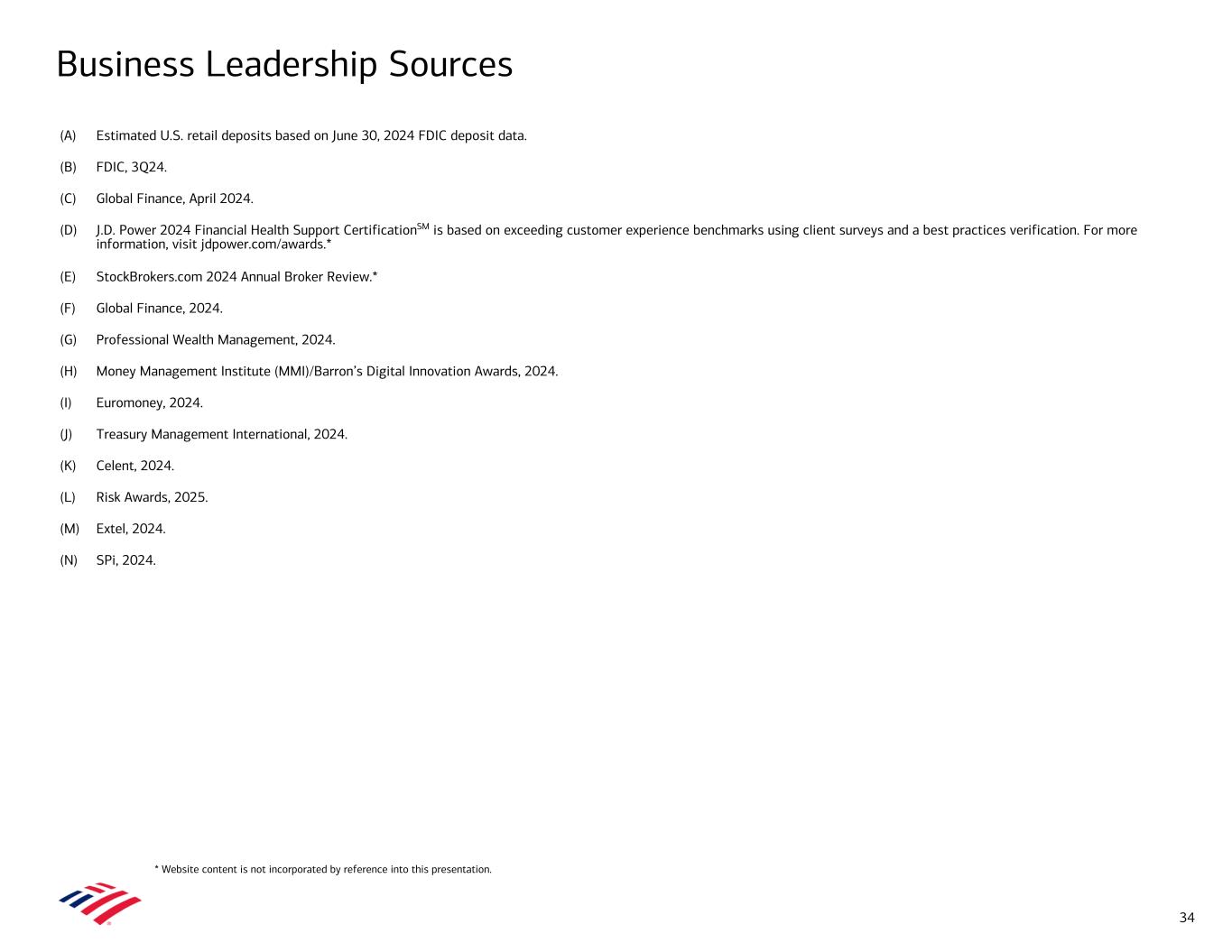 Business Leadership Sources (A) Estimated U.S. retail deposits based on June 30, 2024 FDIC deposit data. (B) FDIC, 3Q24. (C) Global Finance, April 2024. (D) J.D. Power 2024 Financial Health Support CertificationSM is based on exceeding customer experience benchmarks using client surveys and a best practices verification. For more information, visit jdpower.com/awards.* (E) StockBrokers.com 2024 Annual Broker Review.* (F) Global Finance, 2024. (G) Professional Wealth Management, 2024. (H) Money Management Institute (MMI)/Barron’s Digital Innovation Awards, 2024. (I) Euromoney, 2024. (J) Treasury Management International, 2024. (K) Celent, 2024. (L) Risk Awards, 2025. (M) Extel, 2024. (N) SPi, 2024. 34 * Website content is not incorporated by reference into this presentation.