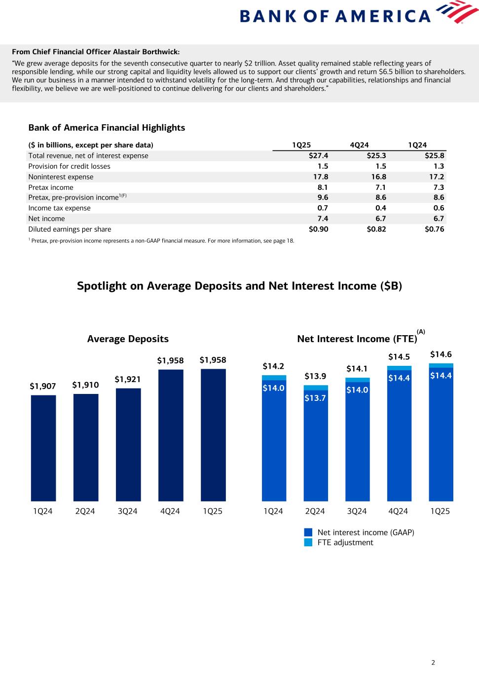 2 From Chief Financial Officer Alastair Borthwick: “We grew average deposits for the seventh consecutive quarter to nearly $2 trillion. Asset quality remained stable reflecting years of responsible lending, while our strong capital and liquidity levels allowed us to support our clients’ growth and return $6.5 billion to shareholders. We run our business in a manner intended to withstand volatility for the long-term. And through our capabilities, relationships and financial flexibility, we believe we are well-positioned to continue delivering for our clients and shareholders.” Bank of America Financial Highlights ($ in billions, except per share data) 1Q25 4Q24 1Q24 Total revenue, net of interest expense $27.4 $25.3 $25.8 Provision for credit losses 1.5 1.5 1.3 Noninterest expense 17.8 16.8 17.2 Pretax income 8.1 7.1 7.3 Pretax, pre-provision income1(F) 9.6 8.6 8.6 Income tax expense 0.7 0.4 0.6 Net income 7.4 6.7 6.7 Diluted earnings per share $0.90 $0.82 $0.76 1 Pretax, pre-provision income represents a non-GAAP financial measure. For more information, see page 18. Net Interest Income (FTE) $14.2 $13.9 $14.1 $14.5 $14.6 $14.0 $13.7 $14.0 $14.4 $14.4 Net interest income (GAAP) FTE adjustment 1Q24 2Q24 3Q24 4Q24 1Q25 Average Deposits $1,907 $1,910 $1,921 $1,958 $1,958 1Q24 2Q24 3Q24 4Q24 1Q25 Spotlight on Average Deposits and Net Interest Income ($B) (A)