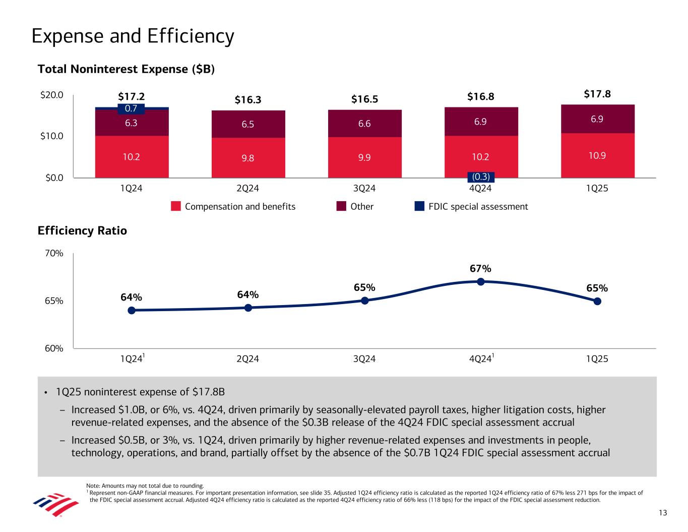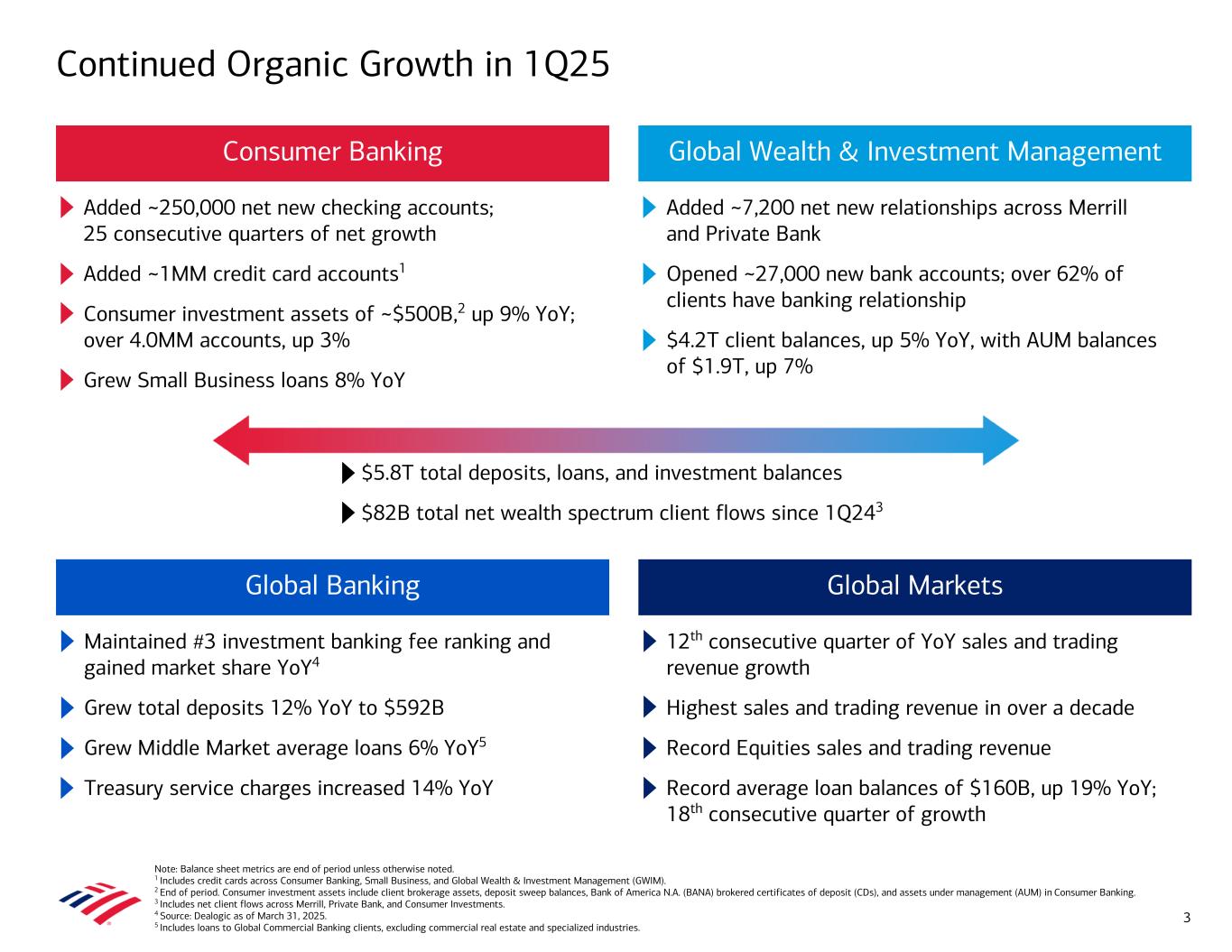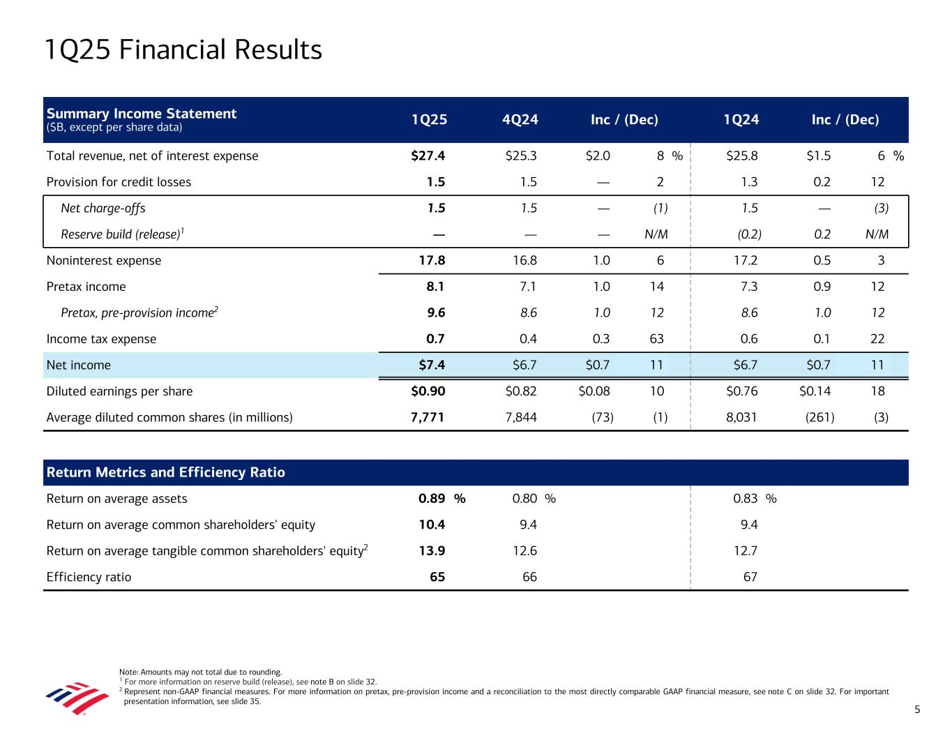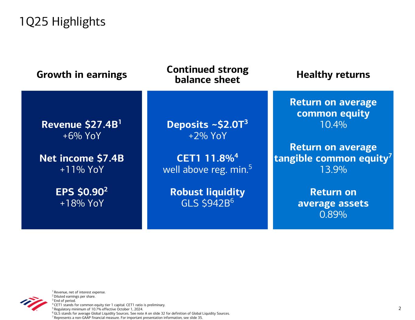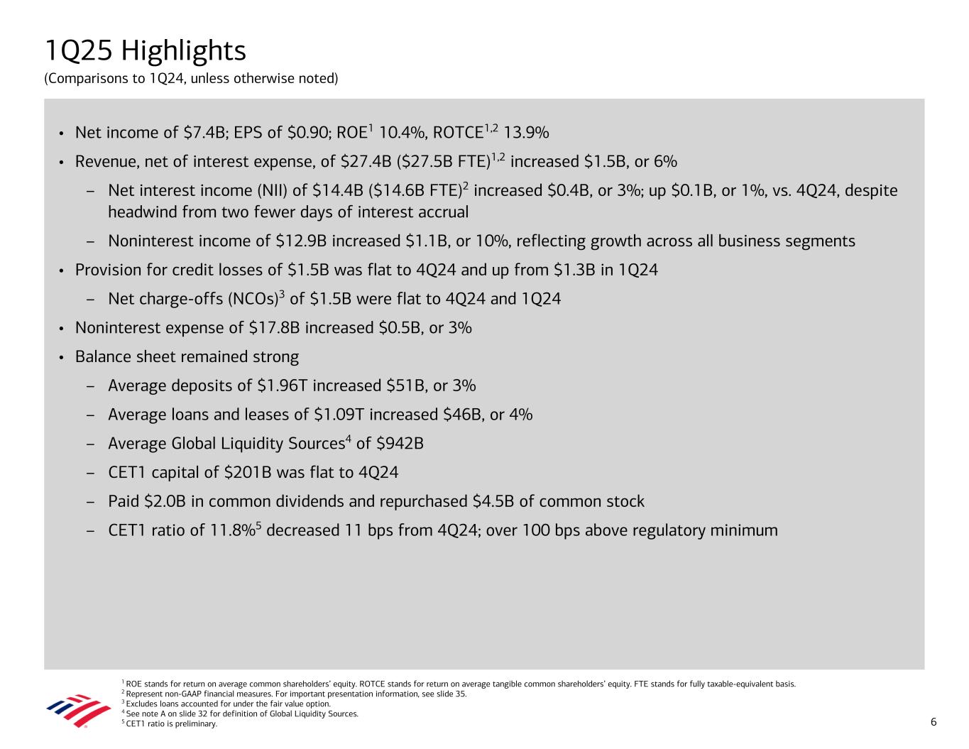 1 ROE stands for return on average common shareholders’ equity. ROTCE stands for return on average tangible common shareholders’ equity. FTE stands for fully taxable-equivalent basis. 2 Represent non-GAAP financial measures. For important presentation information, see slide 35. 3 Excludes loans accounted for under the fair value option. 4 See note A on slide 32 for definition of Global Liquidity Sources. 5 CET1 ratio is preliminary. 1Q25 Highlights (Comparisons to 1Q24, unless otherwise noted) • Net income of $7.4B; EPS of $0.90; ROE1 10.4%, ROTCE1,2 13.9% • Revenue, net of interest expense, of $27.4B ($27.5B FTE)1,2 increased $1.5B, or 6% – Net interest income (NII) of $14.4B ($14.6B FTE)2 increased $0.4B, or 3%; up $0.1B, or 1%, vs. 4Q24, despite headwind from two fewer days of interest accrual – Noninterest income of $12.9B increased $1.1B, or 10%, reflecting growth across all business segments • Provision for credit losses of $1.5B was flat to 4Q24 and up from $1.3B in 1Q24 – Net charge-offs (NCOs)3 of $1.5B were flat to 4Q24 and 1Q24 • Noninterest expense of $17.8B increased $0.5B, or 3% • Balance sheet remained strong – Average deposits of $1.96T increased $51B, or 3% – Average loans and leases of $1.09T increased $46B, or 4% – Average Global Liquidity Sources4 of $942B – CET1 capital of $201B was flat to 4Q24 – Paid $2.0B in common dividends and repurchased $4.5B of common stock – CET1 ratio of 11.8%5 decreased 11 bps from 4Q24; over 100 bps above regulatory minimum 6
