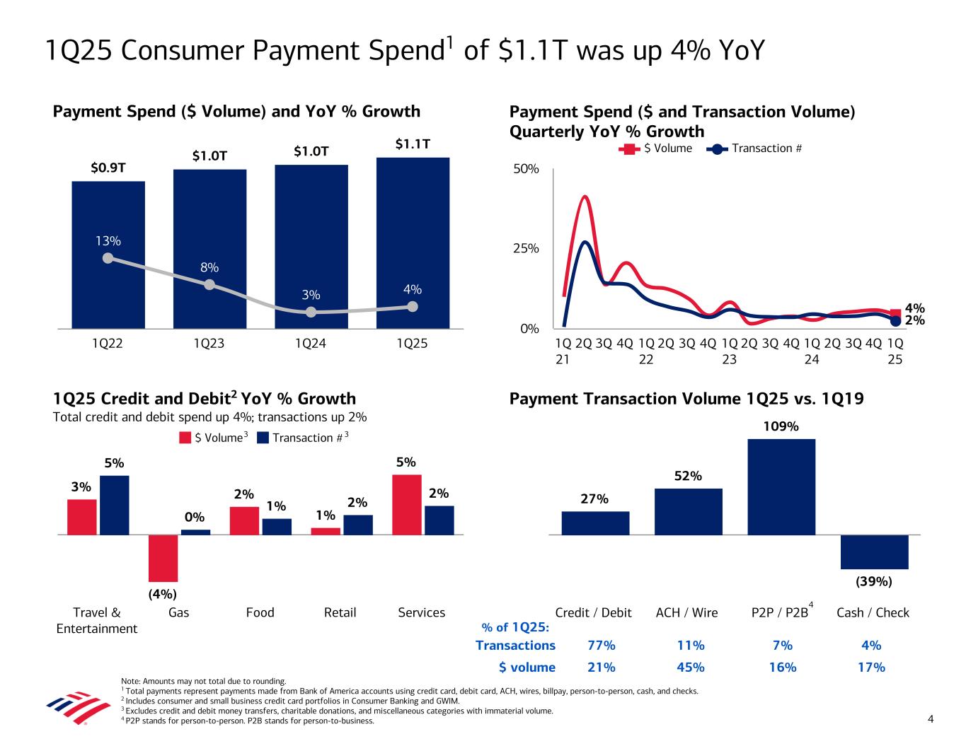 Maintained #3 investment banking fee ranking and gained market share YoY4 Grew total deposits 12% YoY to $592B Grew Middle Market average loans 6% YoY5 Treasury service charges increased 14% YoY Added ~7,200 net new relationships across Merrill and Private Bank Opened ~27,000 new bank accounts; over 62% of clients have banking relationship $4.2T client balances, up 5% YoY, with AUM balances of $1.9T, up 7% Continued Organic Growth in 1Q25 3 Consumer Banking Global Wealth & Investment Management Global Banking Global Markets Added ~250,000 net new checking accounts; 25 consecutive quarters of net growth Added ~1MM credit card accounts1 Consumer investment assets of ~$500B,2 up 9% YoY; over 4.0MM accounts, up 3% Grew Small Business loans 8% YoY $5.8T total deposits, loans, and investment balances $82B total net wealth spectrum client flows since 1Q243 Note: Balance sheet metrics are end of period unless otherwise noted. 1 Includes credit cards across Consumer Banking, Small Business, and Global Wealth & Investment Management (GWIM). 2 End of period. Consumer investment assets include client brokerage assets, deposit sweep balances, Bank of America N.A. (BANA) brokered certificates of deposit (CDs), and assets under management (AUM) in Consumer Banking. 3 Includes net client flows across Merrill, Private Bank, and Consumer Investments. 4 Source: Dealogic as of March 31, 2025. 5 Includes loans to Global Commercial Banking clients, excluding commercial real estate and specialized industries. 12th consecutive quarter of YoY sales and trading revenue growth Highest sales and trading revenue in over a decade Record Equities sales and trading revenue Record average loan balances of $160B, up 19% YoY; 18th consecutive quarter of growth