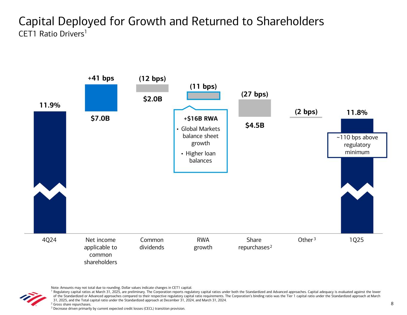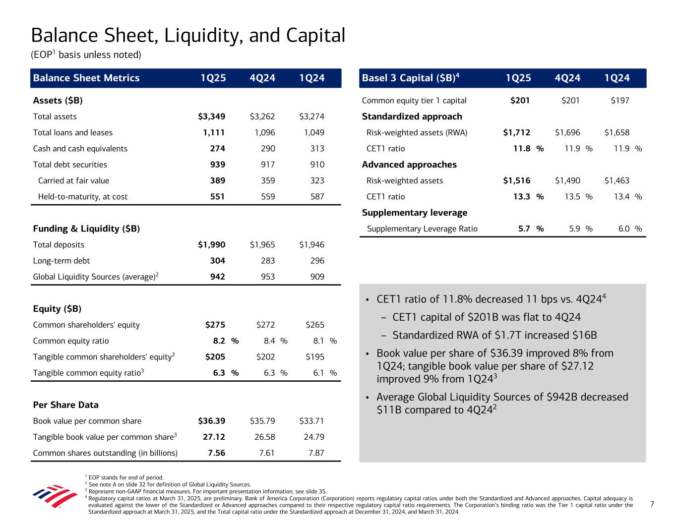 Balance Sheet Metrics 1Q25 4Q24 1Q24 Basel 3 Capital ($B)4 1Q25 4Q24 1Q24 Assets ($B) Common equity tier 1 capital $201 $201 $197 Total assets $3,349 $3,262 $3,274 Standardized approach Total loans and leases 1,111 1,096 1,049 Risk-weighted assets (RWA) $1,712 $1,696 $1,658 Cash and cash equivalents 274 290 313 CET1 ratio 11.8 % 11.9 % 11.9 % Total debt securities 939 917 910 Advanced approaches Carried at fair value 389 359 323 Risk-weighted assets $1,516 $1,490 $1,463 Held-to-maturity, at cost 551 559 587 CET1 ratio 13.3 % 13.5 % 13.4 % Supplementary leverage Funding & Liquidity ($B) Supplementary Leverage Ratio 5.7 % 5.9 % 6.0 % Total deposits $1,990 $1,965 $1,946 Long-term debt 304 283 296 Global Liquidity Sources (average)2 942 953 909 Equity ($B) Common shareholders' equity $275 $272 $265 Common equity ratio 8.2 % 8.4 % 8.1 % Tangible common shareholders' equity3 $205 $202 $195 Tangible common equity ratio3 6.3 % 6.3 % 6.1 % Per Share Data Book value per common share $36.39 $35.79 $33.71 Tangible book value per common share3 27.12 26.58 24.79 Common shares outstanding (in billions) 7.56 7.61 7.87 1 EOP stands for end of period. 2 See note A on slide 32 for definition of Global Liquidity Sources. 3 Represent non-GAAP financial measures. For important presentation information, see slide 35. 4 Regulatory capital ratios at March 31, 2025, are preliminary. Bank of America Corporation (Corporation) reports regulatory capital ratios under both the Standardized and Advanced approaches. Capital adequacy is evaluated against the lower of the Standardized or Advanced approaches compared to their respective regulatory capital ratio requirements. The Corporation’s binding ratio was the Tier 1 capital ratio under the Standardized approach at March 31, 2025, and the Total capital ratio under the Standardized approach at December 31, 2024, and March 31, 2024. Balance Sheet, Liquidity, and Capital (EOP1 basis unless noted) 7 • CET1 ratio of 11.8% decreased 11 bps vs. 4Q244 – CET1 capital of $201B was flat to 4Q24 – Standardized RWA of $1.7T increased $16B • Book value per share of $36.39 improved 8% from 1Q24; tangible book value per share of $27.12 improved 9% from 1Q243 • Average Global Liquidity Sources of $942B decreased $11B compared to 4Q242