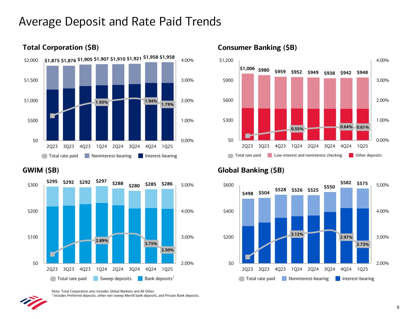 11.9% +41 bps 11.8% 4Q24 Net income applicable to common shareholders Common dividends RWA growth Share repurchases Other 1Q25 Capital Deployed for Growth and Returned to Shareholders CET1 Ratio Drivers1 Note: Amounts may not total due to rounding. Dollar values indicate changes in CET1 capital. 1 Regulatory capital ratios at March 31, 2025, are preliminary. The Corporation reports regulatory capital ratios under both the Standardized and Advanced approaches. Capital adequacy is evaluated against the lower of the Standardized or Advanced approaches compared to their respective regulatory capital ratio requirements. The Corporation’s binding ratio was the Tier 1 capital ratio under the Standardized approach at March 31, 2025, and the Total capital ratio under the Standardized approach at December 31, 2024, and March 31, 2024. 2 Gross share repurchases. 3 Decrease driven primarily by current expected credit losses (CECL) transition provision. 8 (12 bps) $7.0B $2.0B (11 bps) $4.5B (27 bps) (2 bps) 3 2 +$16B RWA • Global Markets balance sheet growth • Higher loan balances ~110 bps above regulatory minimum