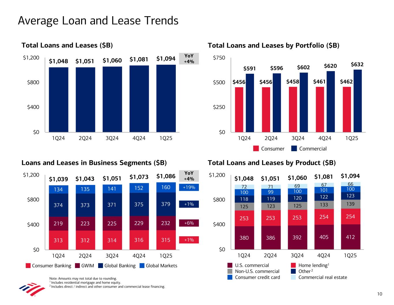 $1,875 $1,876 $1,905 $1,907 $1,910 $1,921 $1,958 $1,958 Total rate paid Noninterest-bearing Interest-bearing 2Q23 3Q23 4Q23 1Q24 2Q24 3Q24 4Q24 1Q25 $0 $500 $1,000 $1,500 $2,000 0.00% 1.00% 2.00% 3.00% 4.00% Consumer Banking ($B) GWIM ($B) Global Banking ($B) Total Corporation ($B) Average Deposit and Rate Paid Trends 9 $1,006 $980 $959 $952 $949 $938 $942 $948 Total rate paid Low-interest and noninterest checking Other deposits 2Q23 3Q23 4Q23 1Q24 2Q24 3Q24 4Q24 1Q25 $0 $300 $600 $900 $1,200 0.00% 1.00% 2.00% 3.00% 4.00% $295 $292 $292 $297 $288 $280 $285 $286 Total rate paid Sweep deposits Bank deposits 2Q23 3Q23 4Q23 1Q24 2Q24 3Q24 4Q24 1Q25 $0 $100 $200 $300 2.00% 3.00% 4.00% 5.00% $498 $504 $528 $526 $525 $550 $582 $575 Total rate paid Noninterest-bearing Interest-bearing 2Q23 3Q23 4Q23 1Q24 2Q24 3Q24 4Q24 1Q25 $0 $200 $400 $600 2.00% 3.00% 4.00% 5.00% Note: Total Corporation also includes Global Markets and All Other. 1 Includes Preferred deposits, other non-sweep Merrill bank deposits, and Private Bank deposits. 1 1.79% 0.61% 2.50% 2.73% 1.94% 2.75% 2.97% 0.64% 1.93% 0.55% 2.89% 3.12%