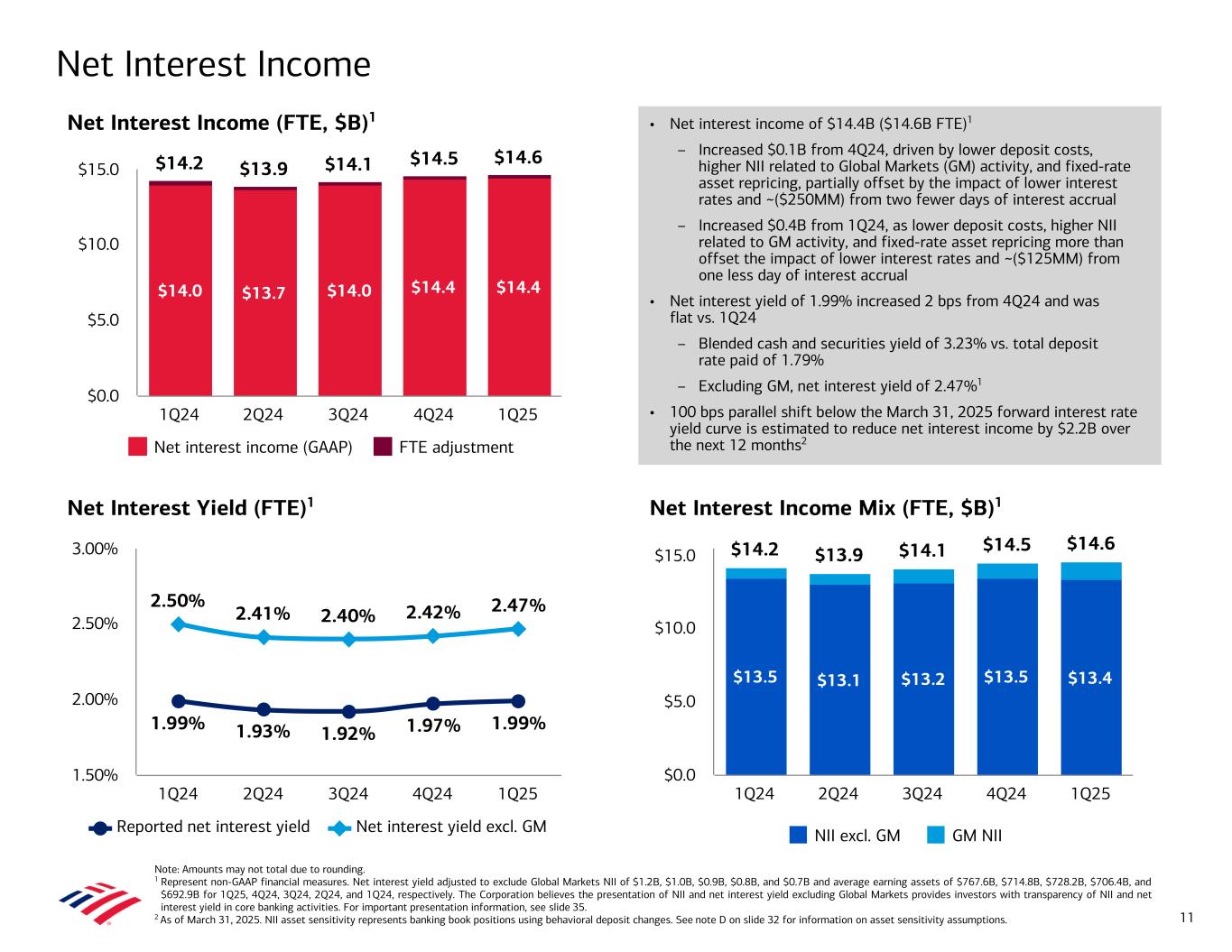 $1,039 $1,043 $1,051 $1,073 $1,086 313 312 314 316 315 219 223 225 229 232 374 373 371 375 379 134 135 141 152 160 Consumer Banking GWIM Global Banking Global Markets 1Q24 2Q24 3Q24 4Q24 1Q25 $0 $400 $800 $1,200 $1,048 $1,051 $1,060 $1,081 $1,094 1Q24 2Q24 3Q24 4Q24 1Q25 $0 $400 $800 $1,200 +1% +6% +1% +19% Average Loan and Lease Trends YoY +4% YoY +4% Note: Amounts may not total due to rounding. 1 Includes residential mortgage and home equity. 2 Includes direct / indirect and other consumer and commercial lease financing. Total Loans and Leases by Product ($B) Loans and Leases in Business Segments ($B) Total Loans and Leases by Portfolio ($B)Total Loans and Leases ($B) $456 $456 $458 $461 $462 $591 $596 $602 $620 $632 Consumer Commercial 1Q24 2Q24 3Q24 4Q24 1Q25 $0 $250 $500 $750 10 $1,048 $1,051 $1,060 $1,081 $1,094 380 386 392 405 412 253 253 253 254 254 125 123 125 133 139 118 119 120 122 123 100 99 100 101 10072 71 69 67 66 U.S. commercial Home lending Non-U.S. commercial Other Consumer credit card Commercial real estate 1Q24 2Q24 3Q24 4Q24 1Q25 $0 $400 $800 $1,200 2 1