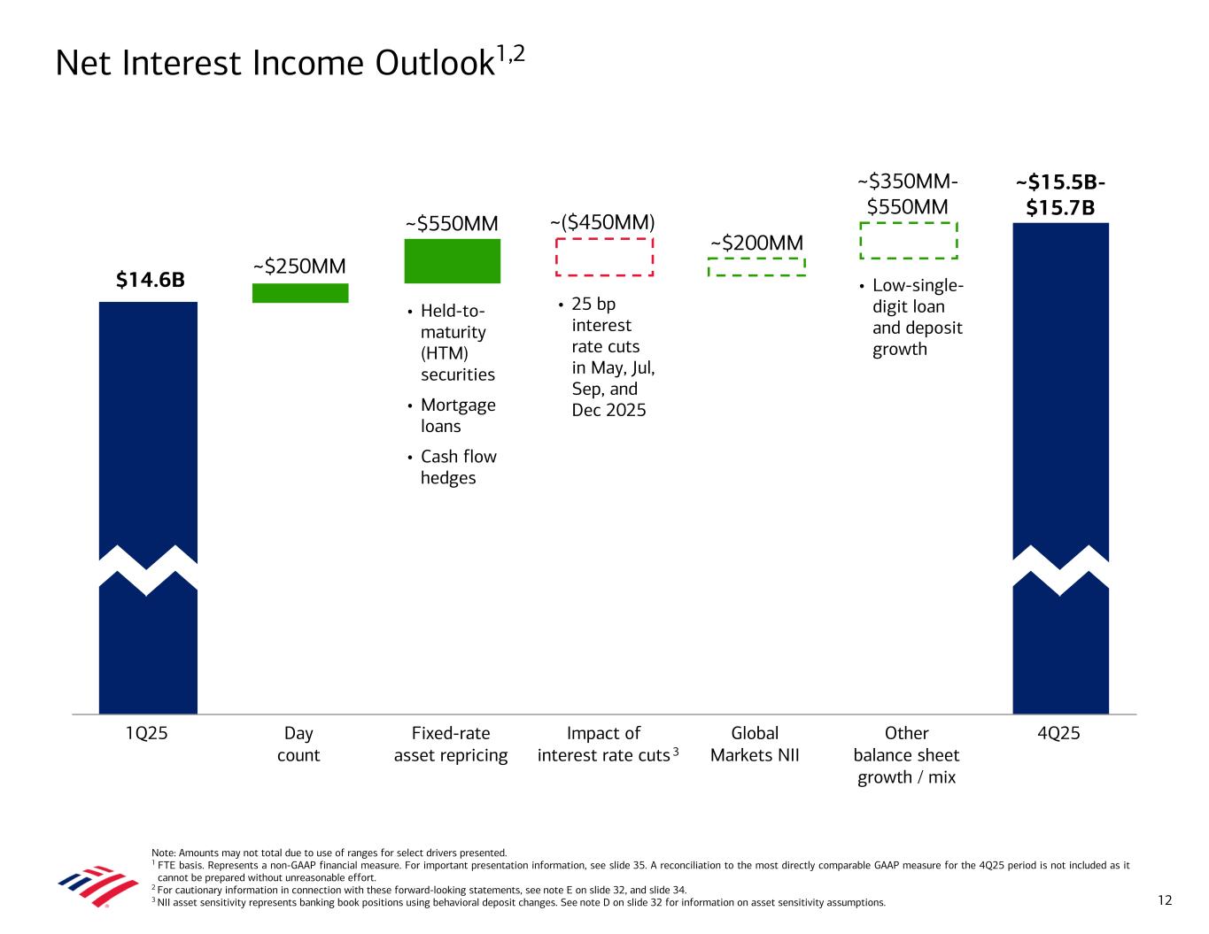 • Net interest income of $14.4B ($14.6B FTE)1 – Increased $0.1B from 4Q24, driven by lower deposit costs, higher NII related to Global Markets (GM) activity, and fixed-rate asset repricing, partially offset by the impact of lower interest rates and ~($250MM) from two fewer days of interest accrual – Increased $0.4B from 1Q24, as lower deposit costs, higher NII related to GM activity, and fixed-rate asset repricing more than offset the impact of lower interest rates and ~($125MM) from one less day of interest accrual • Net interest yield of 1.99% increased 2 bps from 4Q24 and was flat vs. 1Q24 – Blended cash and securities yield of 3.23% vs. total deposit rate paid of 1.79% – Excluding GM, net interest yield of 2.47%1 • 100 bps parallel shift below the March 31, 2025 forward interest rate yield curve is estimated to reduce net interest income by $2.2B over the next 12 months2 Net Interest Income (FTE, $B)1 Net Interest Income Net Interest Yield (FTE)1 Note: Amounts may not total due to rounding. 1 Represent non-GAAP financial measures. Net interest yield adjusted to exclude Global Markets NII of $1.2B, $1.0B, $0.9B, $0.8B, and $0.7B and average earning assets of $767.6B, $714.8B, $728.2B, $706.4B, and $692.9B for 1Q25, 4Q24, 3Q24, 2Q24, and 1Q24, respectively. The Corporation believes the presentation of NII and net interest yield excluding Global Markets provides investors with transparency of NII and net interest yield in core banking activities. For important presentation information, see slide 35. 2 As of March 31, 2025. NII asset sensitivity represents banking book positions using behavioral deposit changes. See note D on slide 32 for information on asset sensitivity assumptions. 1.99% 1.93% 1.92% 1.97% 1.99% 2.50% 2.41% 2.40% 2.42% 2.47% Reported net interest yield Net interest yield excl. GM 1Q24 2Q24 3Q24 4Q24 1Q25 1.50% 2.00% 2.50% 3.00% $14.2 $13.9 $14.1 $14.5 $14.6 $14.0 $13.7 $14.0 $14.4 $14.4 Net interest income (GAAP) FTE adjustment 1Q24 2Q24 3Q24 4Q24 1Q25 $0.0 $5.0 $10.0 $15.0 11 Net Interest Income Mix (FTE, $B)1 $14.2 $13.9 $14.1 $14.5 $14.6 $13.5 $13.1 $13.2 $13.5 $13.4 NII excl. GM GM NII 1Q24 2Q24 3Q24 4Q24 1Q25 $0.0 $5.0 $10.0 $15.0