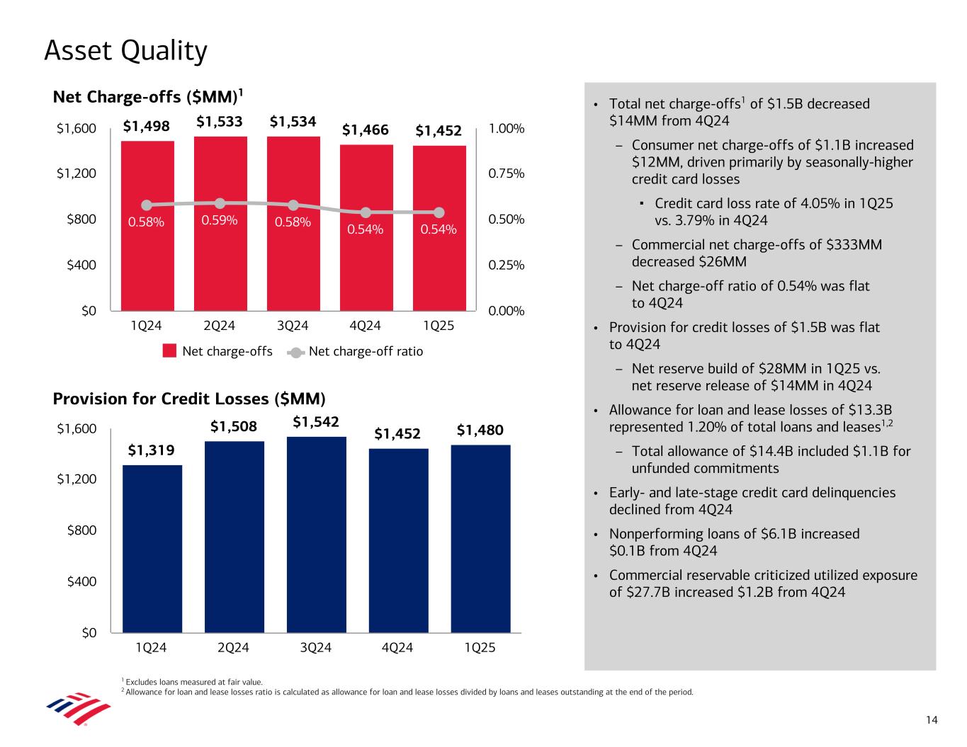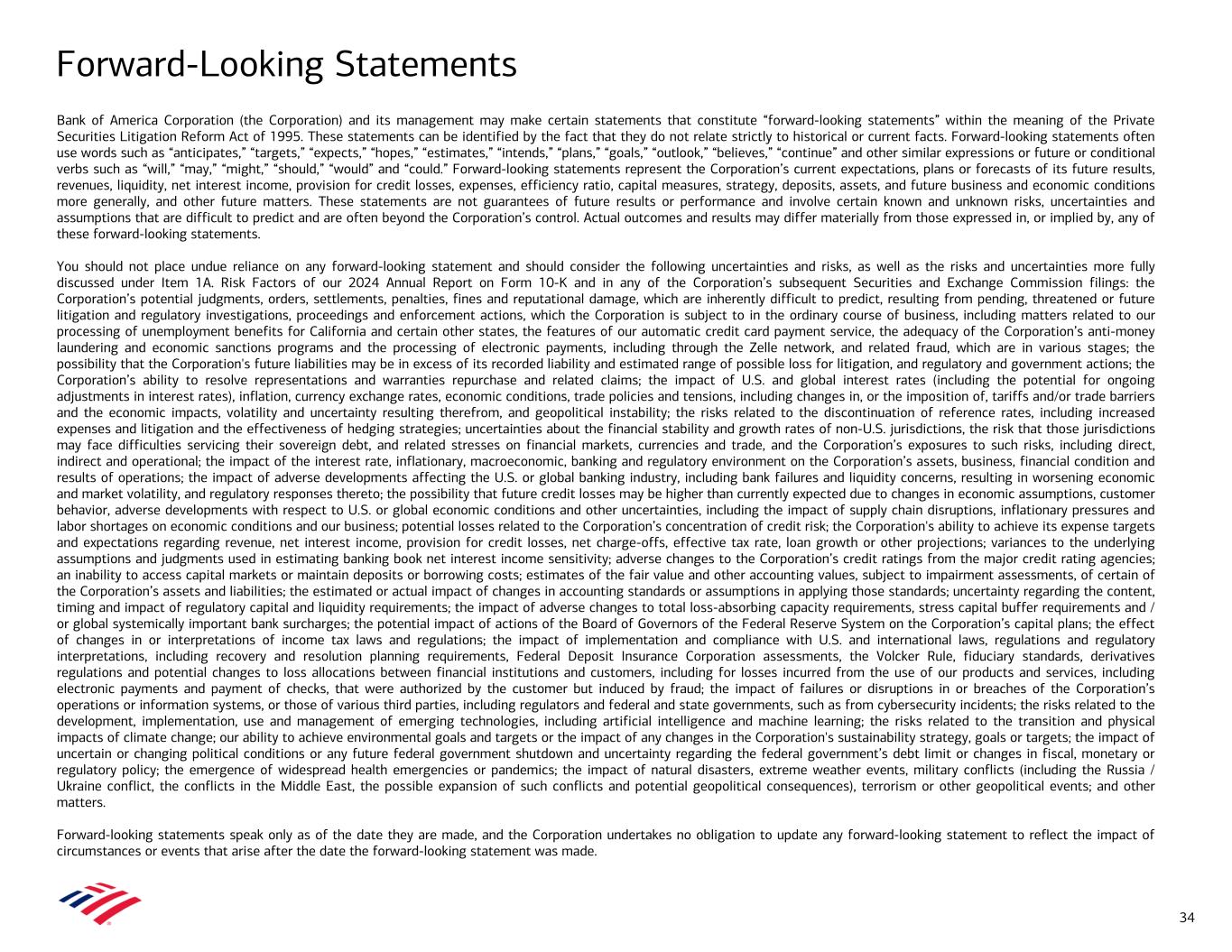 Forward-Looking Statements Bank of America Corporation (the Corporation) and its management may make certain statements that constitute “forward-looking statements” within the meaning of the Private Securities Litigation Reform Act of 1995. These statements can be identified by the fact that they do not relate strictly to historical or current facts. Forward-looking statements often use words such as “anticipates,” “targets,” “expects,” “hopes,” “estimates,” “intends,” “plans,” “goals,” “outlook,” “believes,” “continue” and other similar expressions or future or conditional verbs such as “will,” “may,” “might,” “should,” “would” and “could.” Forward-looking statements represent the Corporation’s current expectations, plans or forecasts of its future results, revenues, liquidity, net interest income, provision for credit losses, expenses, efficiency ratio, capital measures, strategy, deposits, assets, and future business and economic conditions more generally, and other future matters. These statements are not guarantees of future results or performance and involve certain known and unknown risks, uncertainties and assumptions that are difficult to predict and are often beyond the Corporation’s control. Actual outcomes and results may differ materially from those expressed in, or implied by, any of these forward-looking statements. You should not place undue reliance on any forward-looking statement and should consider the following uncertainties and risks, as well as the risks and uncertainties more fully discussed under Item 1A. Risk Factors of our 2024 Annual Report on Form 10-K and in any of the Corporation’s subsequent Securities and Exchange Commission filings: the Corporation’s potential judgments, orders, settlements, penalties, fines and reputational damage, which are inherently difficult to predict, resulting from pending, threatened or future litigation and regulatory investigations, proceedings and enforcement actions, which the Corporation is subject to in the ordinary course of business, including matters related to our processing of unemployment benefits for California and certain other states, the features of our automatic credit card payment service, the adequacy of the Corporation’s anti-money laundering and economic sanctions programs and the processing of electronic payments, including through the Zelle network, and related fraud, which are in various stages; the possibility that the Corporation's future liabilities may be in excess of its recorded liability and estimated range of possible loss for litigation, and regulatory and government actions; the Corporation’s ability to resolve representations and warranties repurchase and related claims; the impact of U.S. and global interest rates (including the potential for ongoing adjustments in interest rates), inflation, currency exchange rates, economic conditions, trade policies and tensions, including changes in, or the imposition of, tariffs and/or trade barriers and the economic impacts, volatility and uncertainty resulting therefrom, and geopolitical instability; the risks related to the discontinuation of reference rates, including increased expenses and litigation and the effectiveness of hedging strategies; uncertainties about the financial stability and growth rates of non-U.S. jurisdictions, the risk that those jurisdictions may face difficulties servicing their sovereign debt, and related stresses on financial markets, currencies and trade, and the Corporation’s exposures to such risks, including direct, indirect and operational; the impact of the interest rate, inflationary, macroeconomic, banking and regulatory environment on the Corporation’s assets, business, financial condition and results of operations; the impact of adverse developments affecting the U.S. or global banking industry, including bank failures and liquidity concerns, resulting in worsening economic and market volatility, and regulatory responses thereto; the possibility that future credit losses may be higher than currently expected due to changes in economic assumptions, customer behavior, adverse developments with respect to U.S. or global economic conditions and other uncertainties, including the impact of supply chain disruptions, inflationary pressures and labor shortages on economic conditions and our business; potential losses related to the Corporation’s concentration of credit risk; the Corporation's ability to achieve its expense targets and expectations regarding revenue, net interest income, provision for credit losses, net charge-offs, effective tax rate, loan growth or other projections; variances to the underlying assumptions and judgments used in estimating banking book net interest income sensitivity; adverse changes to the Corporation’s credit ratings from the major credit rating agencies; an inability to access capital markets or maintain deposits or borrowing costs; estimates of the fair value and other accounting values, subject to impairment assessments, of certain of the Corporation’s assets and liabilities; the estimated or actual impact of changes in accounting standards or assumptions in applying those standards; uncertainty regarding the content, timing and impact of regulatory capital and liquidity requirements; the impact of adverse changes to total loss-absorbing capacity requirements, stress capital buffer requirements and / or global systemically important bank surcharges; the potential impact of actions of the Board of Governors of the Federal Reserve System on the Corporation’s capital plans; the effect of changes in or interpretations of income tax laws and regulations; the impact of implementation and compliance with U.S. and international laws, regulations and regulatory interpretations, including recovery and resolution planning requirements, Federal Deposit Insurance Corporation assessments, the Volcker Rule