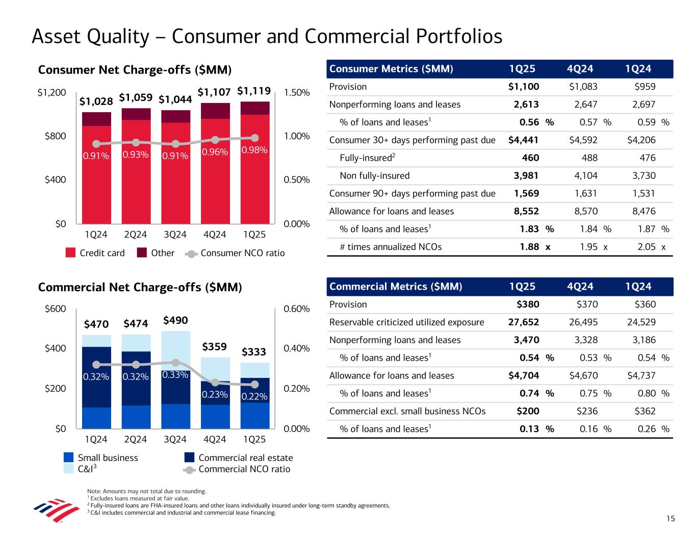 Asset Quality 1 Excludes loans measured at fair value. 2 Allowance for loan and lease losses ratio is calculated as allowance for loan and lease losses divided by loans and leases outstanding at the end of the period. Provision for Credit Losses ($MM) Net Charge-offs ($MM)1 $1,319 $1,508 $1,542 $1,452 $1,480 1Q24 2Q24 3Q24 4Q24 1Q25 $0 $400 $800 $1,200 $1,600 $1,498 $1,533 $1,534 $1,466 $1,452 0.58% 0.59% 0.58% 0.54% 0.54% Net charge-offs Net charge-off ratio 1Q24 2Q24 3Q24 4Q24 1Q25 $0 $400 $800 $1,200 $1,600 0.00% 0.25% 0.50% 0.75% 1.00% 14 • Total net charge-offs1 of $1.5B decreased $14MM from 4Q24 – Consumer net charge-offs of $1.1B increased $12MM, driven primarily by seasonally-higher credit card losses ▪ Credit card loss rate of 4.05% in 1Q25 vs. 3.79% in 4Q24 – Commercial net charge-offs of $333MM decreased $26MM – Net charge-off ratio of 0.54% was flat to 4Q24 • Provision for credit losses of $1.5B was flat to 4Q24 – Net reserve build of $28MM in 1Q25 vs. net reserve release of $14MM in 4Q24 • Allowance for loan and lease losses of $13.3B represented 1.20% of total loans and leases1,2 – Total allowance of $14.4B included $1.1B for unfunded commitments • Early- and late-stage credit card delinquencies declined from 4Q24 • Nonperforming loans of $6.1B increased $0.1B from 4Q24 • Commercial reservable criticized utilized exposure of $27.7B increased $1.2B from 4Q24