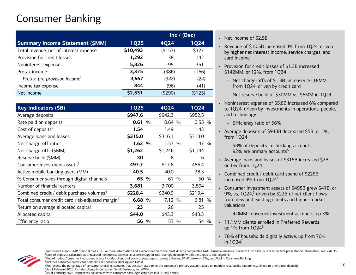 • Net income of $2.5B • Revenue of $10.5B increased 3% from 1Q24, driven by higher net interest income, service charges, and card income • Provision for credit losses of $1.3B increased $142MM, or 12%, from 1Q24 – Net charge-offs of $1.3B increased $118MM from 1Q24, driven by credit card – Net reserve build of $30MM vs. $6MM in 1Q24 • Noninterest expense of $5.8B increased 6% compared to 1Q24, driven by investments in operations, people, and technology – Efficiency ratio of 56% • Average deposits of $948B decreased $5B, or 1%, from 1Q24 – 58% of deposits in checking accounts; 92% are primary accounts5 • Average loans and leases of $315B increased $2B, or 1%, from 1Q24 • Combined credit / debit card spend of $228B increased 4% from 1Q244 • Consumer investment assets of $498B grew $41B, or 9%, vs. 1Q24,3 driven by $22B of net client flows from new and existing clients and higher market valuations – 4.0MM consumer investment accounts, up 3% • 11.1MM clients enrolled in Preferred Rewards, up 1% from 1Q246 • 78% of households digitally active, up from 76% in 1Q247 Consumer Banking 1 Represents a non-GAAP financial measure. For more information and a reconciliation to the most directly comparable GAAP financial measure, see note C on slide 32. For important presentation information, see slide 35. 2 Cost of deposits calculated as annualized noninterest expense as a percentage of total average deposits within the Deposits sub-segment. 3 End of period. Consumer investment assets includes client brokerage assets, deposit sweep balances, BANA brokered CDs, and AUM in Consumer Banking. 4 Includes consumer credit card portfolios in Consumer Banking and GWIM. 5 Represents the percentage of consumer checking accounts that are estimated to be the customer’s primary account based on multiple relationship factors (e.g., linked to their direct deposit). 6 As of February 2025. Includes clients in Consumer, Small Business, and GWIM. 7 As of February 2025. Represents households with consumer bank login activities in a 90-day period. Inc / (Dec) Summary Income Statement ($MM) 1Q25 4Q24 1Q24 Total revenue, net of interest expense $10,493 ($153) $327 Provision for credit losses 1,292 38 142 Noninterest expense 5,826 195 351 Pretax income 3,375 (386) (166) Pretax, pre-provision income1 4,667 (348) (24) Income tax expense 844 (96) (41) Net income $2,531 ($290) ($125) Key Indicators ($B) 1Q25 4Q24 1Q24 Average deposits $947.6 $942.3 $952.5 Rate paid on deposits 0.61 % 0.64 % 0.55 % Cost of deposits2 1.54 1.49 1.43 Average loans and leases $315.0 $316.1 $313.0 Net charge-off ratio 1.62 % 1.57 % 1.47 % Net charge-offs ($MM) $1,262 $1,246 $1,144 Reserve build ($MM) 30 8 6 Consumer investment assets3 497.7 517.8 456.4 Active mobile banking users (MM) 40.5 40.0 38.5 % Consumer sales through digital channels 65 % 61 % 50 % Number of financial centers 3,681 3,700 3,804 Combined credit / debit purchase volumes4 $228.4 $240.9 $219.4 Total consumer credit card risk-adjusted margin4 6.68 % 7.12 % 6.81 % Return on average allocated capital 23 26 25 Allocated capital $44.0 $43.3 $43.3 Efficiency ratio 56 % 53 % 54 % 16