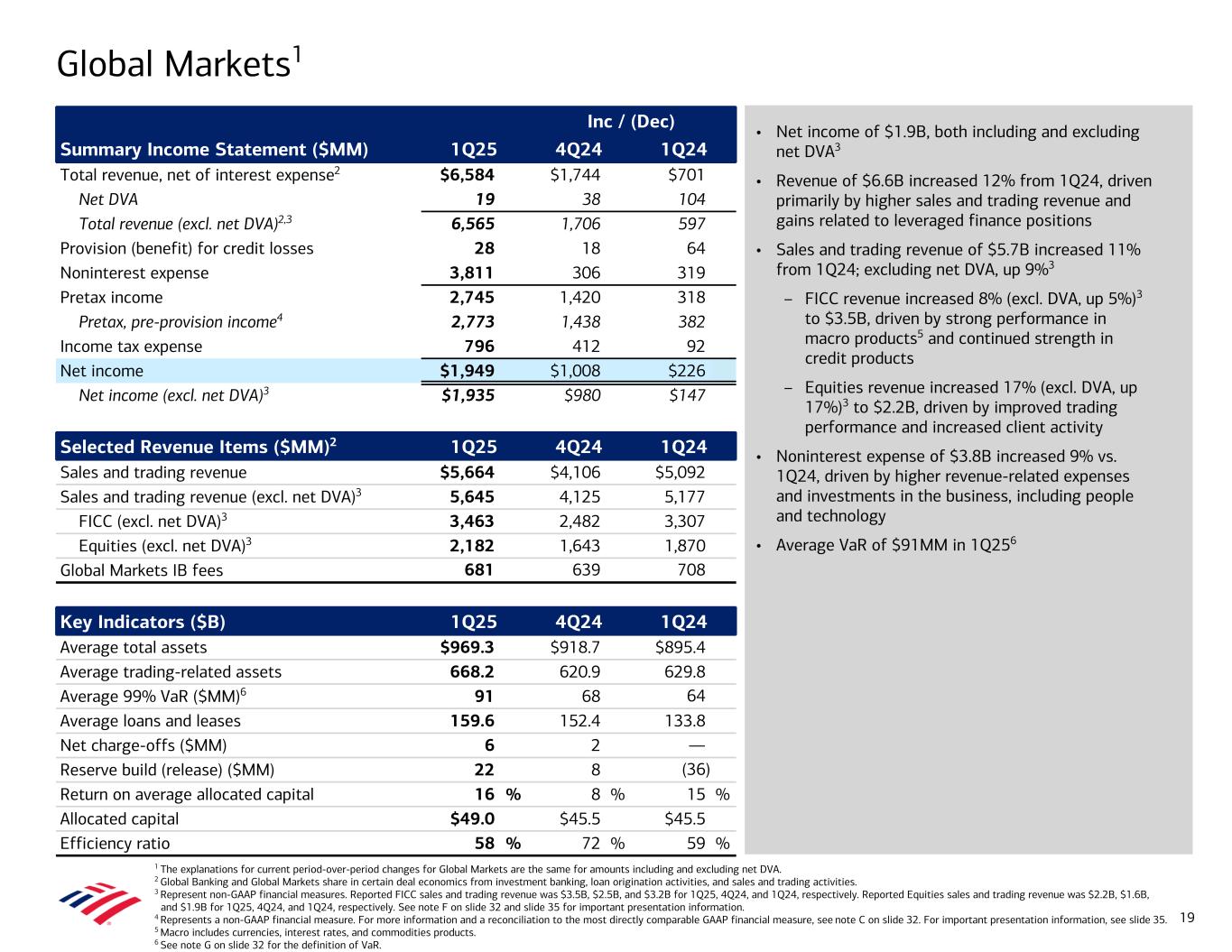 • Net income of $1.9B • Revenue of $6.0B was flat vs. 1Q24, as gains related to leveraged finance positions and higher treasury service charges were offset by lower net interest income – Total Corporation investment banking fees (ex. self-led) of $1.5B decreased 3% vs. 1Q24 ▪ Market share improved 23 bps from 1Q24; #3 investment banking fee ranking3 • Provision for credit losses of $154MM decreased $75MM, or 33%, from 1Q24 – Net charge-offs of $187MM decreased $163MM from 1Q24, driven by lower commercial real estate office losses – Net reserve release of $33MM vs. $121MM in 1Q24 • Noninterest expense of $3.2B increased 6% vs. 1Q24, driven by investments in the business, including technology and operations • Average deposits of $575B increased $49B, or 9%, from 1Q24 • Average loans and leases of $379B increased $5B, or 1%, from 1Q24 Global Banking 1 Global Banking and Global Markets share in certain deal economics from investment banking, loan origination activities, and sales and trading activities. 2 Represents a non-GAAP financial measure. For more information and a reconciliation to the most directly comparable GAAP financial measure, see note C on slide 32. For important presentation information, see slide 35. 3 Source: Dealogic as of March 31, 2025. Inc / (Dec) Summary Income Statement ($MM) 1Q25 4Q24 1Q24 Total revenue, net of interest expense1 $5,977 ($114) ($3) Provision for credit losses 154 (36) (75) Noninterest expense 3,184 233 172 Pretax income 2,639 (311) (100) Pretax, pre-provision income2 2,793 (347) (175) Income tax expense 726 (85) (27) Net income $1,913 ($226) ($73) Selected Revenue Items ($MM) 1Q25 4Q24 1Q24 Total Corporation IB fees (excl. self-led)1 $1,523 $1,654 $1,568 Global Banking IB fees1 847 985 850 Business Lending revenue 2,097 2,347 2,404 Global Transaction Services revenue 2,680 2,698 2,666 Key Indicators ($B) 1Q25 4Q24 1Q24 Average deposits $575.2 $582.0 $525.7 Average loans and leases 378.7 375.3 373.6 Net charge-off ratio 0.20 % 0.23 % 0.38 % Net charge-offs ($MM) $187 $220 $350 Reserve build (release) ($MM) (33) (30) (121) Return on average allocated capital 15 % 17 % 16 % Allocated capital $50.8 $49.3 $49.3 Efficiency ratio 53 % 48 % 50 % 18