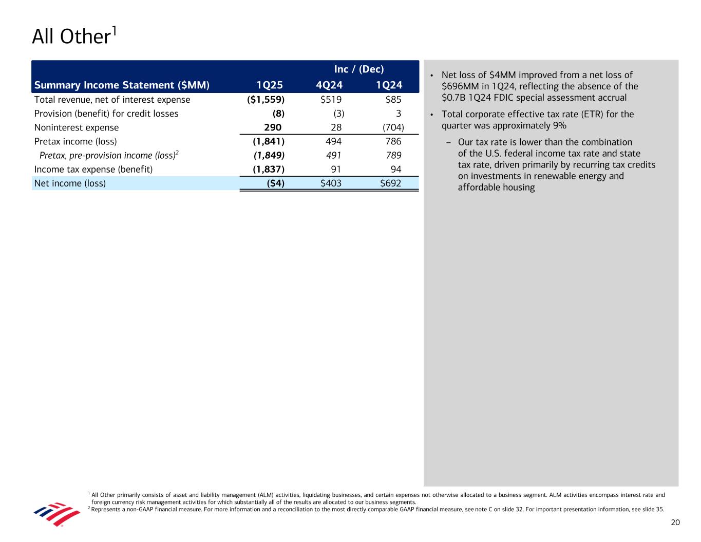 • Net income of $1.9B, both including and excluding net DVA3 • Revenue of $6.6B increased 12% from 1Q24, driven primarily by higher sales and trading revenue and gains related to leveraged finance positions • Sales and trading revenue of $5.7B increased 11% from 1Q24; excluding net DVA, up 9%3 – FICC revenue increased 8% (excl. DVA, up 5%)3 to $3.5B, driven by strong performance in macro products5 and continued strength in credit products – Equities revenue increased 17% (excl. DVA, up 17%)3 to $2.2B, driven by improved trading performance and increased client activity • Noninterest expense of $3.8B increased 9% vs. 1Q24, driven by higher revenue-related expenses and investments in the business, including people and technology • Average VaR of $91MM in 1Q256 Global Markets1 1 The explanations for current period-over-period changes for Global Markets are the same for amounts including and excluding net DVA. 2 Global Banking and Global Markets share in certain deal economics from investment banking, loan origination activities, and sales and trading activities. 3 Represent non-GAAP financial measures. Reported FICC sales and trading revenue was $3.5B, $2.5B, and $3.2B for 1Q25, 4Q24, and 1Q24, respectively. Reported Equities sales and trading revenue was $2.2B, $1.6B, and $1.9B for 1Q25, 4Q24, and 1Q24, respectively. See note F on slide 32 and slide 35 for important presentation information. 4 Represents a non-GAAP financial measure. For more information and a reconciliation to the most directly comparable GAAP financial measure, see note C on slide 32. For important presentation information, see slide 35. 5 Macro includes currencies, interest rates, and commodities products. 6 See note G on slide 32 for the definition of VaR. Inc / (Dec) Summary Income Statement ($MM) 1Q25 4Q24 1Q24 Total revenue, net of interest expense2 $6,584 $1,744 $701 Net DVA 19 38 104 Total revenue (excl. net DVA)2,3 6,565 1,706 597 Provision (benefit) for credit losses 28 18 64 Noninterest expense 3,811 306 319 Pretax income 2,745 1,420 318 Pretax, pre-provision income4 2,773 1,438 382 Income tax expense 796 412 92 Net income $1,949 $1,008 $226 Net income (excl. net DVA)3 $1,935 $980 $147 Selected Revenue Items ($MM)2 1Q25 4Q24 1Q24 Sales and trading revenue $5,664 $4,106 $5,092 Sales and trading revenue (excl. net DVA)3 5,645 4,125 5,177 FICC (excl. net DVA)3 3,463 2,482 3,307 Equities (excl. net DVA)3 2,182 1,643 1,870 Global Markets IB fees 681 639 708 Key Indicators ($B) 1Q25 4Q24 1Q24 Average total assets $969.3 $918.7 $895.4 Average trading-related assets 668.2 620.9 629.8 Average 99% VaR ($MM)6 91 68 64 Average loans and leases 159.6 152.4 133.8 Net charge-offs ($MM) 6 2 — Reserve build (release) ($MM) 22 8 (36) Return on average allocated capital 16 % 8 % 15 % Allocated capital $49.0 $45.5 $45.5 Efficiency ratio 58 % 72 % 59 % 19
