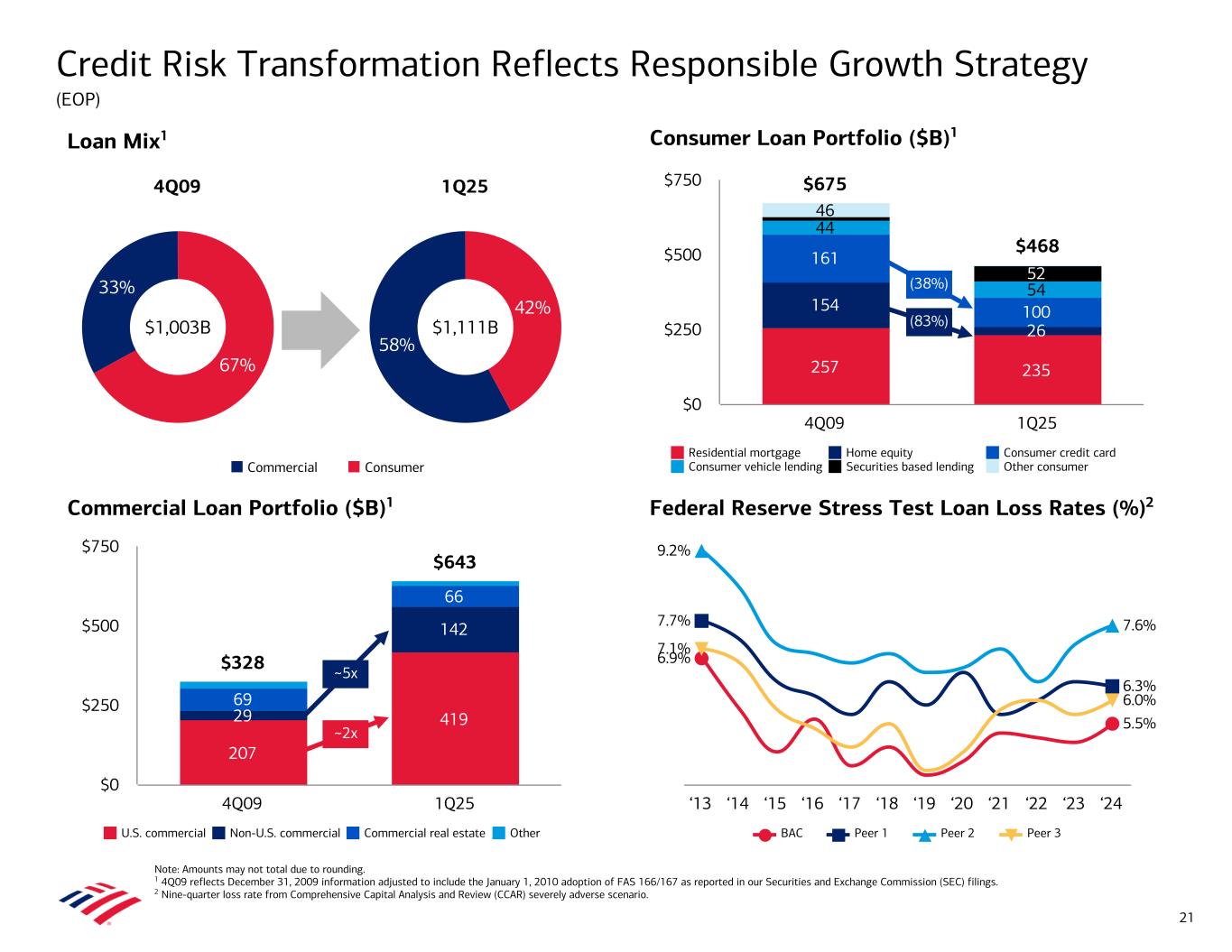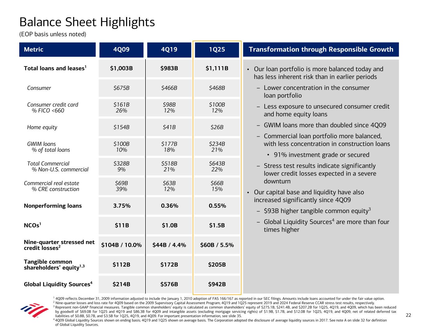 $675 $468 257 235 154 26 161 100 44 54 52 46 Residential mortgage Home equity Consumer credit card Consumer vehicle lending Securities based lending Other consumer 4Q09 1Q25 $0 $250 $500 $750 Credit Risk Transformation Reflects Responsible Growth Strategy (EOP) Note: Amounts may not total due to rounding. 1 4Q09 reflects December 31, 2009 information adjusted to include the January 1, 2010 adoption of FAS 166/167 as reported in our Securities and Exchange Commission (SEC) filings. 2 Nine-quarter loss rate from Comprehensive Capital Analysis and Review (CCAR) severely adverse scenario. Consumer Loan Portfolio ($B)1 Commercial Loan Portfolio ($B)1 Federal Reserve Stress Test Loan Loss Rates (%)2 Loan Mix1 21 $328 $643 207 41929 142 69 66 U.S. commercial Non-U.S. commercial Commercial real estate Other 4Q09 1Q25 $0 $250 $500 $750 4Q09 67% 33% 1Q25 42% 58% $1,111B$1,003B 6.9% 5.5% 7.7% 6.3% 9.2% 7.6% 7.1% 6.0% BAC Peer 1 Peer 2 Peer 3 ‘13 ‘14 ‘15 ‘16 ‘17 ‘18 ‘19 ‘20 ‘21 ‘22 ‘23 ‘24 (38%) (83%) ~2x ~5x Commercial Consumer