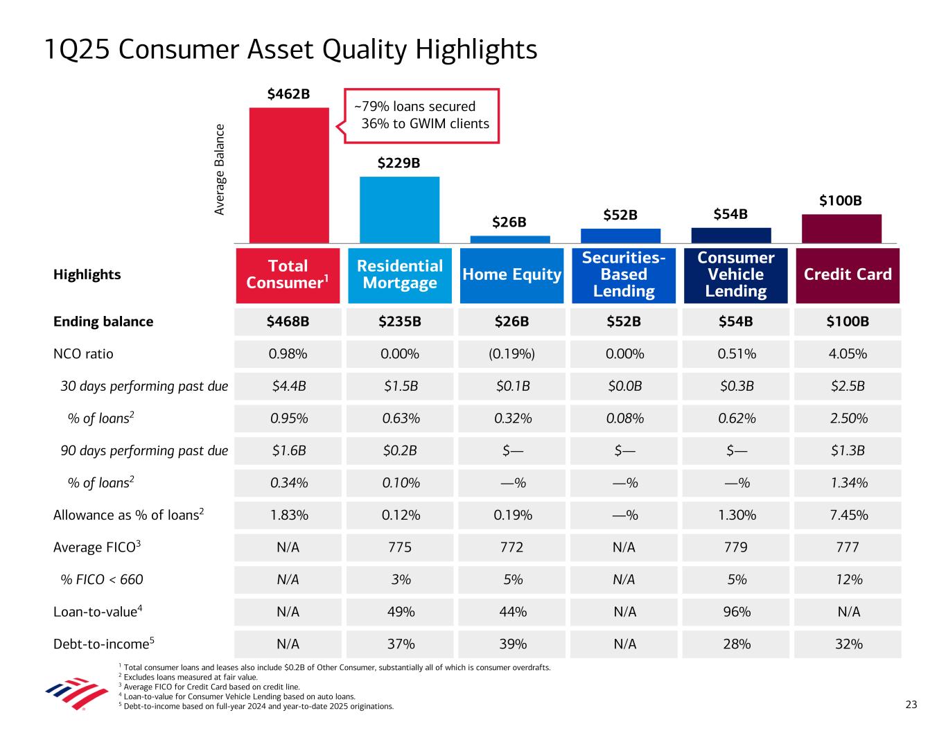 1 Total consumer loans and leases also include $0.2B of Other Consumer, substantially all of which is consumer overdrafts. 2 Excludes loans measured at fair value. 3 Average FICO for Credit Card based on credit line. 4 Loan-to-value for Consumer Vehicle Lending based on auto loans. 5 Debt-to-income based on full-year 2024 and year-to-date 2025 originations. Highlights Total Consumer1 Residential Mortgage Home Equity Securities- Based Lending Consumer Vehicle Lending Credit Card Ending balance $468B $235B $26B $52B $54B $100B NCO ratio 0.98% 0.00% (0.19%) 0.00% 0.51% 4.05% 30 days performing past due $4.4B $1.5B $0.1B $0.0B $0.3B $2.5B % of loans2 0.95% 0.63% 0.32% 0.08% 0.62% 2.50% 90 days performing past due $1.6B $0.2B $— $— $— $1.3B % of loans2 0.34% 0.10% —% —% —% 1.34% Allowance as % of loans2 1.83% 0.12% 0.19% —% 1.30% 7.45% Average FICO3 N/A 775 772 N/A 779 777 % FICO < 660 N/A 3% 5% N/A 5% 12% Loan-to-value4 N/A 49% 44% N/A 96% N/A Debt-to-income5 N/A 37% 39% N/A 28% 32% 1Q25 Consumer Asset Quality Highlights 23 Av er ag e B al an ce $462B $229B $26B $52B $54B $100B ~79% loans secured 36% to GWIM clients