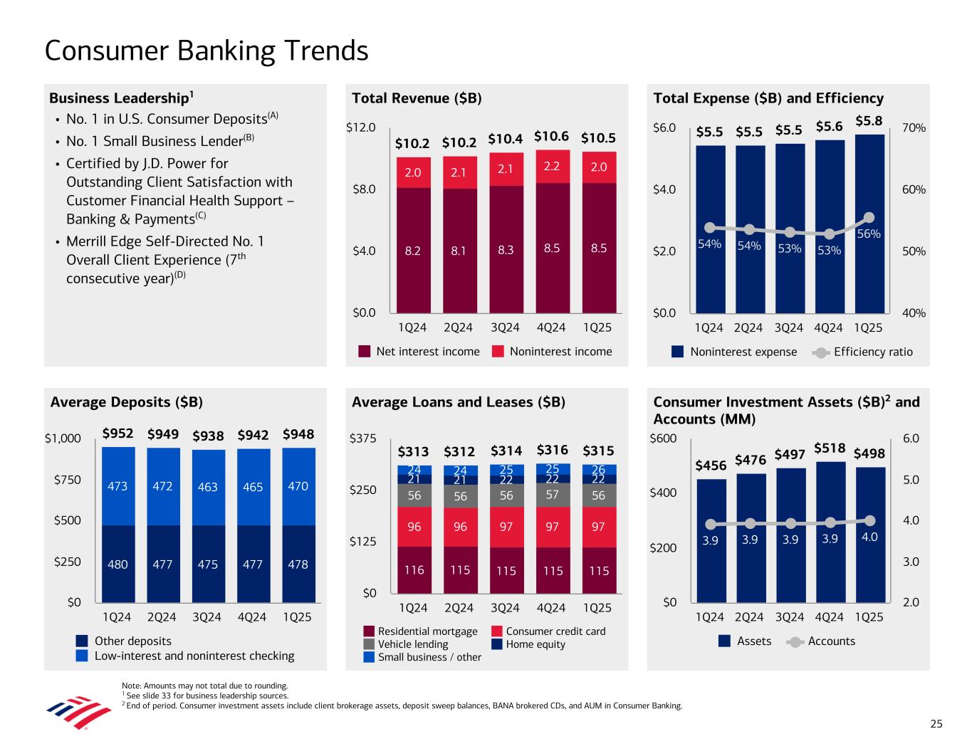 Total Expense ($B) and Efficiency Total Revenue ($B) Average Deposits ($B) Consumer Investment Assets ($B)2 and Accounts (MM) Average Loans and Leases ($B) Consumer Banking Trends Note: Amounts may not total due to rounding. 1 See slide 33 for business leadership sources. 2 End of period. Consumer investment assets include client brokerage assets, deposit sweep balances, BANA brokered CDs, and AUM in Consumer Banking. $10.2 $10.2 $10.4 $10.6 $10.5 8.2 8.1 8.3 8.5 8.5 2.0 2.1 2.1 2.2 2.0 Net interest income Noninterest income 1Q24 2Q24 3Q24 4Q24 1Q25 $0.0 $4.0 $8.0 $12.0 $5.5 $5.5 $5.5 $5.6 $5.8 54% 54% 53% 53% 56% Noninterest expense Efficiency ratio 1Q24 2Q24 3Q24 4Q24 1Q25 $0.0 $2.0 $4.0 $6.0 40% 50% 60% 70% $952 $949 $938 $942 $948 480 477 475 477 478 473 472 463 465 470 Other deposits Low-interest and noninterest checking 1Q24 2Q24 3Q24 4Q24 1Q25 $0 $250 $500 $750 $1,000 $313 $312 $314 $316 $315 116 115 115 115 115 96 96 97 97 97 56 56 56 57 56 21 21 22 22 22 24 24 25 25 26 Residential mortgage Consumer credit card Vehicle lending Home equity Small business / other 1Q24 2Q24 3Q24 4Q24 1Q25 $0 $125 $250 $375 25 $456 $476 $497 $518 $498 3.9 3.9 3.9 3.9 4.0 Assets Accounts 1Q24 2Q24 3Q24 4Q24 1Q25 $0 $200 $400 $600 2.0 3.0 4.0 5.0 6.0 Business Leadership1 • No. 1 in U.S. Consumer Deposits(A) • No. 1 Small Business Lender(B) • Certified by J.D. Power for Outstanding Client Satisfaction with Customer Financial Health Support – Banking & Payments(C) • Merrill Edge Self-Directed No. 1 Overall Client Experience (7th consecutive year)(D)