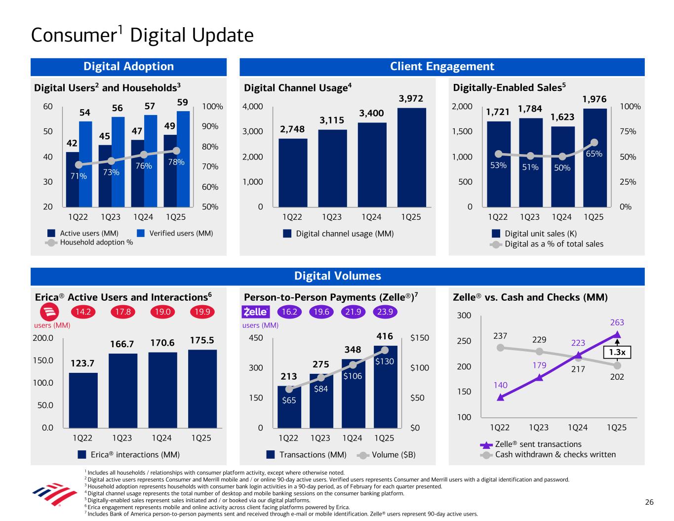Erica® Interactions (MM)5 1.8 2.6 3.0 3.5 1Q22 1Q23 1Q24 1Q25 0.0 1.0 2.0 3.0 4.0 Person-to-Person Payments (Zelle®)6 Check Deposits7 eDelivery4Digital Households / Relationships2 Digital Channel Adoption3 74% 77% 79% 82% 1Q22 1Q23 1Q24 1Q25 0% 25% 50% 75% 100% 56% 58% 62% 64% 75% 77% 80% 81% Mobile adoption Online adoption 1Q22 1Q23 1Q24 1Q25 0% 25% 50% 75% 100% 688 717 748 759 81% 84% 86% 87% Digital households / relationships (K) Digital adoption % 1Q22 1Q23 1Q24 1Q25 400 500 600 700 800 60% 70% 80% 90% 100% Client Engagement Digital Volumes Global Wealth & Investment Management Digital Update 28 Digital Adoption1 2.0 2.7 3.6 4.2 $1.2 $1.6 $2.2 $2.6 Transactions (MM) Volume ($B) 1Q22 1Q23 1Q24 1Q25 0.0 1.0 2.0 3.0 4.0 5.0 $0.0 $1.0 $2.0 $3.0 $4.0 64% 65% 67% 68% 10% 9% 8% 7% 26% 26% 25% 24% Digital ATM Physical 1Q22 1Q23 1Q24 1Q25 0% 25% 50% 75% 100% Note: Amounts may not total due to rounding. 1 Digital Adoption is the percentage of digitally active Merrill primary households ($250K+ in investable assets within the enterprise) and digitally active Private Bank core relationships ($3MM+ in total balances). Merrill excludes Stock Plan and Banking-only households. Private Bank includes third-party activities (effective 1Q23) and excludes Irrevocable Trust-only relationships, Institutional Philanthropic relationships, and exiting relationships. 2 Data as of February for 1Q22. 1Q23, 1Q24, and 1Q25 as of February for Private Bank and as of March for Merrill. 3 Digital channel adoption represents the percentage of desktop and mobile banking engagement, as of February for 1Q22 and 1Q23. 1Q24 and 1Q25 as of February for Private Bank and as of March for Merrill. 4 GWIM eDelivery percentage includes Merrill Digital Households (excluding Stock Plan, Banking-only households, Retirement-only, and 529-only) and Private Bank relationships that receive statements digitally, as of February for 1Q22, 1Q23, and 1Q24. 1Q25 as of February for Private Bank and as of March for Merrill. 5 Erica interactions represent mobile and online activity across client-facing platforms powered by Erica. 6 Includes Bank of America person-to-person payments sent and received through e-mail or mobile identification. 7 Digital check deposits include mobile check deposits and remote deposit operations. As of February for Private Bank and as of March for Merrill for each quarter presented.