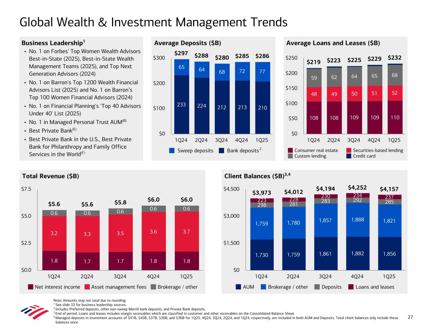 Note: Amounts may not total due to rounding. 1 See slide 33 for business leadership sources. 2 Includes Preferred deposits, other non-sweep Merrill bank deposits, and Private Bank deposits. 3 End of period. Loans and leases includes margin receivables which are classified in customer and other receivables on the Consolidated Balance Sheet. 4 Managed deposits in investment accounts of $41B, $45B, $37B, $36B, and $36B for 1Q25, 4Q24, 3Q24, 2Q24, and 1Q24, respectively, are included in both AUM and Deposits. Total client balances only include these balances once. Average Deposits ($B) Global Wealth & Investment Management Trends Business Leadership1 • No. 1 on Forbes' Top Women Wealth Advisors Best-in-State (2025), Best-in-State Wealth Management Teams (2025), and Top Next Generation Advisors (2024) • No. 1 on Barron's Top 1200 Wealth Financial Advisors List (2025) and No. 1 on Barron’s Top 100 Women Financial Advisors (2024) • No. 1 on Financial Planning's 'Top 40 Advisors Under 40' List (2025) • No. 1 in Managed Personal Trust AUM(B) • Best Private Bank(E) • Best Private Bank in the U.S., Best Private Bank for Philanthropy and Family Office Services in the World(F) Average Loans and Leases ($B) Total Revenue ($B) Client Balances ($B)3,4 $5.6 $5.6 $5.8 $6.0 $6.0 1.8 1.7 1.7 1.8 1.8 3.2 3.3 3.5 3.6 3.7 0.6 0.6 0.6 0.6 0.6 Net interest income Asset management fees Brokerage / other 1Q24 2Q24 3Q24 4Q24 1Q25 $0.0 $2.5 $5.0 $7.5 1,730 1,759 1,861 1,882 1,856 1,759 1,780 1,857 1,888 1,821 298 281 283 292 285223 228 230 234 237 $3,973 $4,012 $4,194 $4,252 $4,157 AUM Brokerage / other Deposits Loans and leases 1Q24 2Q24 3Q24 4Q24 1Q25 $0 $1,500 $3,000 $4,500 $219 $223 $225 $229 $232 108 108 109 109 110 48 49 50 51 52 59 62 64 65 68 Consumer real estate Securities-based lending Custom lending Credit card 1Q24 2Q24 3Q24 4Q24 1Q25 $0 $50 $100 $150 $200 $250 $297 $288 $280 $285 $286 233 224 212 213 210 65 64 68 72 77 Sweep deposits Bank deposits 1Q24 2Q24 3Q24 4Q24 1Q25 $0 $100 $200 $300 27 2