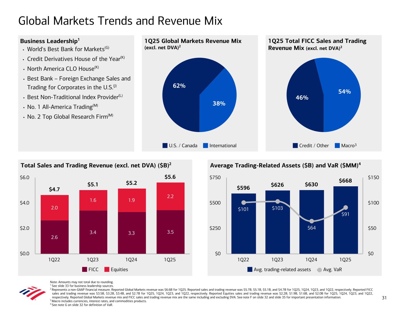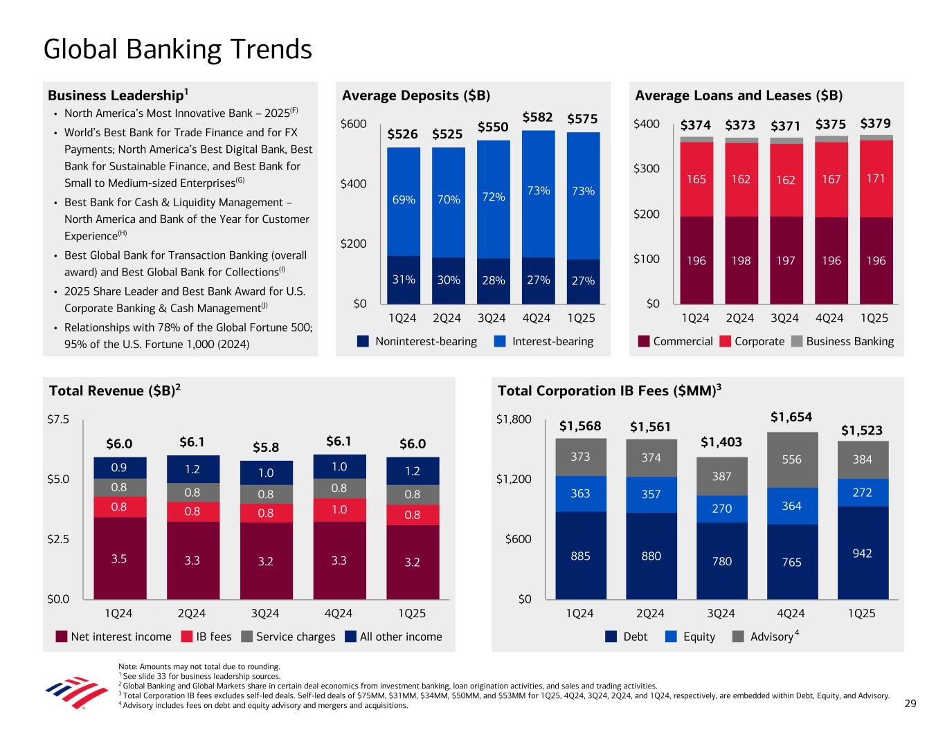 Global Banking Trends Note: Amounts may not total due to rounding. 1 See slide 33 for business leadership sources. 2 Global Banking and Global Markets share in certain deal economics from investment banking, loan origination activities, and sales and trading activities. 3 Total Corporation IB fees excludes self-led deals. Self-led deals of $75MM, $31MM, $34MM, $50MM, and $53MM for 1Q25, 4Q24, 3Q24, 2Q24, and 1Q24, respectively, are embedded within Debt, Equity, and Advisory. 4 Advisory includes fees on debt and equity advisory and mergers and acquisitions. Average Deposits ($B)Business Leadership1 • North America’s Most Innovative Bank – 2025(F) • World’s Best Bank for Trade Finance and for FX Payments; North America’s Best Digital Bank, Best Bank for Sustainable Finance, and Best Bank for Small to Medium-sized Enterprises(G) • Best Bank for Cash & Liquidity Management – North America and Bank of the Year for Customer Experience(H) • Best Global Bank for Transaction Banking (overall award) and Best Global Bank for Collections(I) • 2025 Share Leader and Best Bank Award for U.S. Corporate Banking & Cash Management(J) • Relationships with 78% of the Global Fortune 500; 95% of the U.S. Fortune 1,000 (2024) Average Loans and Leases ($B) Total Revenue ($B)2 Total Corporation IB Fees ($MM)3 $6.0 $6.1 $5.8 $6.1 $6.0 3.5 3.3 3.2 3.3 3.2 0.8 0.8 0.8 1.0 0.8 0.8 0.8 0.8 0.8 0.8 0.9 1.2 1.0 1.0 1.2 Net interest income IB fees Service charges All other income 1Q24 2Q24 3Q24 4Q24 1Q25 $0.0 $2.5 $5.0 $7.5 885 880 780 765 942 363 357 270 364 272 373 374 387 556 384 $1,568 $1,561 $1,403 $1,654 $1,523 Debt Equity Advisory 1Q24 2Q24 3Q24 4Q24 1Q25 $0 $600 $1,200 $1,800 196 198 197 196 196 165 162 162 167 171 $374 $373 $371 $375 $379 Commercial Corporate Business Banking 1Q24 2Q24 3Q24 4Q24 1Q25 $0 $100 $200 $300 $400 4 $526 $525 $550 $582 $575 Noninterest-bearing Interest-bearing 1Q24 2Q24 3Q24 4Q24 1Q25 $0 $200 $400 $600 29 31% 30% 28% 27% 27% 69% 70% 72% 73% 73%