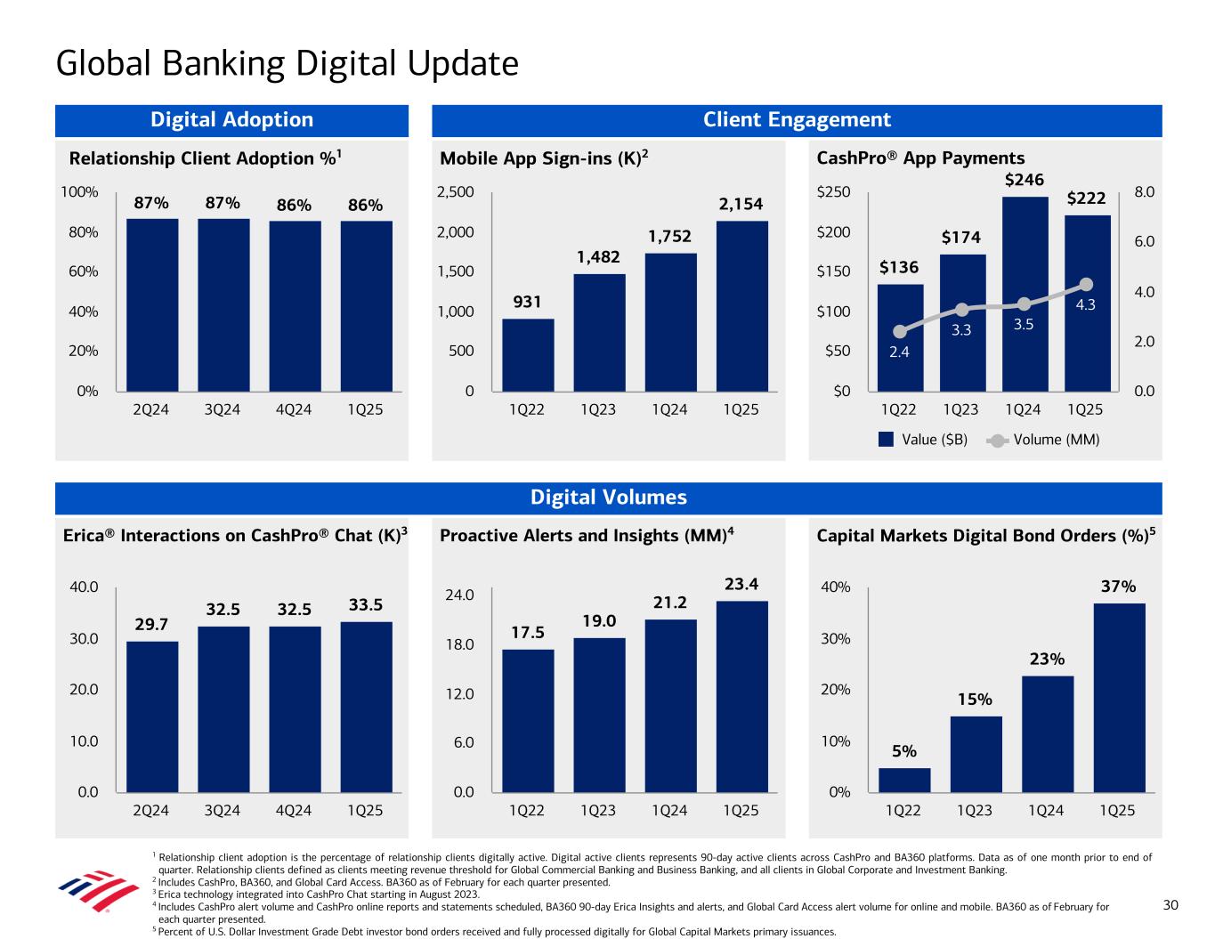 1 Relationship client adoption is the percentage of relationship clients digitally active. Digital active clients represents 90-day active clients across CashPro and BA360 platforms. Data as of one month prior to end of quarter. Relationship clients defined as clients meeting revenue threshold for Global Commercial Banking and Business Banking, and all clients in Global Corporate and Investment Banking. 2 Includes CashPro, BA360, and Global Card Access. BA360 as of February for each quarter presented. 3 Erica technology integrated into CashPro Chat starting in August 2023. 4 Includes CashPro alert volume and CashPro online reports and statements scheduled, BA360 90-day Erica Insights and alerts, and Global Card Access alert volume for online and mobile. BA360 as of February for each quarter presented. 5 Percent of U.S. Dollar Investment Grade Debt investor bond orders received and fully processed digitally for Global Capital Markets primary issuances. Capital Markets Digital Bond Orders (%)5 Erica® Interactions on CashPro® Chat (K)3 Proactive Alerts and Insights (MM)4 5% 15% 23% 37% 1Q22 1Q23 1Q24 1Q25 0% 10% 20% 30% 40% 17.5 19.0 21.2 23.4 1Q22 1Q23 1Q24 1Q25 0.0 6.0 12.0 18.0 24.0 29.7 32.5 32.5 33.5 2Q24 3Q24 4Q24 1Q25 0.0 10.0 20.0 30.0 40.0 CashPro® App PaymentsRelationship Client Adoption %1 Mobile App Sign-ins (K)2 $136 $174 $246 $222 2.4 3.3 3.5 4.3 Value ($B) Volume (MM) 1Q22 1Q23 1Q24 1Q25 $0 $50 $100 $150 $200 $250 0.0 2.0 4.0 6.0 8.0 931 1,482 1,752 2,154 1Q22 1Q23 1Q24 1Q25 0 500 1,000 1,500 2,000 2,500 87% 87% 86% 86% 2Q24 3Q24 4Q24 1Q25 0% 20% 40% 60% 80% 100% Client Engagement Digital Volumes Global Banking Digital Update 30 Digital Adoption