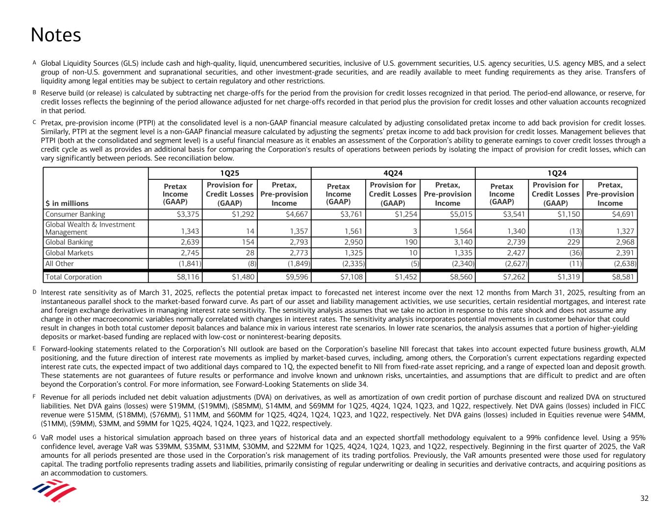 A Global Liquidity Sources (GLS) include cash and high-quality, liquid, unencumbered securities, inclusive of U.S. government securities, U.S. agency securities, U.S. agency MBS, and a select group of non-U.S. government and supranational securities, and other investment-grade securities, and are readily available to meet funding requirements as they arise. Transfers of liquidity among legal entities may be subject to certain regulatory and other restrictions. B Reserve build (or release) is calculated by subtracting net charge-offs for the period from the provision for credit losses recognized in that period. The period-end allowance, or reserve, for credit losses reflects the beginning of the period allowance adjusted for net charge-offs recorded in that period plus the provision for credit losses and other valuation accounts recognized in that period. C Pretax, pre-provision income (PTPI) at the consolidated level is a non-GAAP financial measure calculated by adjusting consolidated pretax income to add back provision for credit losses. Similarly, PTPI at the segment level is a non-GAAP financial measure calculated by adjusting the segments’ pretax income to add back provision for credit losses. Management believes that PTPI (both at the consolidated and segment level) is a useful financial measure as it enables an assessment of the Corporation’s ability to generate earnings to cover credit losses through a credit cycle as well as provides an additional basis for comparing the Corporation's results of operations between periods by isolating the impact of provision for credit losses, which can vary significantly between periods. See reconciliation below. D Interest rate sensitivity as of March 31, 2025, reflects the potential pretax impact to forecasted net interest income over the next 12 months from March 31, 2025, resulting from an instantaneous parallel shock to the market-based forward curve. As part of our asset and liability management activities, we use securities, certain residential mortgages, and interest rate and foreign exchange derivatives in managing interest rate sensitivity. The sensitivity analysis assumes that we take no action in response to this rate shock and does not assume any change in other macroeconomic variables normally correlated with changes in interest rates. The sensitivity analysis incorporates potential movements in customer behavior that could result in changes in both total customer deposit balances and balance mix in various interest rate scenarios. In lower rate scenarios, the analysis assumes that a portion of higher-yielding deposits or market-based funding are replaced with low-cost or noninterest-bearing deposits. E Forward-looking statements related to the Corporation’s NII outlook are based on the Corporation’s baseline NII forecast that takes into account expected future business growth, ALM positioning, and the future direction of interest rate movements as implied by market-based curves, including, among others, the Corporation’s current expectations regarding expected interest rate cuts, the expected impact of two additional days compared to 1Q, the expected benefit to NII from fixed-rate asset repricing, and a range of expected loan and deposit growth. These statements are not guarantees of future results or performance and involve known and unknown risks, uncertainties, and assumptions that are difficult to predict and are often beyond the Corporation’s control. For more information, see Forward-Looking Statements on slide 34. F Revenue for all periods included net debit valuation adjustments (DVA) on derivatives, as well as amortization of own credit portion of purchase discount and realized DVA on structured liabilities. Net DVA gains (losses) were $19MM, ($19MM), ($85MM), $14MM, and $69MM for 1Q25, 4Q24, 1Q24, 1Q23, and 1Q22, respectively. Net DVA gains (losses) included in FICC revenue were $15MM, ($18MM), ($76MM), $11MM, and $60MM for 1Q25, 4Q24, 1Q24, 1Q23, and 1Q22, respectively. Net DVA gains (losses) included in Equities revenue were $4MM, ($1MM), ($9MM), $3MM, and $9MM for 1Q25, 4Q24, 1Q24, 1Q23, and 1Q22, respectively. G VaR model uses a historical simulation approach based on three years of historical data and an expected shortfall methodology equivalent to a 99% confidence level. Using a 95% confidence level, average VaR was $39MM, $35MM, $31MM, $30MM, and $22MM for 1Q25, 4Q24, 1Q24, 1Q23, and 1Q22, respectively. Beginning in the first quarter of 2025, the VaR amounts for all periods presented are those used in the Corporation’s risk management of its trading portfolios. Previously, the VaR amounts presented were those used for regulatory capital. The trading portfolio represents trading assets and liabilities, primarily consisting of regular underwriting or dealing in securities and derivative contracts, and acquiring positions as an accommodation to customers. Notes $ in millions 1Q25 4Q24 1Q24 Pretax Income (GAAP) Provision for Credit Losses (GAAP) Pretax, Pre-provision Income Pretax Income (GAAP) Provision for Credit Losses (GAAP) Pretax, Pre-provision Income Pretax Income (GAAP) Provision for Credit Losses (GAAP) Pretax, Pre-provision Income Consumer Banking $3,375 $1,292 $4,667 $3,761 $1,254 $5,015 $3,541 $1,150 $4,691 Global Wealth & Investment Management 1,343 14 1,357 1,561 3 1,564 1,340 (13) 1,327 Global Banking 2,639 154 2,793 2,950 190 3,140 2,739 229 2,968 Global Markets 2,745 28 2,773 1,325 10 1,335 2,427 (36) 2,391 All Other (1,841) (8) (1,849) (2,335) (5) (2,340) (2,627) (11) (2,638) Total Corporation $8,116 $1,480 $9,596 $7,108 $1,452 $8,560 $7,262 $1,319 $8,581 32