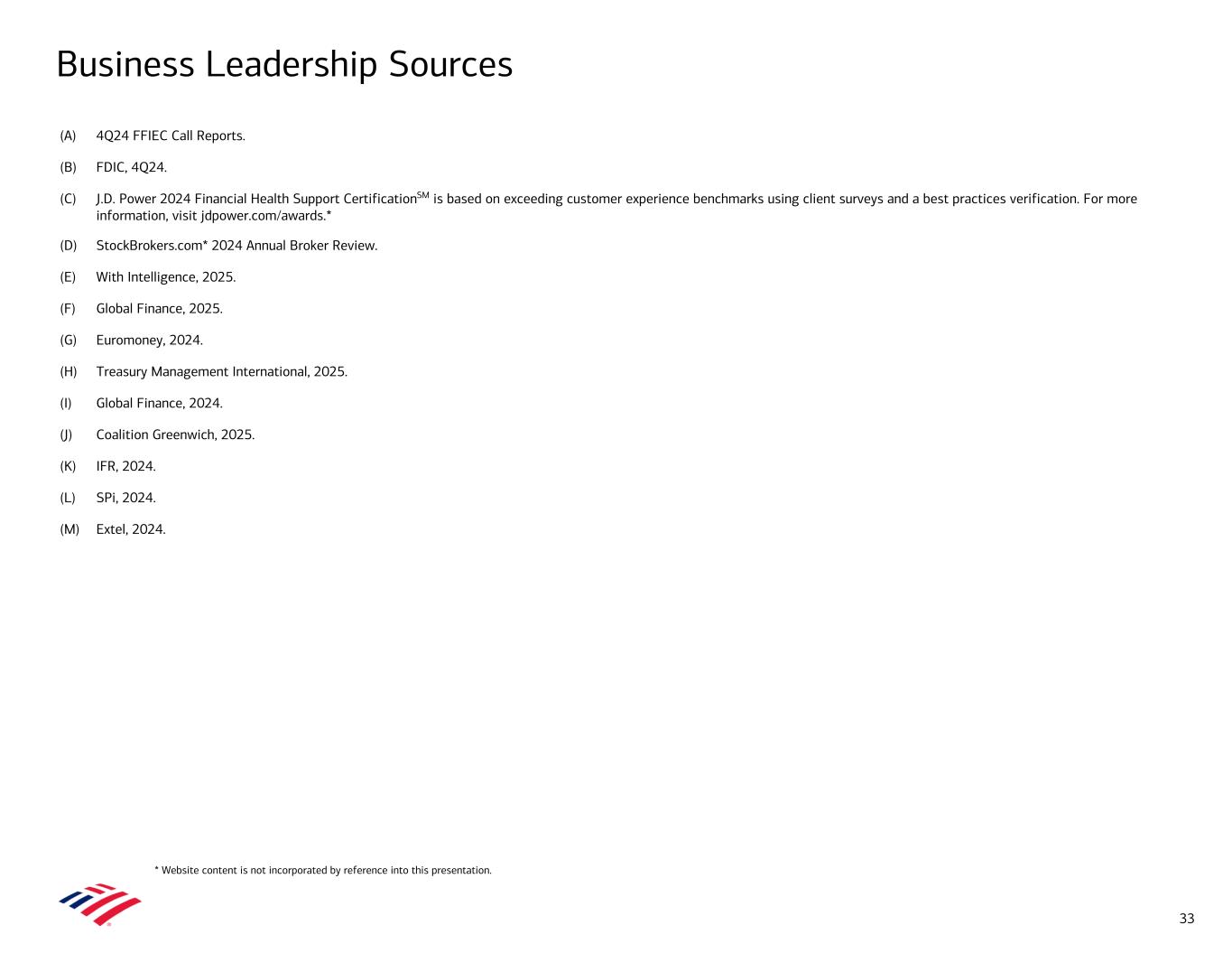 Business Leadership Sources (A) 4Q24 FFIEC Call Reports. (B) FDIC, 4Q24. (C) J.D. Power 2024 Financial Health Support CertificationSM is based on exceeding customer experience benchmarks using client surveys and a best practices verification. For more information, visit jdpower.com/awards.* (D) StockBrokers.com* 2024 Annual Broker Review. (E) With Intelligence, 2025. (F) Global Finance, 2025. (G) Euromoney, 2024. (H) Treasury Management International, 2025. (I) Global Finance, 2024. (J) Coalition Greenwich, 2025. (K) IFR, 2024. (L) SPi, 2024. (M) Extel, 2024. 33 * Website content is not incorporated by reference into this presentation.