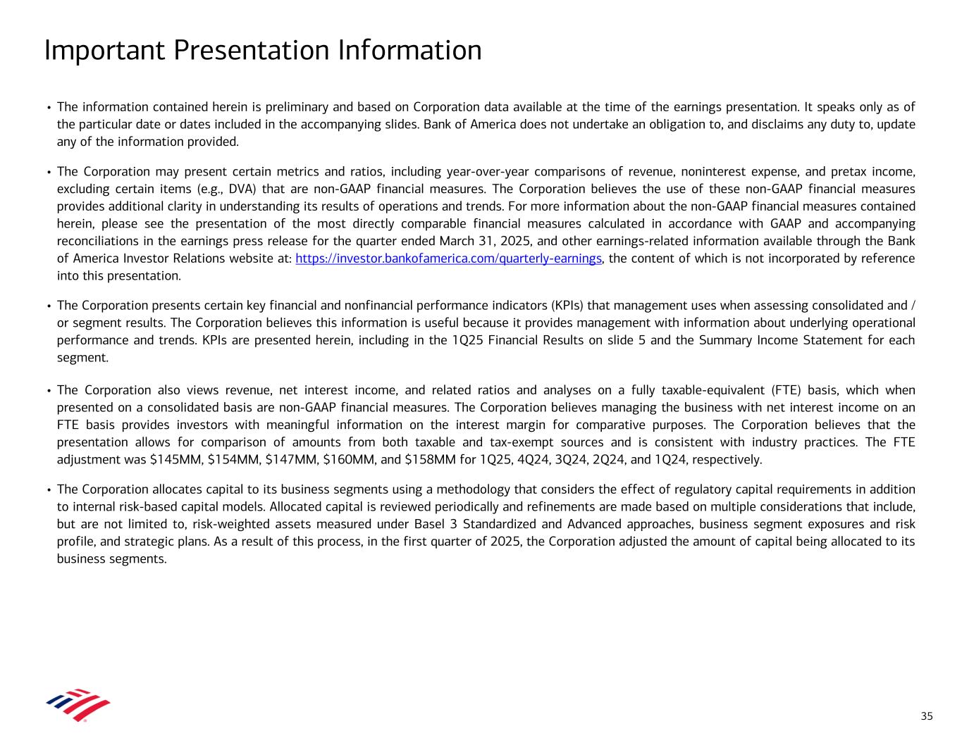 Important Presentation Information 35 • The information contained herein is preliminary and based on Corporation data available at the time of the earnings presentation. It speaks only as of the particular date or dates included in the accompanying slides. Bank of America does not undertake an obligation to, and disclaims any duty to, update any of the information provided. • The Corporation may present certain metrics and ratios, including year-over-year comparisons of revenue, noninterest expense, and pretax income, excluding certain items (e.g., DVA) that are non-GAAP financial measures. The Corporation believes the use of these non-GAAP financial measures provides additional clarity in understanding its results of operations and trends. For more information about the non-GAAP financial measures contained herein, please see the presentation of the most directly comparable financial measures calculated in accordance with GAAP and accompanying reconciliations in the earnings press release for the quarter ended March 31, 2025, and other earnings-related information available through the Bank of America Investor Relations website at: https://investor.bankofamerica.com/quarterly-earnings, the content of which is not incorporated by reference into this presentation. • The Corporation presents certain key financial and nonfinancial performance indicators (KPIs) that management uses when assessing consolidated and / or segment results. The Corporation believes this information is useful because it provides management with information about underlying operational performance and trends. KPIs are presented herein, including in the 1Q25 Financial Results on slide 5 and the Summary Income Statement for each segment. • The Corporation also views revenue, net interest income, and related ratios and analyses on a fully taxable-equivalent (FTE) basis, which when presented on a consolidated basis are non-GAAP financial measures. The Corporation believes managing the business with net interest income on an FTE basis provides investors with meaningful information on the interest margin for comparative purposes. The Corporation believes that the presentation allows for comparison of amounts from both taxable and tax-exempt sources and is consistent with industry practices. The FTE adjustment was $145MM, $154MM, $147MM, $160MM, and $158MM for 1Q25, 4Q24, 3Q24, 2Q24, and 1Q24, respectively. • The Corporation allocates capital to its business segments using a methodology that considers the effect of regulatory capital requirements in addition to internal risk-based capital models. Allocated capital is reviewed periodically and refinements are made based on multiple considerations that include, but are not limited to, risk-weighted assets measured under Basel 3 Standardized and Advanced approaches, business segment exposures and risk profile, and strategic plans. As a result of this process, in the first quarter of 2025, the Corporation adjusted the amount of capital being allocated to its business segments.