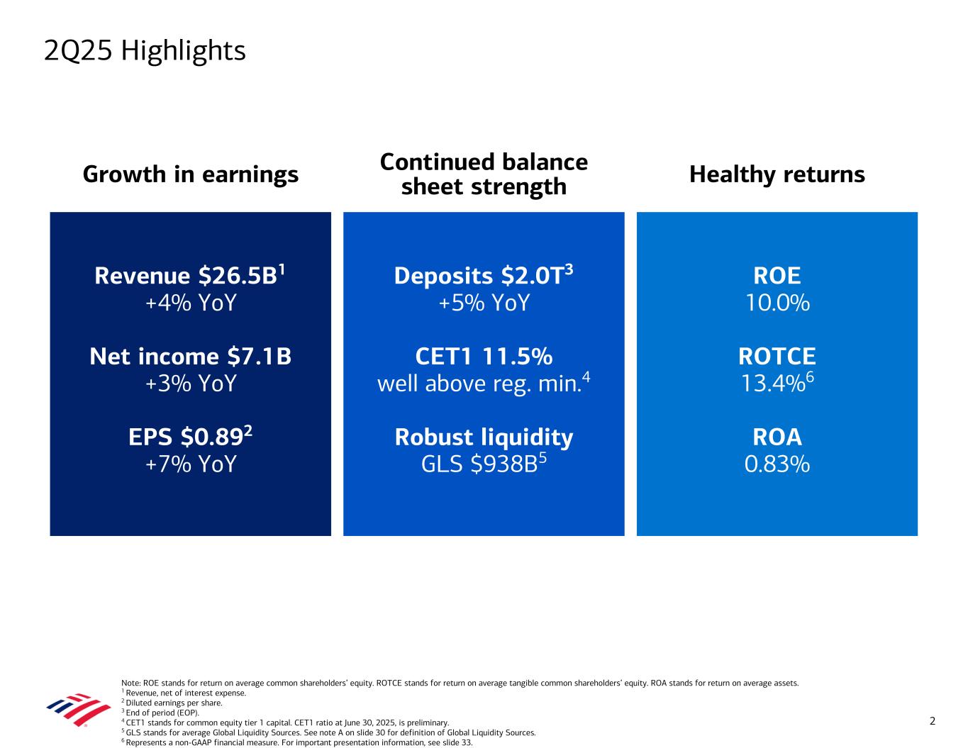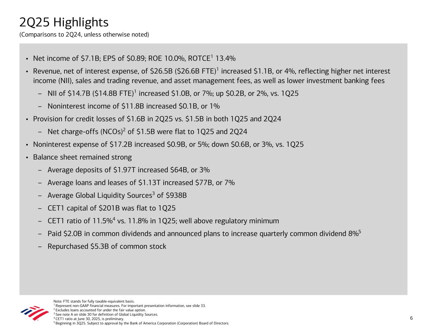 Note: FTE stands for fully taxable-equivalent basis. 1 Represent non-GAAP financial measures. For important presentation information, see slide 33. 2 Excludes loans accounted for under the fair value option. 3 See note A on slide 30 for definition of Global Liquidity Sources. 4 CET1 ratio at June 30, 2025, is preliminary. 5 Beginning in 3Q25. Subject to approval by the Bank of America Corporation (Corporation) Board of Directors. 2Q25 Highlights (Comparisons to 2Q24, unless otherwise noted) • Net income of $7.1B; EPS of $0.89; ROE 10.0%, ROTCE1 13.4% • Revenue, net of interest expense, of $26.5B ($26.6B FTE)1 increased $1.1B, or 4%, reflecting higher net interest income (NII), sales and trading revenue, and asset management fees, as well as lower investment banking fees – NII of $14.7B ($14.8B FTE)1 increased $1.0B, or 7%; up $0.2B, or 2%, vs. 1Q25 – Noninterest income of $11.8B increased $0.1B, or 1% • Provision for credit losses of $1.6B in 2Q25 vs. $1.5B in both 1Q25 and 2Q24 – Net charge-offs (NCOs)2 of $1.5B were flat to 1Q25 and 2Q24 • Noninterest expense of $17.2B increased $0.9B, or 5%; down $0.6B, or 3%, vs. 1Q25 • Balance sheet remained strong – Average deposits of $1.97T increased $64B, or 3% – Average loans and leases of $1.13T increased $77B, or 7% – Average Global Liquidity Sources3 of $938B – CET1 capital of $201B was flat to 1Q25 – CET1 ratio of 11.5%4 vs. 11.8% in 1Q25; well above regulatory minimum – Paid $2.0B in common dividends and announced plans to increase quarterly common dividend 8%5 – Repurchased $5.3B of common stock 6