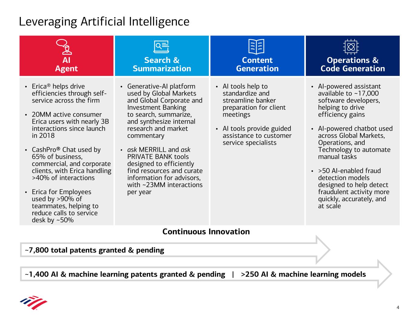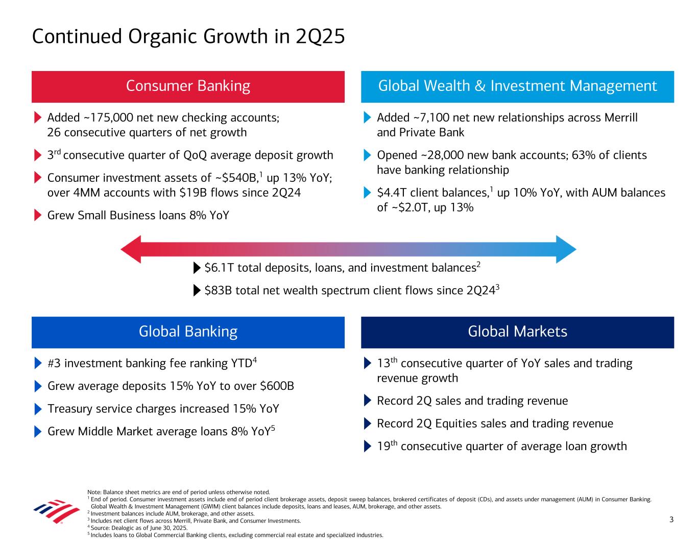 Added ~175,000 net new checking accounts; 26 consecutive quarters of net growth 3rd consecutive quarter of QoQ average deposit growth Consumer investment assets of ~$540B,1 up 13% YoY; over 4MM accounts with $19B flows since 2Q24 Grew Small Business loans 8% YoY Note: Balance sheet metrics are end of period unless otherwise noted. 1 End of period. Consumer investment assets include end of period client brokerage assets, deposit sweep balances, brokered certificates of deposit (CDs), and assets under management (AUM) in Consumer Banking. Global Wealth & Investment Management (GWIM) client balances include deposits, loans and leases, AUM, brokerage, and other assets. 2 Investment balances include AUM, brokerage, and other assets. 3 Includes net client flows across Merrill, Private Bank, and Consumer Investments. 4 Source: Dealogic as of June 30, 2025. 5 Includes loans to Global Commercial Banking clients, excluding commercial real estate and specialized industries. #3 investment banking fee ranking YTD4 Grew average deposits 15% YoY to over $600B Treasury service charges increased 15% YoY Grew Middle Market average loans 8% YoY5 Added ~7,100 net new relationships across Merrill and Private Bank Opened ~28,000 new bank accounts; 63% of clients have banking relationship $4.4T client balances,1 up 10% YoY, with AUM balances of ~$2.0T, up 13% Continued Organic Growth in 2Q25 3 Consumer Banking Global Wealth & Investment Management Global Banking Global Markets $6.1T total deposits, loans, and investment balances2 $83B total net wealth spectrum client flows since 2Q243 13th consecutive quarter of YoY sales and trading revenue growth Record 2Q sales and trading revenue Record 2Q Equities sales and trading revenue 19th consecutive quarter of average loan growth