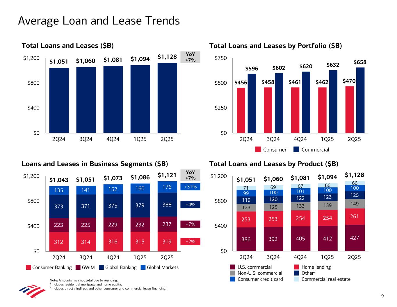 $1,043 $1,051 $1,073 $1,086 $1,121 312 314 316 315 319 223 225 229 232 237 373 371 375 379 388 135 141 152 160 176 Consumer Banking GWIM Global Banking Global Markets 2Q24 3Q24 4Q24 1Q25 2Q25 $0 $400 $800 $1,200 $1,051 $1,060 $1,081 $1,094 $1,128 2Q24 3Q24 4Q24 1Q25 2Q25 $0 $400 $800 $1,200 +2% +7% +4% +31% Average Loan and Lease Trends YoY +7% YoY +7% Note: Amounts may not total due to rounding. 1 Includes residential mortgage and home equity. 2 Includes direct / indirect and other consumer and commercial lease financing. Total Loans and Leases by Product ($B) Loans and Leases in Business Segments ($B) Total Loans and Leases by Portfolio ($B)Total Loans and Leases ($B) $456 $458 $461 $462 $470 $596 $602 $620 $632 $658 Consumer Commercial 2Q24 3Q24 4Q24 1Q25 2Q25 $0 $250 $500 $750 9 $1,051 $1,060 $1,081 $1,094 $1,128 386 392 405 412 427 253 253 254 254 261 123 125 133 139 149 119 120 122 123 12599 100 101 100 10071 69 67 66 66 U.S. commercial Home lending Non-U.S. commercial Other Consumer credit card Commercial real estate 2Q24 3Q24 4Q24 1Q25 2Q25 $0 $400 $800 $1,200 2 1