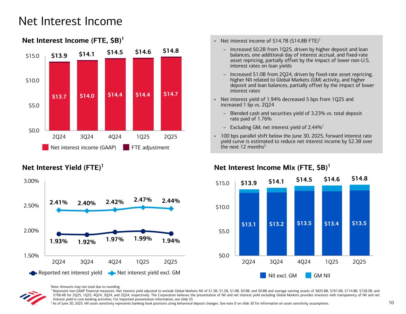A Global Liquidity Sources (GLS) include cash and high-quality, liquid, unencumbered securities, inclusive of U.S. government securities, U.S. agency securities, U.S. agency MBS, and a select group of non-U.S. government and supranational securities, and other investment-grade securities, and are readily available to meet funding requirements as they arise. Transfers of liquidity among legal entities may be subject to certain regulatory and other restrictions. B Reserve build (or release) is calculated by subtracting net charge-offs for the period from the provision for credit losses recognized in that period. The period-end allowance, or reserve, for credit losses reflects the beginning of the period allowance adjusted for net charge-offs recorded in that period plus the provision for credit losses and other valuation accounts recognized in that period. C Pretax, pre-provision income (PTPI) at the consolidated level is a non-GAAP financial measure calculated by adjusting consolidated pretax income to add back provision for credit losses. Similarly, PTPI at the segment level is a non-GAAP financial measure calculated by adjusting the segments’ pretax income to add back provision for credit losses. Management believes that PTPI (both at the consolidated and segment level) is a useful financial measure as it enables an assessment of the Corporation’s ability to generate earnings to cover credit losses through a credit cycle as well as provides an additional basis for comparing the Corporation's results of operations between periods by isolating the impact of provision for credit losses, which can vary significantly between periods. See reconciliation below. D Interest rate sensitivity as of June 30, 2025, reflects the potential pretax impact to forecasted net interest income over the next 12 months from June 30, 2025, resulting from an instantaneous parallel shock to the market-based forward curve. As part of our asset and liability management activities, we use securities, certain residential mortgages, and interest rate and foreign exchange derivatives in managing interest rate sensitivity. The sensitivity analysis assumes that we take no action in response to this rate shock and does not assume any change in other macroeconomic variables normally correlated with changes in interest rates. The sensitivity analysis incorporates potential movements in customer behavior that could result in changes in both total customer deposit balances and balance mix in various interest rate scenarios. In lower rate scenarios, the analysis assumes that a portion of higher-yielding deposits or market-based funding are replaced with low-cost or noninterest-bearing deposits. E Forward-looking statements related to the Corporation’s NII outlook are based on the Corporation’s baseline NII forecast that takes into account expected future business growth, ALM positioning, and the future direction of interest rate movements as implied by market-based curves, including, among others, the Corporation’s current expectations regarding expected interest rate cuts, the expected impact of one additional day compared to 2Q, the expected benefit to NII from fixed-rate asset repricing, and a range of expected loan and deposit growth. These statements are not guarantees of future results or performance and involve known and unknown risks, uncertainties, and assumptions that are difficult to predict and are often beyond the Corporation’s control. For more information, see Forward-Looking Statements on slide 32. F Revenue for all periods included net debit valuation adjustments (DVA) on derivatives, as well as amortization of own credit portion of purchase discount and realized DVA on structured liabilities. Net DVA gains (losses) were ($51MM), $19MM, and ($1MM) for 2Q25, 1Q25, and 2Q24, respectively, and ($32MM), ($86MM), ($88MM), and $227MM for 2025 YTD, 2024 YTD, 2023 YTD, and 2022 YTD, respectively. Net DVA gains (losses) included in FICC revenue were ($54MM), $15MM, and $5MM for 2Q25, 1Q25, and 2Q24, respectively, and ($39MM), ($71MM), ($86MM), and $220MM for 2025 YTD, 2024 YTD, 2023 YTD, and 2022 YTD, respectively. Net DVA gains (losses) included in Equities revenue were $3MM, $4MM, and ($6MM) for 2Q25, 1Q25, and 2Q24, respectively, and $7MM, ($15MM), ($2MM), and $7MM for 2025 YTD, 2024 YTD, 2023 YTD, and 2022 YTD, respectively. G VaR model uses a historical simulation approach based on three years of historical data and an expected shortfall methodology equivalent to a 99% confidence level. Using a 95% confidence level, average VaR was $35MM, $39MM, and $36MM for 2Q25, 1Q25, and 2Q24 respectively, and $37MM, $34MM, $31MM, and $26MM for 2025 YTD, 2024 YTD, 2023 YTD, and 2022 YTD, respectively. Beginning in 1Q25, the VaR amounts for all periods presented are those used in the Corporation’s risk management of its trading portfolios. Previously, the VaR amounts presented were those used for regulatory capital. The trading portfolio represents trading assets and liabilities, primarily consisting of regular underwriting or dealing in securities and derivative contracts, and acquiring positions as an accommodation to customers. H In 2Q25, adjusted ETR of 24% is calculated as ETR of 7% plus 17 percentage points for the tax rate effects of tax credits of $1.1B and discrete tax benefits of approximately $180MM. We believe the presentation of adjusted ETR is useful because it provides additional information to assess the Corporation’s results of operations. Notes $ in millions 2Q25 1Q25 2Q24 Pretax Income (GAAP) Provision for Credit Losses (GAAP) Pretax, Pre-provision Income Pretax Income (GAAP) Provision for Credit Losses (GAAP) Pretax, Pre-provision Income Pretax Income (GAAP) Provision for Credit Losses (GAAP) Pretax, Pre-provision Income Consumer Banking $ 3,964 $ 1,282 $ 5,246 $ 3,375 $ 1,292 $ 4,667 $ 3,461 $ 1,281 $ 4,742 Global Wealth & Investment Management 1,324 20 1,344 1,343 14 1,357 1,368 7 1,375 Glo