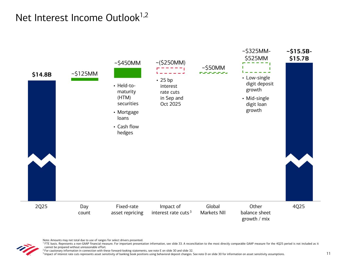 • Net interest income of $14.7B ($14.8B FTE)1 – Increased $0.2B from 1Q25, driven by higher deposit and loan balances, one additional day of interest accrual, and fixed-rate asset repricing, partially offset by the impact of lower non-U.S. interest rates on loan yields – Increased $1.0B from 2Q24, driven by fixed-rate asset repricing, higher NII related to Global Markets (GM) activity, and higher deposit and loan balances, partially offset by the impact of lower interest rates • Net interest yield of 1.94% decreased 5 bps from 1Q25 and increased 1 bp vs. 2Q24 – Blended cash and securities yield of 3.23% vs. total deposit rate paid of 1.76% – Excluding GM, net interest yield of 2.44%1 • 100 bps parallel shift below the June 30, 2025, forward interest rate yield curve is estimated to reduce net interest income by $2.3B over the next 12 months2 Net Interest Income (FTE, $B)1 Net Interest Income Net Interest Yield (FTE)1 Note: Amounts may not total due to rounding. 1 Represent non-GAAP financial measures. Net interest yield adjusted to exclude Global Markets NII of $1.3B, $1.2B, $1.0B, $0.9B, and $0.8B and average earning assets of $825.8B, $767.6B, $714.8B, $728.2B, and $706.4B for 2Q25, 1Q25, 4Q24, 3Q24, and 2Q24, respectively. The Corporation believes the presentation of NII and net interest yield excluding Global Markets provides investors with transparency of NII and net interest yield in core banking activities. For important presentation information, see slide 33. 2 As of June 30, 2025. NII asset sensitivity represents banking book positions using behavioral deposit changes. See note D on slide 30 for information on asset sensitivity assumptions. 1.93% 1.92% 1.97% 1.99% 1.94% 2.41% 2.40% 2.42% 2.47% 2.44% Reported net interest yield Net interest yield excl. GM 2Q24 3Q24 4Q24 1Q25 2Q25 1.50% 2.00% 2.50% 3.00% $13.9 $14.1 $14.5 $14.6 $14.8 $13.7 $14.0 $14.4 $14.4 $14.7 Net interest income (GAAP) FTE adjustment 2Q24 3Q24 4Q24 1Q25 2Q25 $0.0 $5.0 $10.0 $15.0 10 Net Interest Income Mix (FTE, $B)1 $13.9 $14.1 $14.5 $14.6 $14.8 $13.1 $13.2 $13.5 $13.4 $13.5 NII excl. GM GM NII 2Q24 3Q24 4Q24 1Q25 2Q25 $0.0 $5.0 $10.0 $15.0