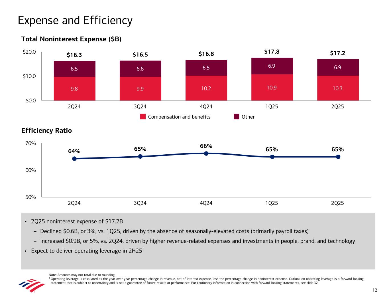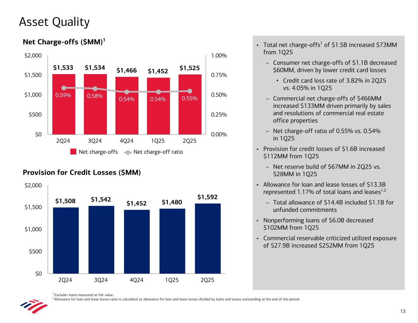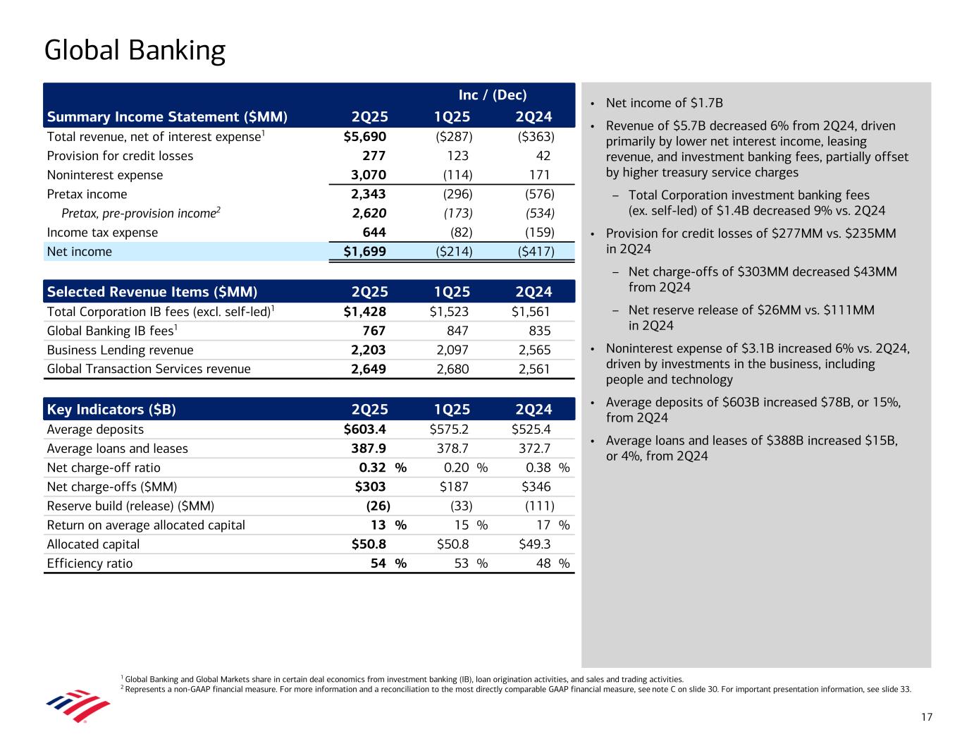 • Net income of $3.0B • Revenue of $10.8B increased 6% from 2Q24, driven by higher net interest income • Provision for credit losses of $1.3B was flat to 2Q24 – Net charge-offs of $1.2B were flat to 2Q24 – Net reserve build of $82MM vs. $93MM in 2Q24 • Noninterest expense of $5.6B increased 2% from 2Q24, driven by investments in people and technology – Efficiency ratio of 51% • Average deposits of $952B increased $3B from 2Q24 – 58% of deposits in checking accounts; 92% are primary accounts5 • Average loans and leases of $319B increased $7B, or 2%, from 2Q24 • Combined credit / debit card spend of $244B increased 4% from 2Q244 • Consumer investment assets of $540B grew $64B, or 13%, vs. 2Q24,3 driven by higher market valuations and $19B of net client flows from new and existing clients • 11.2MM clients enrolled in Preferred Rewards, up 1% from 2Q246 • 79% of households digitally active, up from 77% in 2Q247 Consumer Banking 1 Represents a non-GAAP financial measure. For more information and a reconciliation to the most directly comparable GAAP financial measure, see note C on slide 30. For important presentation information, see slide 33. 2 Cost of deposits calculated as annualized noninterest expense as a percentage of total average deposits within the Deposits sub-segment. 3 End of period. Consumer investment assets include client brokerage assets, deposit sweep balances, brokered CDs, and AUM in Consumer Banking. 4 Includes consumer credit card portfolios in Consumer Banking and GWIM. 5 Represents the percentage of consumer checking accounts that are estimated to be the customer’s primary account based on multiple relationship factors (e.g., linked to their direct deposit). 6 As of May 2025. Includes clients in Consumer, Small Business, and GWIM. 7 As of May 2025. Represents households with consumer bank login activities in a 90-day period. Inc / (Dec) Summary Income Statement ($MM) 2Q25 1Q25 2Q24 Total revenue, net of interest expense $10,813 $320 $607 Provision for credit losses 1,282 (10) 1 Noninterest expense 5,567 (259) 103 Pretax income 3,964 589 503 Pretax, pre-provision income1 5,246 579 504 Income tax expense 991 147 125 Net income $2,973 $442 $378 Key Indicators ($B) 2Q25 1Q25 2Q24 Average deposits $952.0 $947.6 $949.2 Rate paid on deposits 0.58 % 0.61 % 0.60 % Cost of deposits2 1.46 1.54 1.44 Average loans and leases $319.1 $315.0 $312.3 Net charge-off ratio 1.51 % 1.62 % 1.53 % Net charge-offs ($MM) $1,200 $1,262 $1,188 Reserve build ($MM) 82 30 93 Consumer investment assets3 539.7 497.7 476.1 Active mobile banking users (MM) 40.8 40.5 39.0 % Consumer sales through digital channels 65 % 65 % 53 % Number of financial centers 3,664 3,681 3,786 Combined credit / debit purchase volumes4 $244.1 $228.4 $233.6 Total consumer credit card risk-adjusted margin4 7.07 % 6.68 % 6.75 % Return on average allocated capital 27 23 24 Allocated capital $44.0 $44.0 $43.3 Efficiency ratio 51 % 56 % 54 % 15