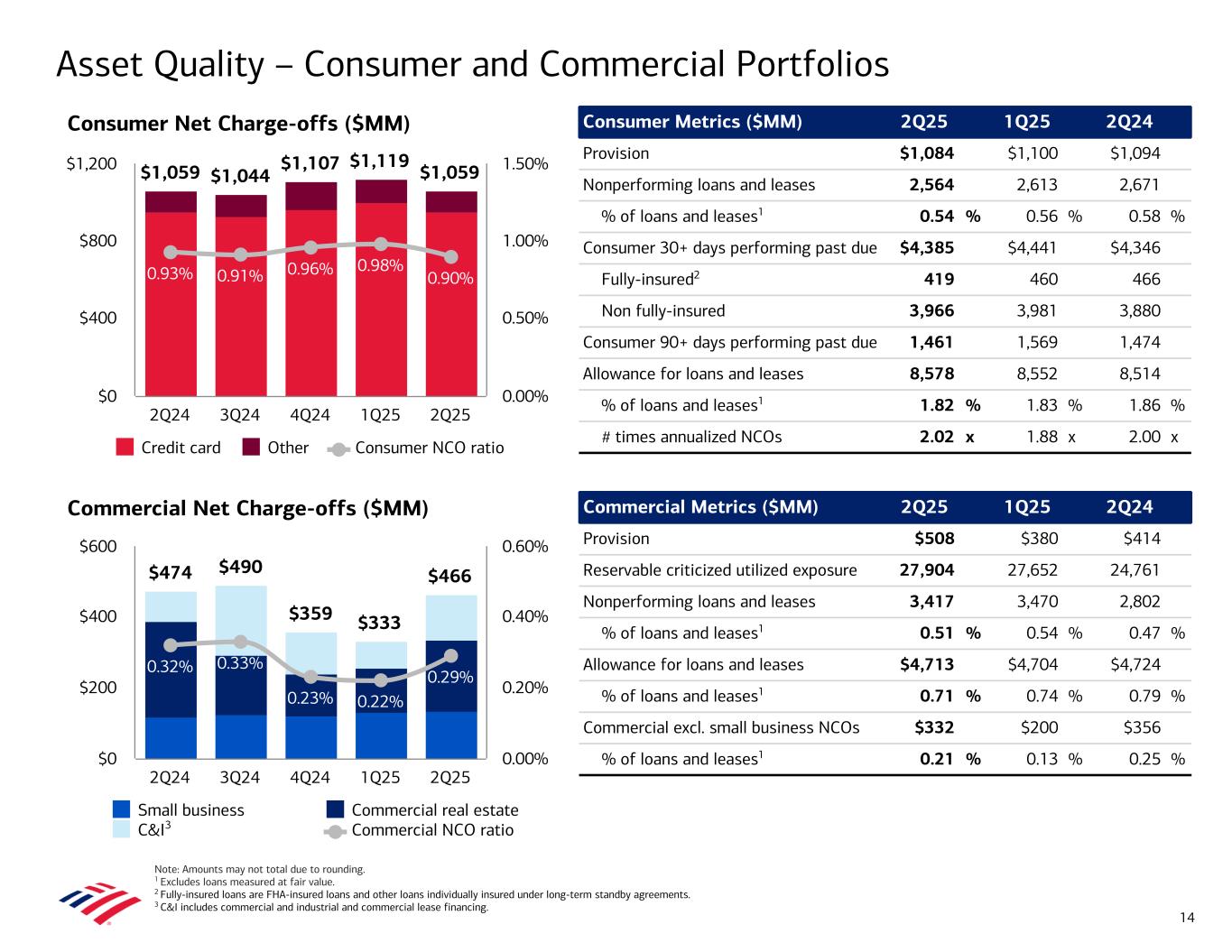 Asset Quality 1 Excludes loans measured at fair value. 2 Allowance for loan and lease losses ratio is calculated as allowance for loan and lease losses divided by loans and leases outstanding at the end of the period. Provision for Credit Losses ($MM) Net Charge-offs ($MM)1 $1,508 $1,542 $1,452 $1,480 $1,592 2Q24 3Q24 4Q24 1Q25 2Q25 $0 $500 $1,000 $1,500 $2,000 $1,533 $1,534 $1,466 $1,452 $1,525 0.59% 0.58% 0.54% 0.54% 0.55% Net charge-offs Net charge-off ratio 2Q24 3Q24 4Q24 1Q25 2Q25 $0 $500 $1,000 $1,500 $2,000 0.00% 0.25% 0.50% 0.75% 1.00% 13 • Total net charge-offs1 of $1.5B increased $73MM from 1Q25 – Consumer net charge-offs of $1.1B decreased $60MM, driven by lower credit card losses ▪ Credit card loss rate of 3.82% in 2Q25 vs. 4.05% in 1Q25 – Commercial net charge-offs of $466MM increased $133MM driven primarily by sales and resolutions of commercial real estate office properties – Net charge-off ratio of 0.55% vs. 0.54% in 1Q25 • Provision for credit losses of $1.6B increased $112MM from 1Q25 – Net reserve build of $67MM in 2Q25 vs. $28MM in 1Q25 • Allowance for loan and lease losses of $13.3B represented 1.17% of total loans and leases1,2 – Total allowance of $14.4B included $1.1B for unfunded commitments • Nonperforming loans of $6.0B decreased $102MM from 1Q25 • Commercial reservable criticized utilized exposure of $27.9B increased $252MM from 1Q25