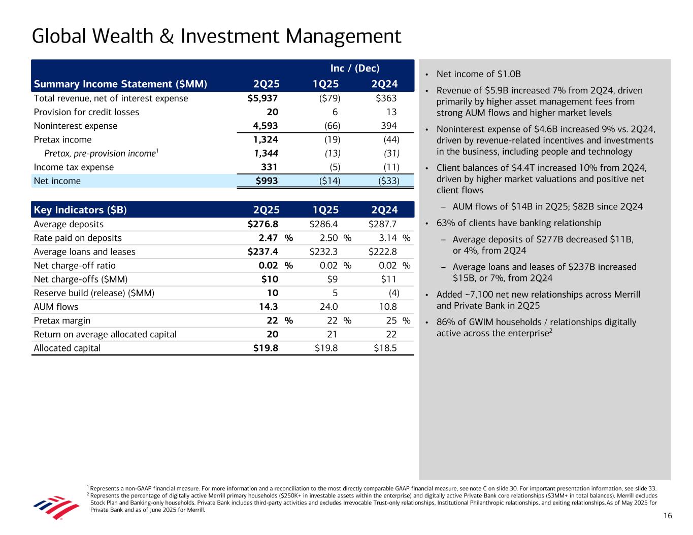 • Net income of $1.0B • Revenue of $5.9B increased 7% from 2Q24, driven primarily by higher asset management fees from strong AUM flows and higher market levels • Noninterest expense of $4.6B increased 9% vs. 2Q24, driven by revenue-related incentives and investments in the business, including people and technology • Client balances of $4.4T increased 10% from 2Q24, driven by higher market valuations and positive net client flows – AUM flows of $14B in 2Q25; $82B since 2Q24 • 63% of clients have banking relationship – Average deposits of $277B decreased $11B, or 4%, from 2Q24 – Average loans and leases of $237B increased $15B, or 7%, from 2Q24 • Added ~7,100 net new relationships across Merrill and Private Bank in 2Q25 • 86% of GWIM households / relationships digitally active across the enterprise2 Global Wealth & Investment Management 1 Represents a non-GAAP financial measure. For more information and a reconciliation to the most directly comparable GAAP financial measure, see note C on slide 30. For important presentation information, see slide 33. 2 Represents the percentage of digitally active Merrill primary households ($250K+ in investable assets within the enterprise) and digitally active Private Bank core relationships ($3MM+ in total balances). Merrill excludes Stock Plan and Banking-only households. Private Bank includes third-party activities and excludes Irrevocable Trust-only relationships, Institutional Philanthropic relationships, and exiting relationships. As of May 2025 for Private Bank and as of June 2025 for Merrill. Inc / (Dec) Summary Income Statement ($MM) 2Q25 1Q25 2Q24 Total revenue, net of interest expense $5,937 ($79) $363 Provision for credit losses 20 6 13 Noninterest expense 4,593 (66) 394 Pretax income 1,324 (19) (44) Pretax, pre-provision income1 1,344 (13) (31) Income tax expense 331 (5) (11) Net income $993 ($14) ($33) Key Indicators ($B) 2Q25 1Q25 2Q24 Average deposits $276.8 $286.4 $287.7 Rate paid on deposits 2.47 % 2.50 % 3.14 % Average loans and leases $237.4 $232.3 $222.8 Net charge-off ratio 0.02 % 0.02 % 0.02 % Net charge-offs ($MM) $10 $9 $11 Reserve build (release) ($MM) 10 5 (4) AUM flows 14.3 24.0 10.8 Pretax margin 22 % 22 % 25 % Return on average allocated capital 20 21 22 Allocated capital $19.8 $19.8 $18.5 16