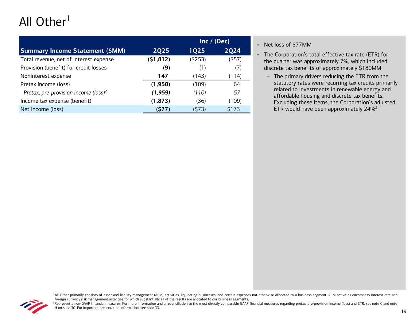 • Net income of $1.5B ($1.6B excluding net DVA)3 • Revenue of $6.0B increased 10% from 2Q24, driven primarily by higher sales and trading revenue • Sales and trading revenue of $5.3B increased 14% from 2Q24; excluding net DVA, up 15%3 – FICC revenue increased 16% to $3.2B (excl. DVA, up 19%),3 driven by strong performance in macro products5 – Equities revenue increased 10% to $2.1B (incl. and excl. DVA),3 driven by improved trading performance and increased client activity • Noninterest expense of $3.8B increased 9% vs. 2Q24, driven by higher revenue-related expenses and investments in the business, including people and technology • Average VaR of $84MM in 2Q256 Global Markets1 1 The explanations for current period-over-period changes for Global Markets are the same for amounts including and excluding net DVA. 2 Global Banking and Global Markets share in certain deal economics from investment banking, loan origination activities, and sales and trading activities. 3 Represent non-GAAP financial measures. Reported fixed income, currencies, and commodities (FICC) sales and trading revenue was $3.2B, $3.5B, and $2.7B for 2Q25, 1Q25, and 2Q24, respectively. Reported Equities sales and trading revenue was $2.1B, $2.2B, and $1.9B for 2Q25, 1Q25, and 2Q24, respectively. See note F on slide 30 and slide 33 for important presentation information. 4 Represents a non-GAAP financial measure. For more information and a reconciliation to the most directly comparable GAAP financial measure, see note C on slide 30. For important presentation information, see slide 33. 5 Macro includes currencies, interest rates, and commodities products. 6 See note G on slide 30 for the definition of VaR. Inc / (Dec) Summary Income Statement ($MM) 2Q25 1Q25 2Q24 Total revenue, net of interest expense2 $5,980 ($604) $521 Net DVA (51) (70) (50) Total revenue (excl. net DVA)2,3 6,031 (534) 571 Provision (benefit) for credit losses 22 (6) 35 Noninterest expense 3,806 (5) 320 Pretax income 2,152 (593) 166 Pretax, pre-provision income4 2,174 (599) 201 Income tax expense 624 (172) 48 Net income $1,528 ($421) $118 Net income (excl. net DVA)3 $1,567 ($368) $156 Selected Revenue Items ($MM)2 2Q25 1Q25 2Q24 Sales and trading revenue $5,326 $5,664 $4,679 Sales and trading revenue (excl. net DVA)3 5,377 5,645 4,680 FICC (excl. net DVA)3 3,247 3,463 2,737 Equities (excl. net DVA)3 2,130 2,182 1,943 Global Markets IB fees 666 681 719 Key Indicators ($B) 2Q25 1Q25 2Q24 Average total assets $1,023.0 $969.3 $908.5 Average trading-related assets 700.4 668.2 639.8 Average 99% VaR ($MM)6 84 91 73 Average loans and leases 176.4 159.6 135.1 Net charge-offs ($MM) 25 6 2 Reserve build (release) ($MM) (3) 22 (15) Return on average allocated capital 13 % 16 % 13 % Allocated capital $49.0 $49.0 $45.5 Efficiency ratio 64 % 58 % 64 % 18
