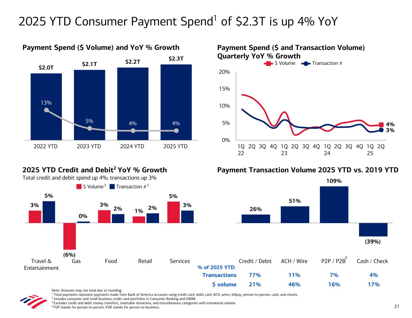 2025 YTD Consumer Payment Spend1 of $2.3T is up 4% YoY Payment Spend ($ and Transaction Volume) Quarterly YoY % Growth 21 2025 YTD Credit and Debit2 YoY % Growth Total credit and debit spend up 4%; transactions up 3% $ Volume Transaction # 1Q 22 2Q 3Q 4Q 1Q 23 2Q 3Q 4Q 1Q 24 2Q 3Q 4Q 1Q 25 2Q 0% 5% 10% 15% 20% 3% (6%) 3% 1% 5%5% 0% 2% 2% 3% $ Volume Transaction # Travel & Entertainment Gas Food Retail Services Payment Spend ($ Volume) and YoY % Growth $2.0T $2.1T $2.2T $2.3T 13% 5% 4% 4% 2022 YTD 2023 YTD 2024 YTD 2025 YTD 4% 3% Payment Transaction Volume 2025 YTD vs. 2019 YTD 26% 51% 109% (39%) Credit / Debit ACH / Wire P2P / P2B Cash / Check % of 2025 YTD: Transactions 77% 11% 7% 4% $ volume 21% 46% 16% 17% 4 Note: Amounts may not total due to rounding. 1 Total payments represent payments made from Bank of America accounts using credit card, debit card, ACH, wires, billpay, person-to-person, cash, and checks. 2 Includes consumer and small business credit card portfolios in Consumer Banking and GWIM. 3 Excludes credit and debit money transfers, charitable donations, and miscellaneous categories with immaterial volume. 4 P2P stands for person-to-person. P2B stands for person-to-business. 3 3