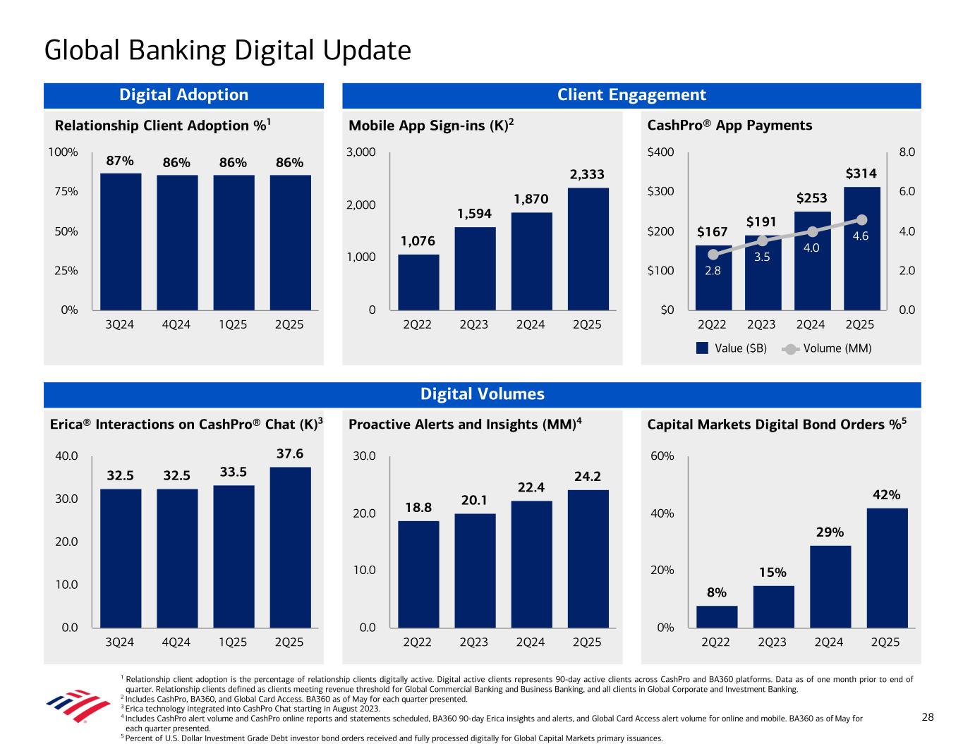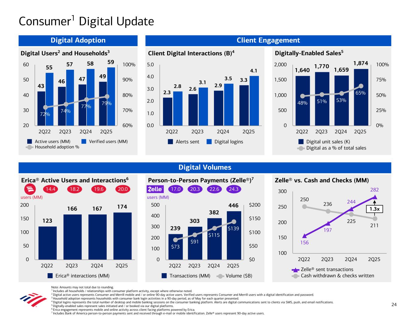 Erica® Active Users and Interactions6 Zelle® vs. Cash and Checks (MM) Digitally-Enabled Sales5Digital Users2 and Households3 Client Digital Interactions (B)4 1,640 1,770 1,659 1,874 48% 51% 53% 65% Digital unit sales (K) Digital as a % of total sales 2Q22 2Q23 2Q24 2Q25 0 500 1,000 1,500 2,000 0% 25% 50% 75% 100% 2.3 2.6 2.9 3.3 2.8 3.1 3.5 4.1 Alerts sent Digital logins 2Q22 2Q23 2Q24 2Q25 0.0 1.0 2.0 3.0 4.0 5.0 43 46 47 49 55 57 58 59 72% 74% 77% 79% Active users (MM) Verified users (MM) Household adoption % 2Q22 2Q23 2Q24 2Q25 20 30 40 50 60 60% 70% 80% 90% 100% Client Engagement Person-to-Person Payments (Zelle®)7 Digital Volumes 239 303 382 446 $73 $91 $115 $139 Transactions (MM) Volume ($B) 2Q22 2Q23 2Q24 2Q25 0 100 200 300 400 500 $0 $50 $100 $150 $200 Consumer1 Digital Update Note: Amounts may not total due to rounding. 1 Includes all households / relationships with consumer platform activity, except where otherwise noted. 2 Digital active users represents Consumer and Merrill mobile and / or online 90-day active users. Verified users represents Consumer and Merrill users with a digital identification and password. 3 Household adoption represents households with consumer bank login activities in a 90-day period, as of May for each quarter presented. 4 Digital logins represents the total number of desktop and mobile banking sessions on the consumer banking platform. Alerts are digital communications sent to clients via SMS, push, and email notifications. 5 Digitally-enabled sales represent sales initiated and / or booked via our digital platforms. 6 Erica engagement represents mobile and online activity across client facing platforms powered by Erica. 7 Includes Bank of America person-to-person payments sent and received through e-mail or mobile identification. Zelle® users represent 90-day active users. 17.0 20.3 22.6 24.3 users (MM) 24 Digital Adoption 123 166 167 174 Erica® interactions (MM) 2Q22 2Q23 2Q24 2Q25 0 50 100 150 200 250 236 225 211 156 197 244 282 Zelle® sent transactions Cash withdrawn & checks written 2Q22 2Q23 2Q24 2Q25 100 150 200 250 300 1.3x 14.4 18.2 19.6 20.0 users (MM)