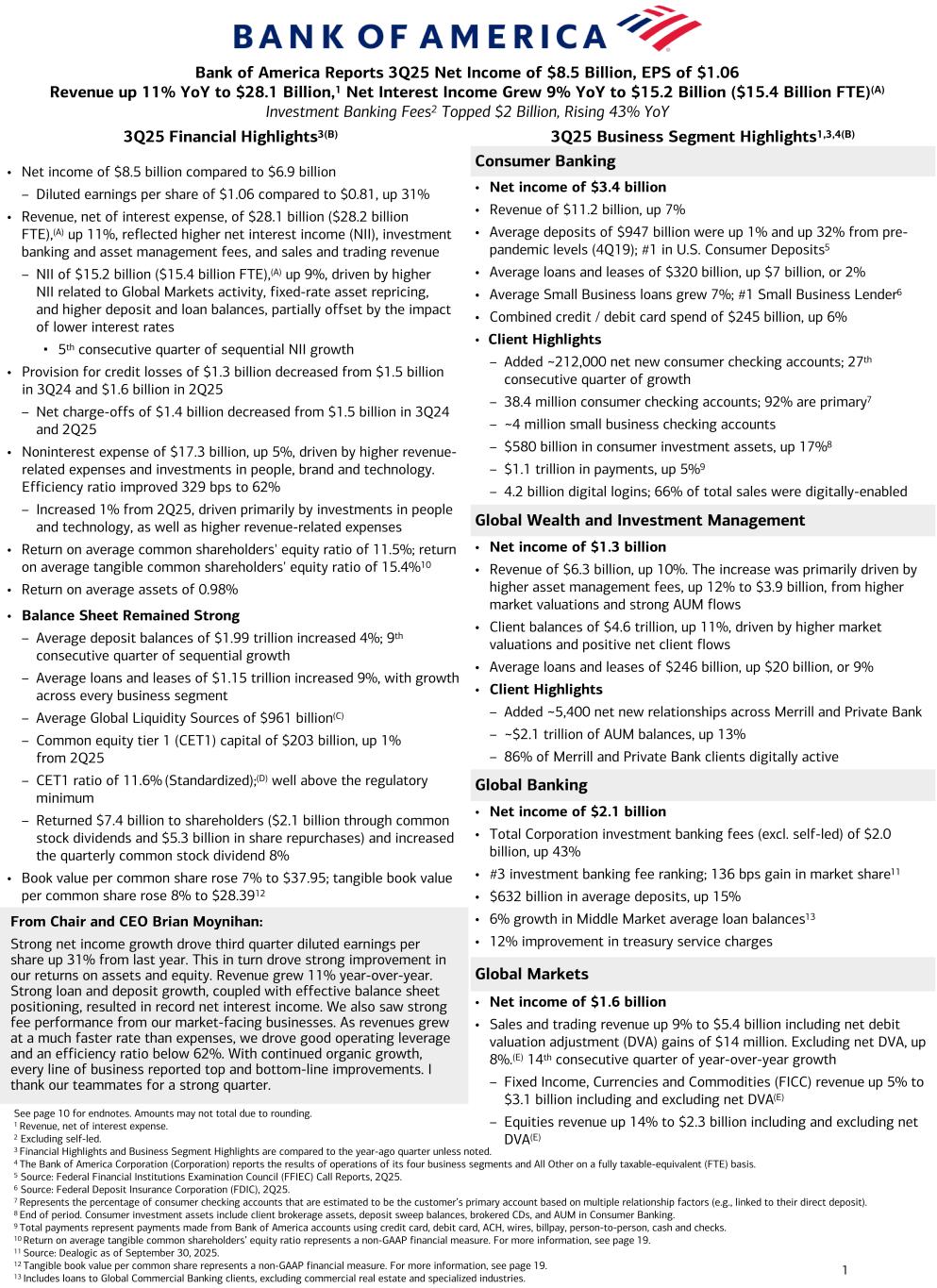 1 3Q25 Financial Highlights3(B) 3Q25 Business Segment Highlights1,3,4(B) Consumer Banking • Net income of $3.4 billion • Revenue of $11.2 billion, up 7% • Average deposits of $947 billion were up 1% and up 32% from pre- pandemic levels (4Q19); #1 in U.S. Consumer Deposits5 • Average loans and leases of $320 billion, up $7 billion, or 2% • Average Small Business loans grew 7%; #1 Small Business Lender6 • Combined credit / debit card spend of $245 billion, up 6% • Client Highlights – Added ~212,000 net new consumer checking accounts; 27th consecutive quarter of growth – 38.4 million consumer checking accounts; 92% are primary7 – ~4 million small business checking accounts – $580 billion in consumer investment assets, up 17%8 – $1.1 trillion in payments, up 5%9 – 4.2 billion digital logins; 66% of total sales were digitally-enabled Global Wealth and Investment Management • Net income of $1.3 billion • Revenue of $6.3 billion, up 10%. The increase was primarily driven by higher asset management fees, up 12% to $3.9 billion, from higher market valuations and strong AUM flows • Client balances of $4.6 trillion, up 11%, driven by higher market valuations and positive net client flows • Average loans and leases of $246 billion, up $20 billion, or 9% • Client Highlights – Added ~5,400 net new relationships across Merrill and Private Bank – ~$2.1 trillion of AUM balances, up 13% – 86% of Merrill and Private Bank clients digitally active Global Banking • Net income of $2.1 billion • Total Corporation investment banking fees (excl. self-led) of $2.0 billion, up 43% • #3 investment banking fee ranking; 136 bps gain in market share11 • $632 billion in average deposits, up 15% • 6% growth in Middle Market average loan balances13 • 12% improvement in treasury service charges Global Markets • Net income of $1.6 billion • Sales and trading revenue up 9% to $5.4 billion including net debit valuation adjustment (DVA) gains of $14 million. Excluding net DVA, up 8%.(E) 14th consecutive quarter of year-over-year growth – Fixed Income, Currencies and Commodities (FICC) revenue up 5% to $3.1 billion including and excluding net DVA(E) – Equities revenue up 14% to $2.3 billion including and excluding net DVA(E) From Chair and CEO Brian Moynihan: Strong net income growth drove third quarter diluted earnings per share up 31% from last year. This in turn drove strong improvement in our returns on assets and equity. Revenue grew 11% year-over-year. Strong loan and deposit growth, coupled with effective balance sheet positioning, resulted in record net interest income. We also saw strong fee performance from our market-facing businesses. As revenues grew at a much faster rate than expenses, we drove good operating leverage and an efficiency ratio below 62%. With continued organic growth, every line of business reported top and bottom-line improvements. I thank our teammates for a strong quarter. Bank of America Reports 3Q25 Net Income of $8.5 Billion, EPS of $1.06 Revenue up 11% YoY to $28.1 Billion,1 Net Interest Income Grew 9% YoY to $15.2 Billion ($15.4 Billion FTE)(A) Investment Banking Fees2 Topped $2 Billion, Rising 43% YoY See page 10 for endnotes. Amounts may not total due to rounding. 1 Revenue, net of interest expense. 2 Excluding self-led. 3 Financial Highlights and Business Segment Highlights are compared to the year-ago quarter unless noted. 4 The Bank of America Corporation (Corporation) reports the results of operations of its four business segments and All Other on a fully taxable-equivalent (FTE) basis. 5 Source: Federal Financial Institutions Examination Council (FFIEC) Call Reports, 2Q25. 6 Source: Federal Deposit Insurance Corporation (FDIC), 2Q25. 7 Represents the percentage of consumer checking accounts that are estimated to be the customer’s primary account based on multiple relationship factors (e.g., linked to their direct deposit). 8 End of period. Consumer investment assets include client brokerage assets, deposit sweep balances, brokered CDs, and AUM in Consumer Banking. 9 Total payments represent payments made from Bank of America accounts using credit card, debit card, ACH, wires, billpay, person-to-person, cash and checks. 10 Return on average tangible common shareholders’ equity ratio represents a non-GAAP financial measure. For more information, see page 19. 11 Source: Dealogic as of September 30, 2025. 12 Tangible book value per common share represents a non-GAAP financial measure. For more information, see page 19. 13 Includes loans to Global Commercial Banking clients, excluding commercial real estate and specialized industries. • Net income of $8.5 billion compared to $6.9 billion – Diluted earnings per share of $1.06 compared to $0.81, up 31% • Revenue, net of interest expense, of $28.1 billion ($28.2 billion FTE),(A) up 11%, reflected higher net interest income (NII), investment banking and asset management fees, and sales and trading revenue – NII of $15.2 billion ($15.4 billion FTE),(A) up 9%, driven by higher NII related to Global Markets activity, fixed-rate asset repricing, and higher deposit and loan balances, partially offset by the impact of lower interest rates ▪ 5th consecutive quarter of sequential NII growth • Provision for credit losses of $1.3 billion decreased from $1.5 billion in 3Q24 and $1.6 billion in 2Q25 – Net charge-offs of $1.4 billion decreased from $1.5 billion in 3Q24 and 2Q25 • Noninterest expense of $17.3 billion, up 5%, driven by higher revenue- related expenses and investments in people, brand and technology. Efficiency ratio improved 329 bps to 62% – Increased 1% from 2Q25, driven primarily by investments in people and technology, as well as higher revenue-related expenses • Return on average common shareholders' equity ratio of 11.5%; return on average tangible common shareholders' equity ratio of 15.4%10 • Return on average assets of 0.98% • Balance Sheet Rema