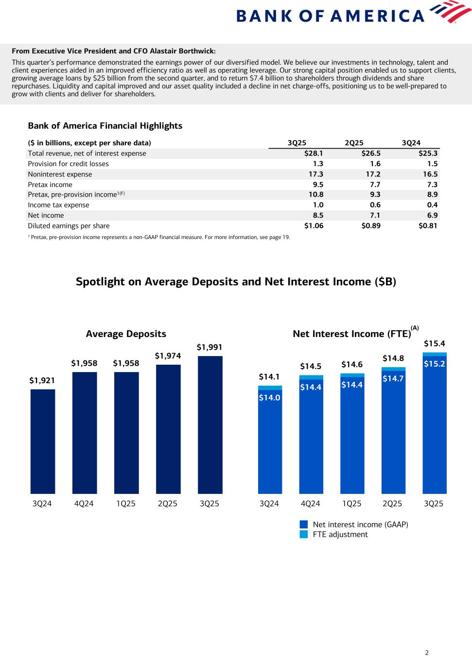 2 From Executive Vice President and CFO Alastair Borthwick: This quarter’s performance demonstrated the earnings power of our diversified model. We believe our investments in technology, talent and client experiences aided in an improved efficiency ratio as well as operating leverage. Our strong capital position enabled us to support clients, growing average loans by $25 billion from the second quarter, and to return $7.4 billion to shareholders through dividends and share repurchases. Liquidity and capital improved and our asset quality included a decline in net charge-offs, positioning us to be well-prepared to grow with clients and deliver for shareholders. Bank of America Financial Highlights ($ in billions, except per share data) 3Q25 2Q25 3Q24 Total revenue, net of interest expense $28.1 $26.5 $25.3 Provision for credit losses 1.3 1.6 1.5 Noninterest expense 17.3 17.2 16.5 Pretax income 9.5 7.7 7.3 Pretax, pre-provision income1(F) 10.8 9.3 8.9 Income tax expense 1.0 0.6 0.4 Net income 8.5 7.1 6.9 Diluted earnings per share $1.06 $0.89 $0.81 1 Pretax, pre-provision income represents a non-GAAP financial measure. For more information, see page 19. Net Interest Income (FTE) $14.1 $14.5 $14.6 $14.8 $15.4 $14.0 $14.4 $14.4 $14.7 $15.2 Net interest income (GAAP) FTE adjustment 3Q24 4Q24 1Q25 2Q25 3Q25 Average Deposits $1,921 $1,958 $1,958 $1,974 $1,991 3Q24 4Q24 1Q25 2Q25 3Q25 Spotlight on Average Deposits and Net Interest Income ($B) (A)