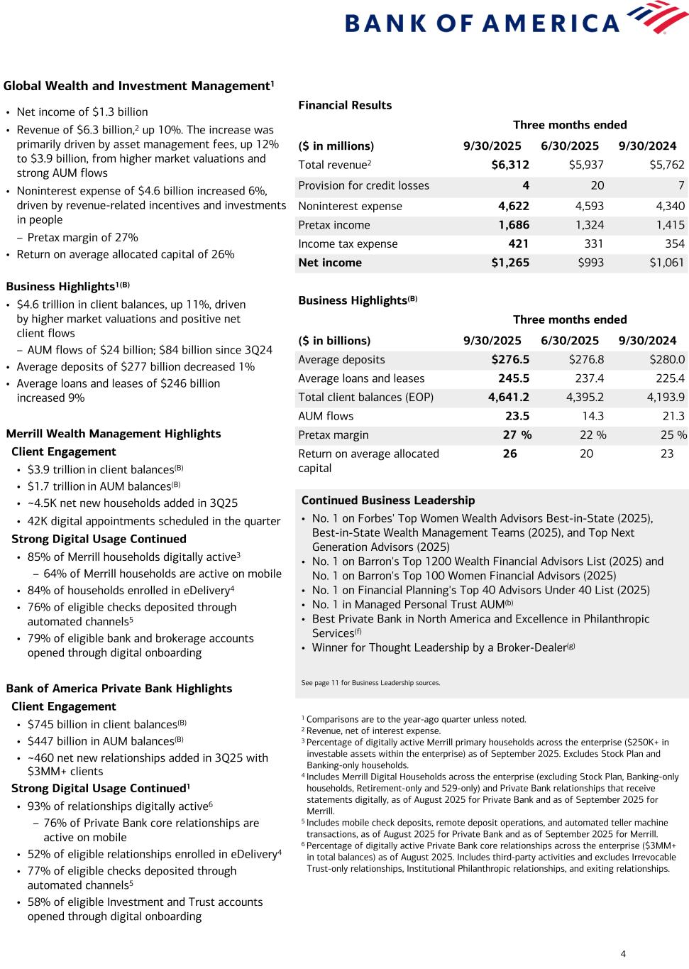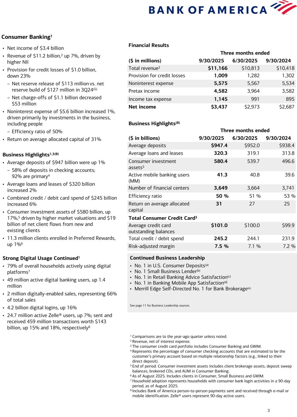 3 Consumer Banking1 Financial Results Three months ended ($ in millions) 9/30/2025 6/30/2025 9/30/2024 Total revenue2 $11,166 $10,813 $10,418 Provision for credit losses 1,009 1,282 1,302 Noninterest expense 5,575 5,567 5,534 Pretax income 4,582 3,964 3,582 Income tax expense 1,145 991 895 Net income $3,437 $2,973 $2,687 Business Highlights(B) Three months ended ($ in billions) 9/30/2025 6/30/2025 9/30/2024 Average deposits $947.4 $952.0 $938.4 Average loans and leases 320.3 319.1 313.8 Consumer investment assets5 580.4 539.7 496.6 Active mobile banking users (MM) 41.3 40.8 39.6 Number of financial centers 3,649 3,664 3,741 Efficiency ratio 50 % 51 % 53 % Return on average allocated capital 31 27 25 Total Consumer Credit Card3 Average credit card outstanding balances $101.0 $100.0 $99.9 Total credit / debit spend 245.2 244.1 231.9 Risk-adjusted margin 7.5 % 7.1 % 7.2 % Continued Business Leadership • No. 1 in U.S. Consumer Deposits(a) • No. 1 Small Business Lender(b) • No. 1 in Retail Banking Advice Satisfaction(c) • No. 1 in Banking Mobile App Satisfaction(d) • Merrill Edge Self-Directed No. 1 for Bank Brokerage(e) See page 11 for Business Leadership sources. 1 Comparisons are to the year-ago quarter unless noted. 2 Revenue, net of interest expense. 3 The consumer credit card portfolio includes Consumer Banking and GWIM. 4 Represents the percentage of consumer checking accounts that are estimated to be the customer’s primary account based on multiple relationship factors (e.g., linked to their direct deposit). 5 End of period. Consumer investment assets includes client brokerage assets, deposit sweep balances, brokered CDs, and AUM in Consumer Banking. 6 As of August 2025. Includes clients in Consumer, Small Business and GWIM. 7 Household adoption represents households with consumer bank login activities in a 90-day period, as of August 2025. 8 Includes Bank of America person-to-person payments sent and received through e-mail or mobile identification. Zelle® users represent 90-day active users. • Net income of $3.4 billion • Revenue of $11.2 billion,2 up 7%, driven by higher NII • Provision for credit losses of $1.0 billion, down 23% – Net reserve release of $113 million vs. net reserve build of $127 million in 3Q24(G) – Net charge-offs of $1.1 billion decreased $53 million • Noninterest expense of $5.6 billion increased 1%, driven primarily by investments in the business, including people – Efficiency ratio of 50% • Return on average allocated capital of 31% Business Highlights1,3(B) • Average deposits of $947 billion were up 1% – 58% of deposits in checking accounts; 92% are primary4 • Average loans and leases of $320 billion increased 2% • Combined credit / debit card spend of $245 billion increased 6% • Consumer investment assets of $580 billion, up 17%,5 driven by higher market valuations and $19 billion of net client flows from new and existing clients • 11.3 million clients enrolled in Preferred Rewards, up 1%6 Strong Digital Usage Continued1 • 79% of overall households actively using digital platforms7 • 49 million active digital banking users, up 1.4 million • 2 million digitally-enabled sales, representing 66% of total sales • 4.2 billion digital logins, up 16% • 24.7 million active Zelle® users, up 7%; sent and received 459 million transactions worth $143 billion, up 15% and 18%, respectively8